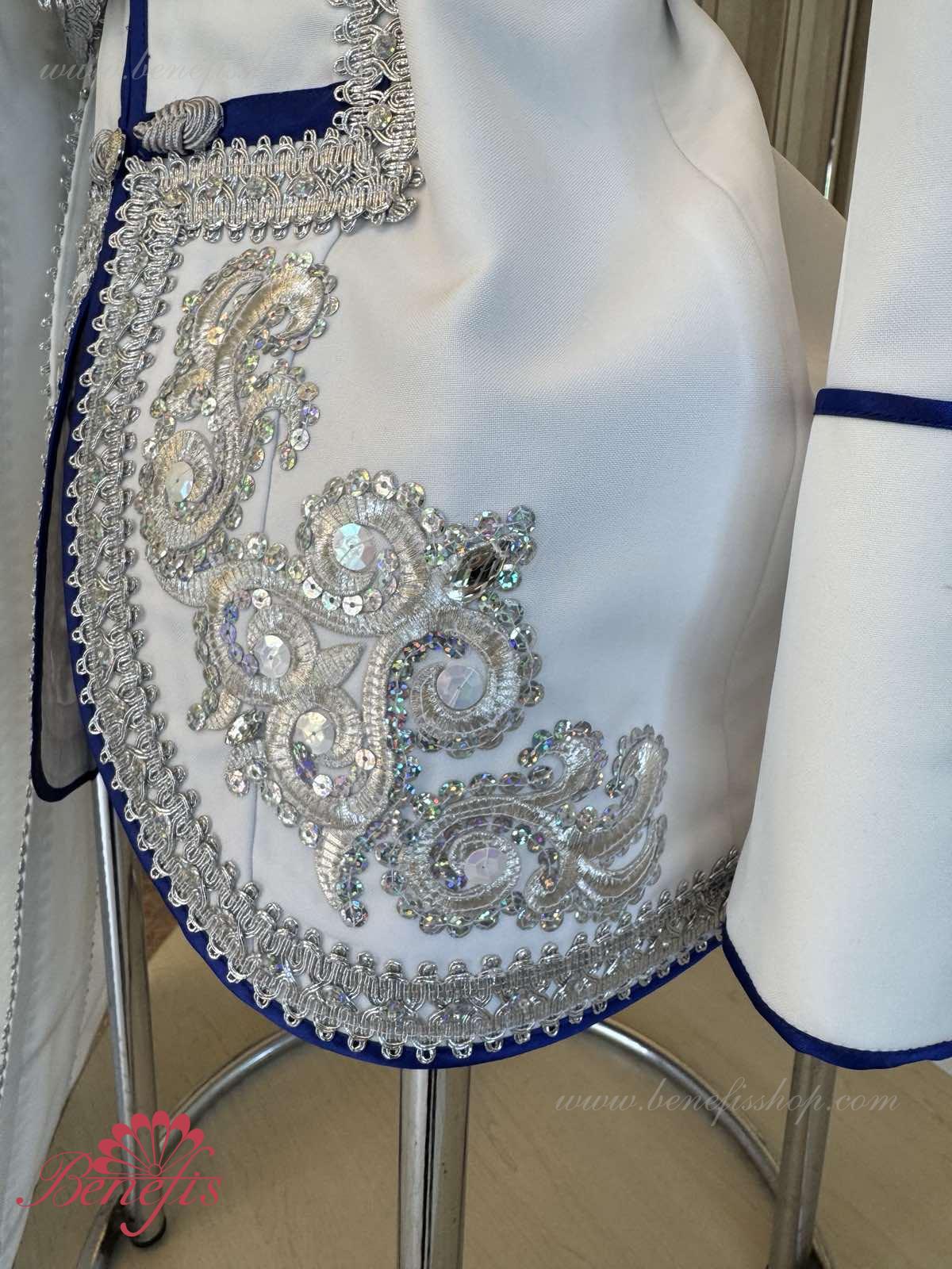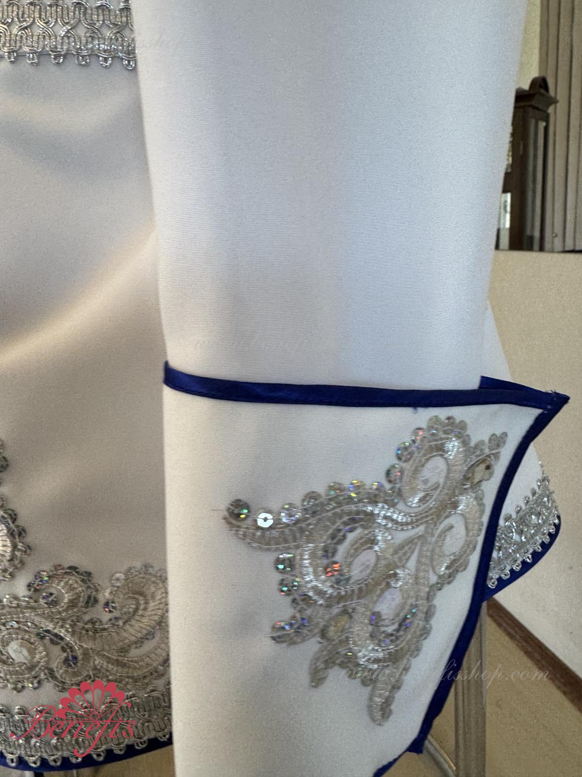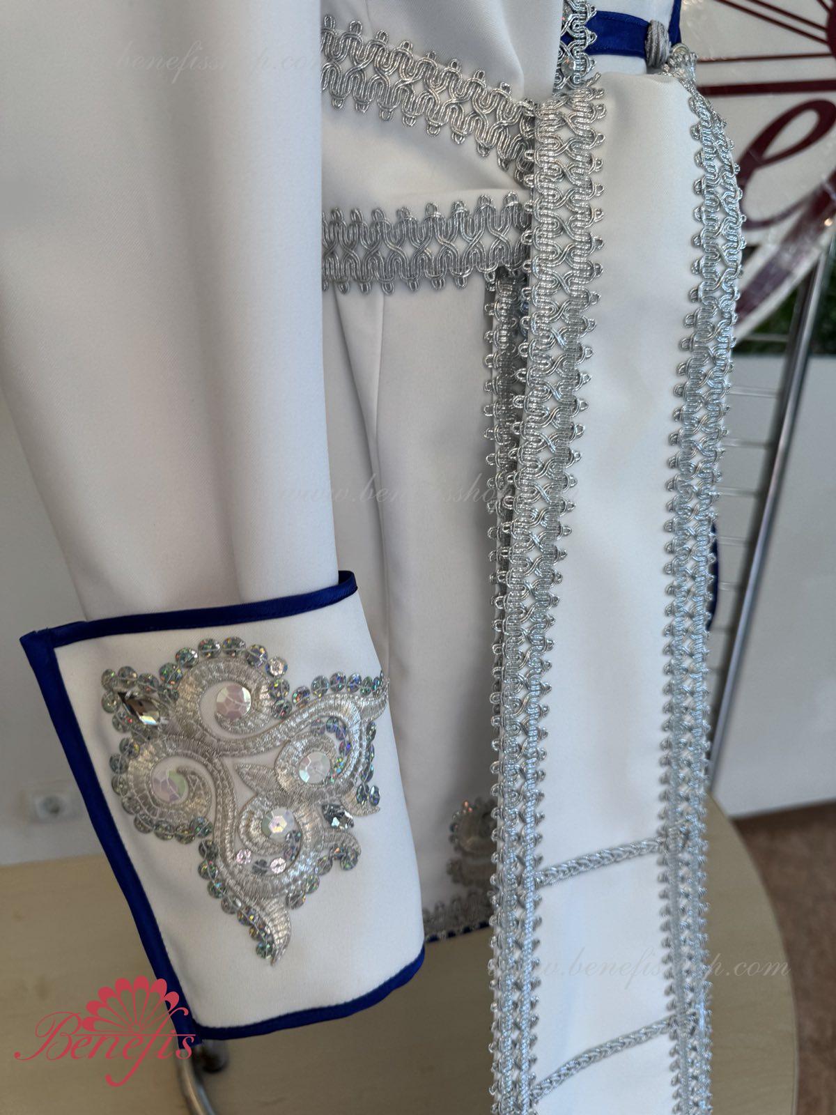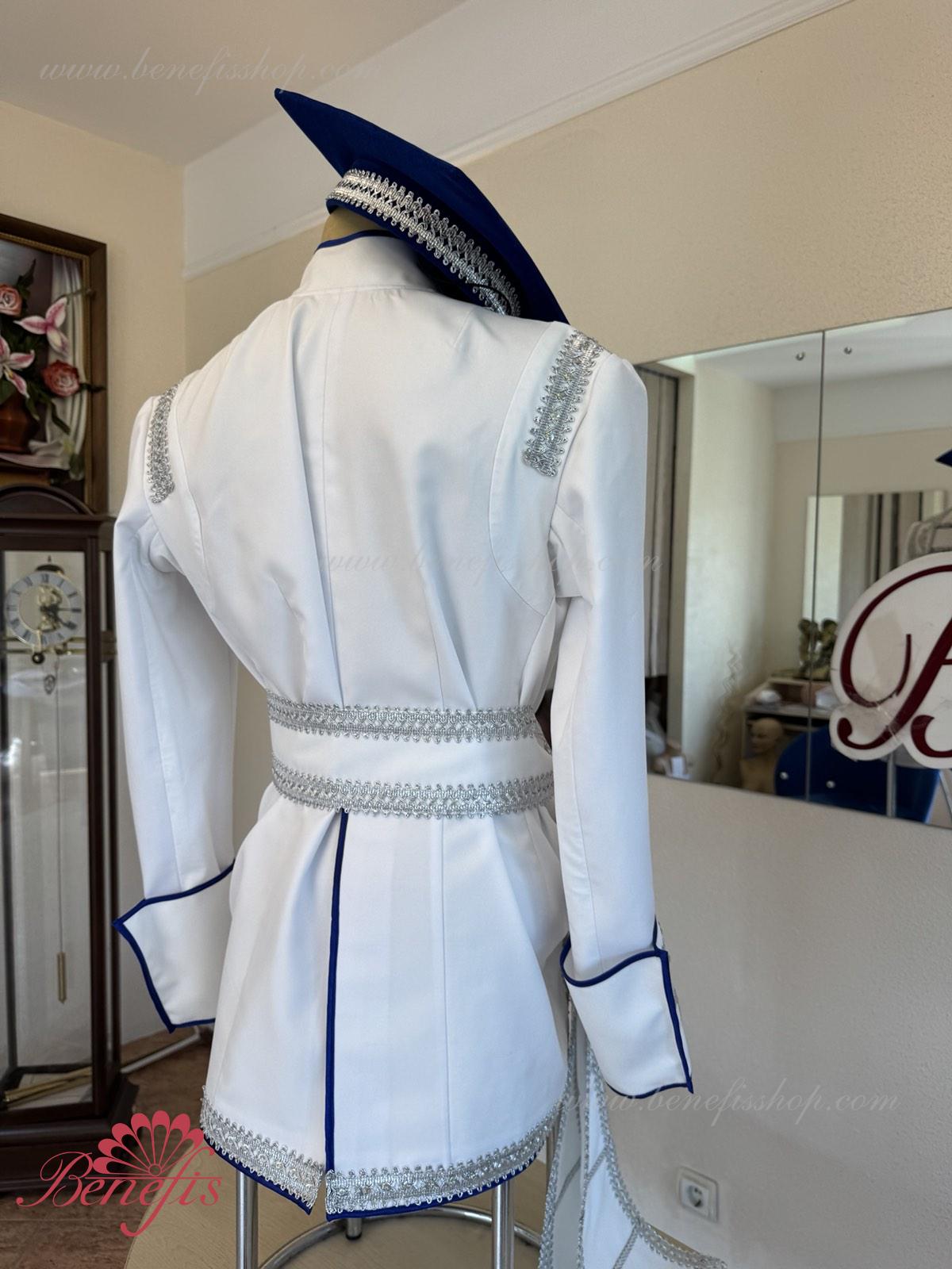 Gulerul si mansetele decorate, precum si centura lunga ofera costumului un aspect de gala.