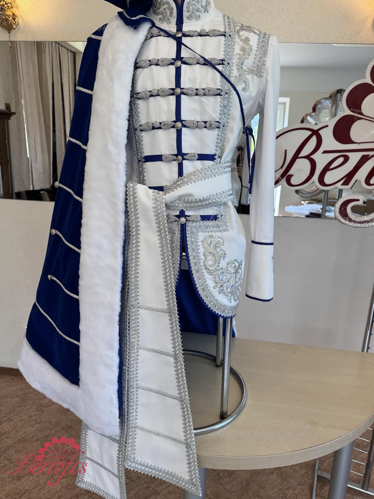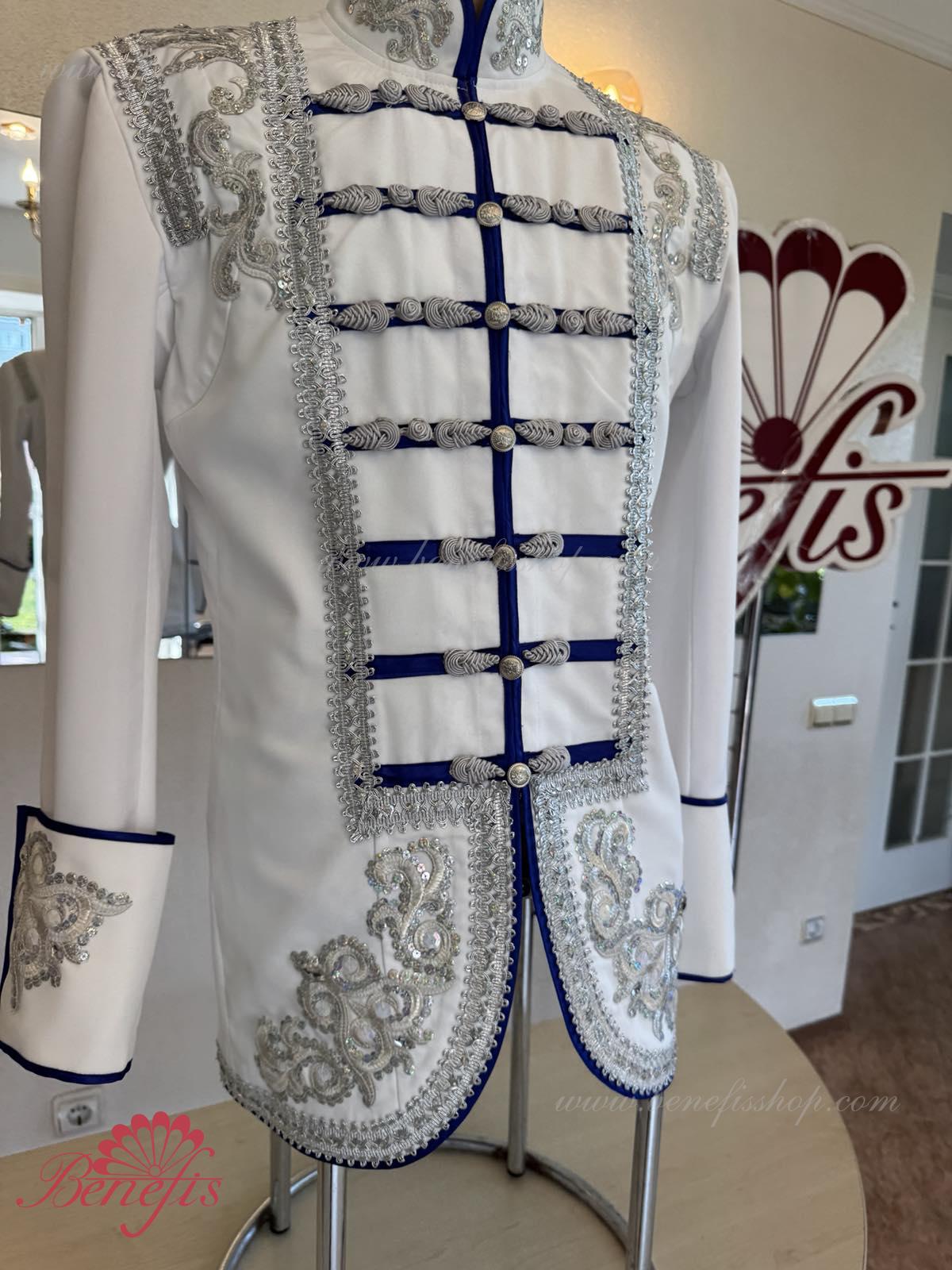 Costumul este fabricat dintr-o tesatura densa si se incheie pe nasturi din fata.