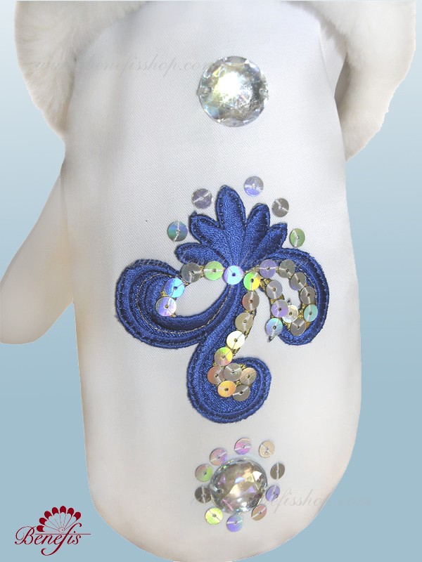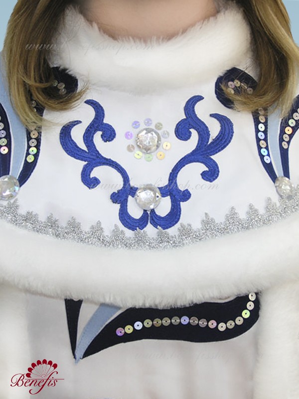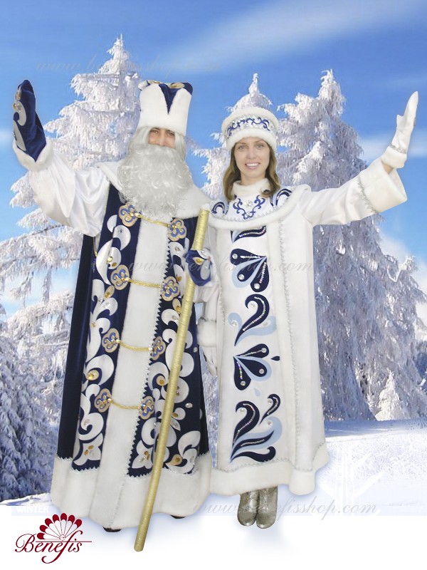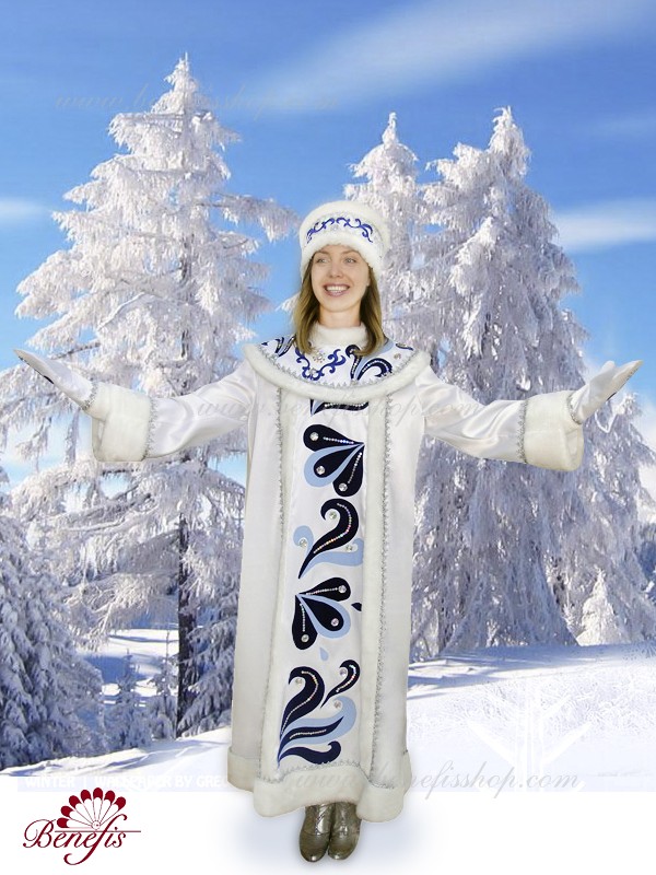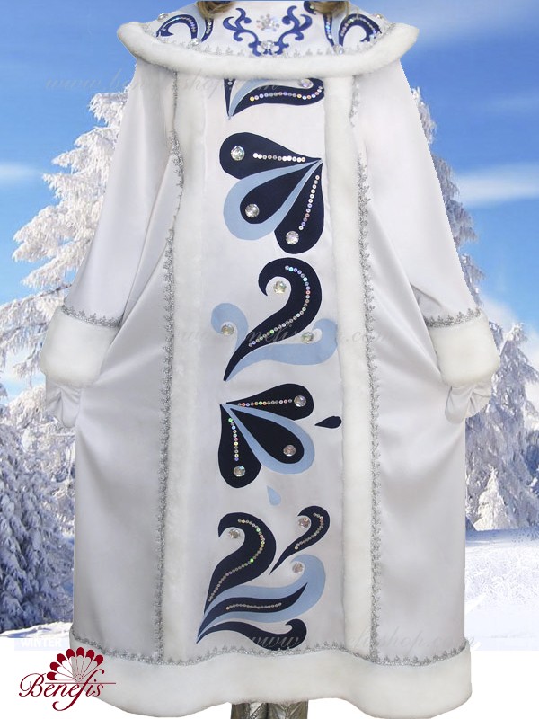 Costumul este fabricat dintr-o tesatura densa si este decorat cu pietre, paiete, aplicatiile, blana artificiala si panglica argintie. Roba se închide în spate cu Velcro, iar pelerina cu cârlige. Costumul Albei ca zapada R 0151 se potriveste bine cu costumul lui Mos Craciun R 0150.