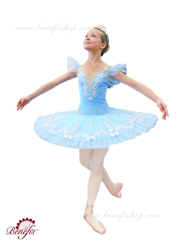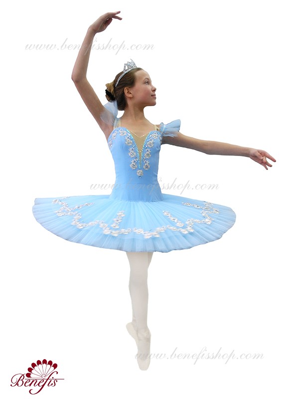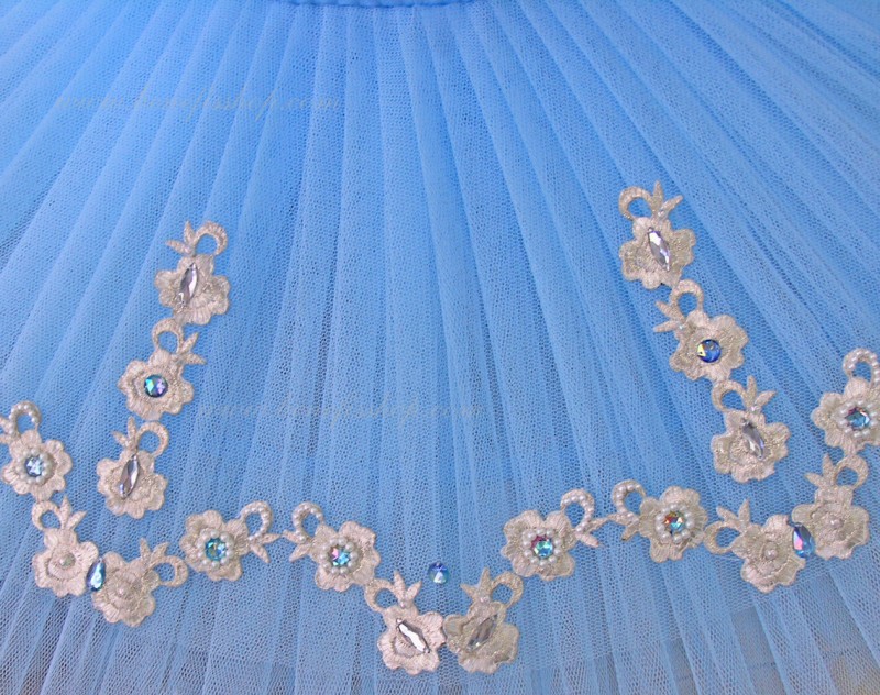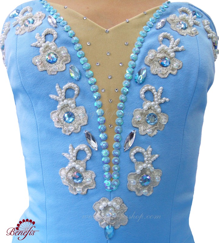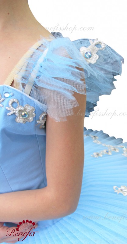 Costum dat este fabricat în baza de model T 0005 cu corsetul elastic şi fusta de balet cu cercuri. Intregul costum este impodobit cu perle, applicaţii de argint şi straze. Pe piept este insertie de culoarea pielii cu cristale irizate. Chingele sunt de culoare pielii, minecute cad mai jos de umar. Costumul poate fi utulizat în variaţii de concert din diferite balete.