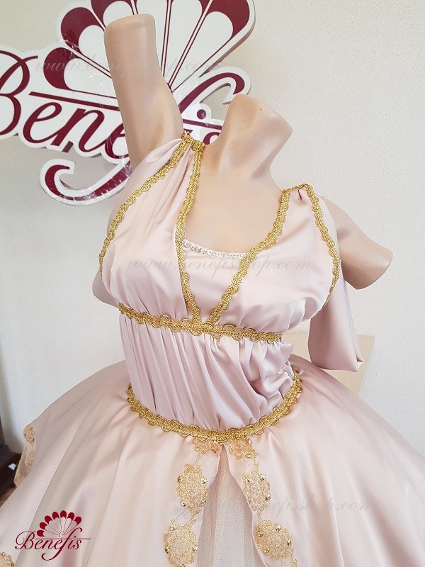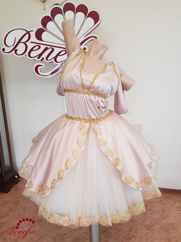 Acest costum de scenă profesional este realizat pe baza unui fuste de bază profesionale # T 0003 (vezi secțiunea "Fuste de bază"). Corsetul, cu bretele elastice si insertie corporala pe piept, este confectionat din tesatura densa semi-elastica.