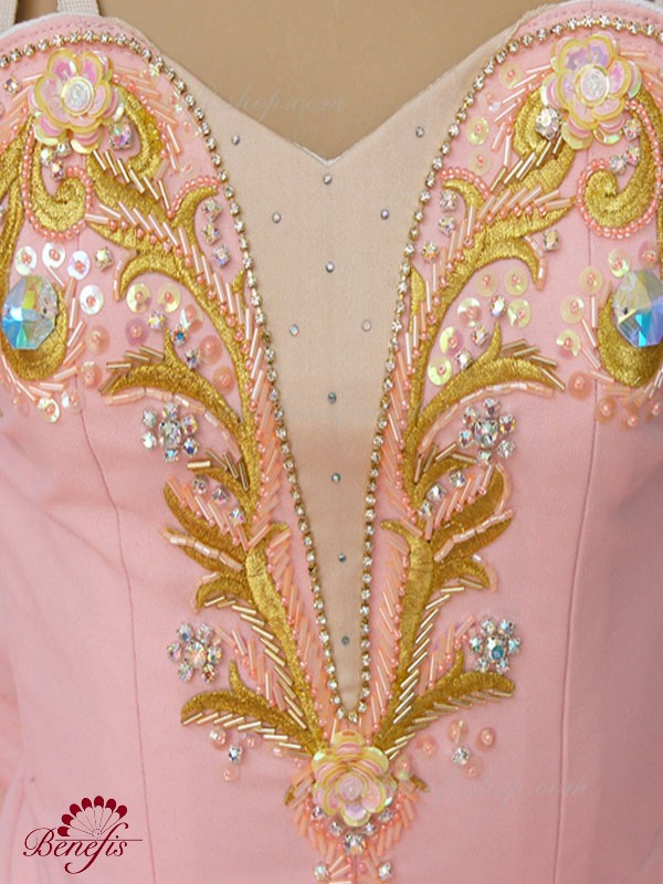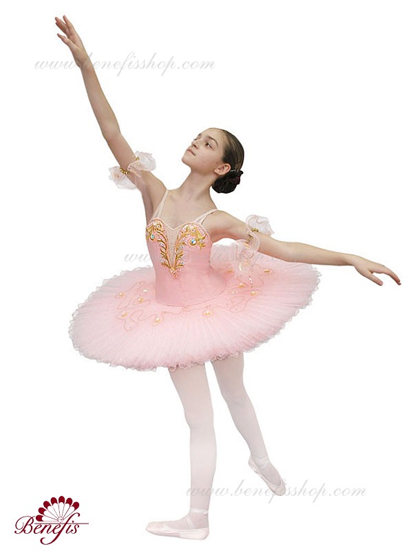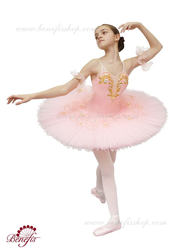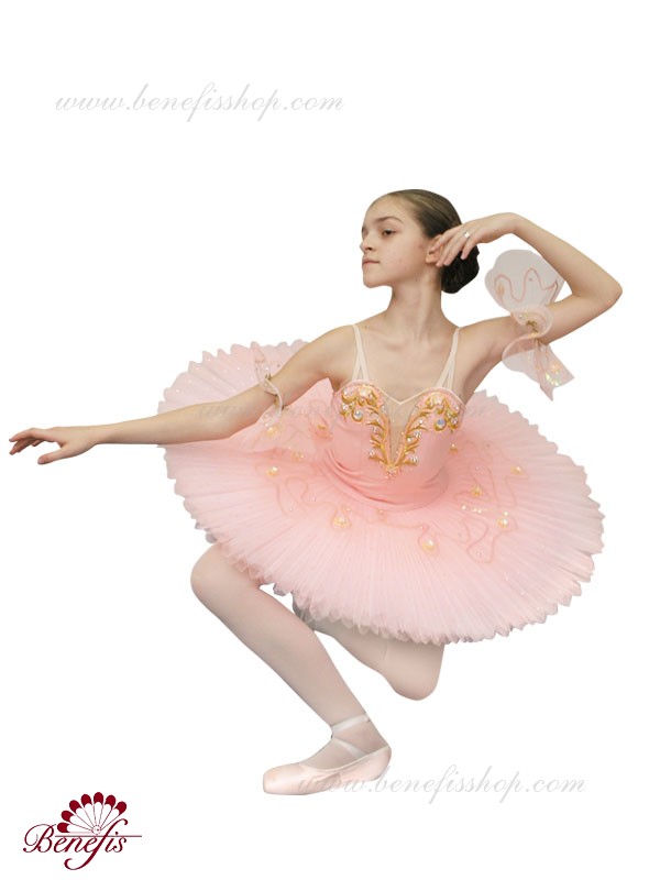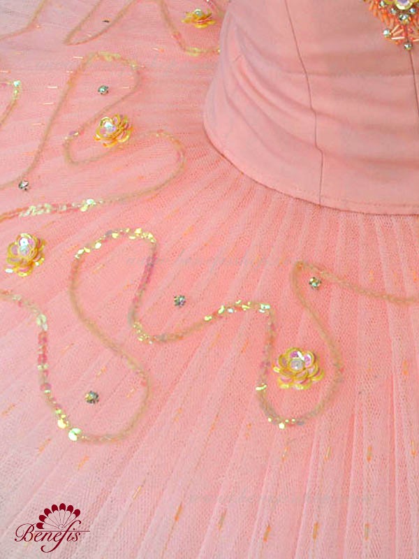 Costum de scena profesionist. Este confectionat in baza fustei de balet profesioniste #T0001B (vezi compartimentul „Fuste de balet de baza”). Corsetul este facut dintr-o tesatura deasa semi-stretch. Pe piept se intrevede o insertie dintr-o tesatura de tip plasa de culoarea pielii. Chingele sunt de culoarea pielii. Pe corset sunt prezente doua rinduri de cirlige pentru regularea comoda. Pentru acest costum se folosesc tesaturi de culori gingase. Culorea decorului este similara culorii costumului. In calitate de decor sunt utilizate panglici aurii sau argintii, paiete, strase si margele marunte de sticla. Se anexeaza manicutile, decorate cu panglica aurie sau argintie. Costumul poate fi utilizat si ca costum pentru concert.