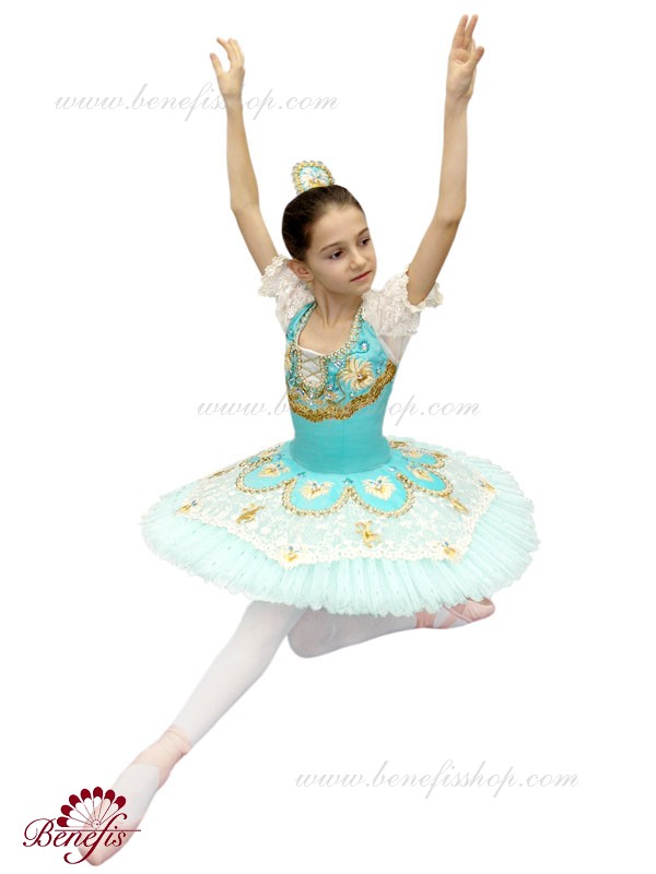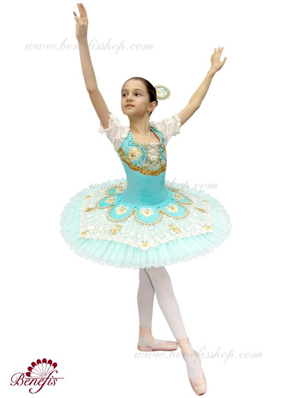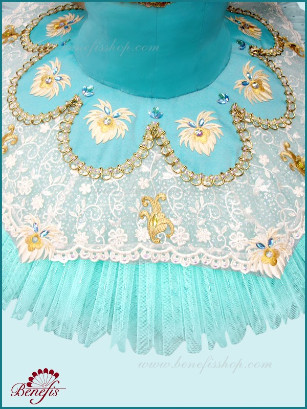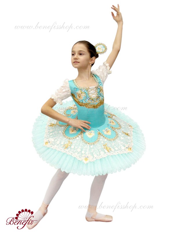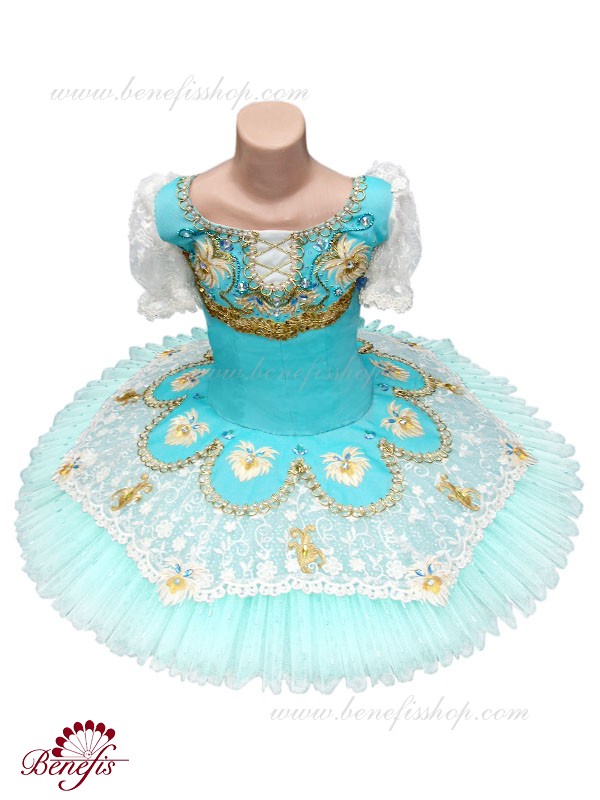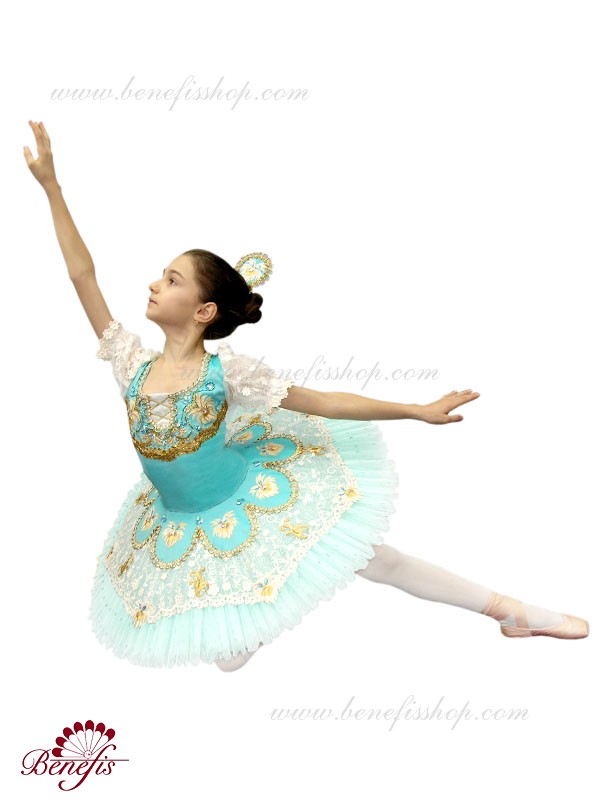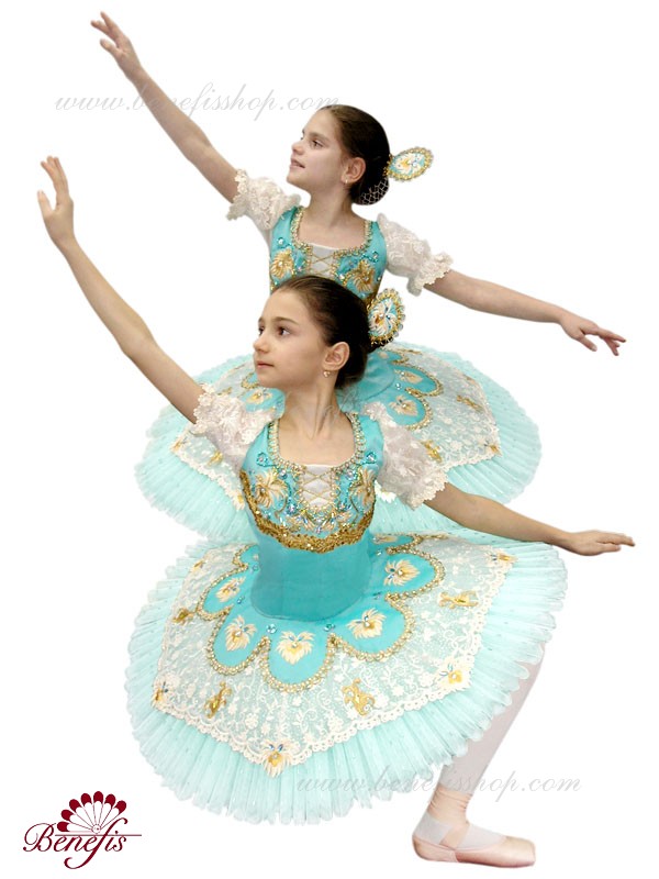 Costumul este fabricat in traditia baletului “Paquita”. Corsetul este fabricat dintr-o tesatura densa semi-stretch. Dantela in stil spaniol este prezenta pe stratul superior al fustei si pe minecute. Decorul bogat este constituit dintr-o mare cantitate de strase, margele marunte, margele marunte de sticla, applicatii, panglica si paiete; manopera exclusiva.