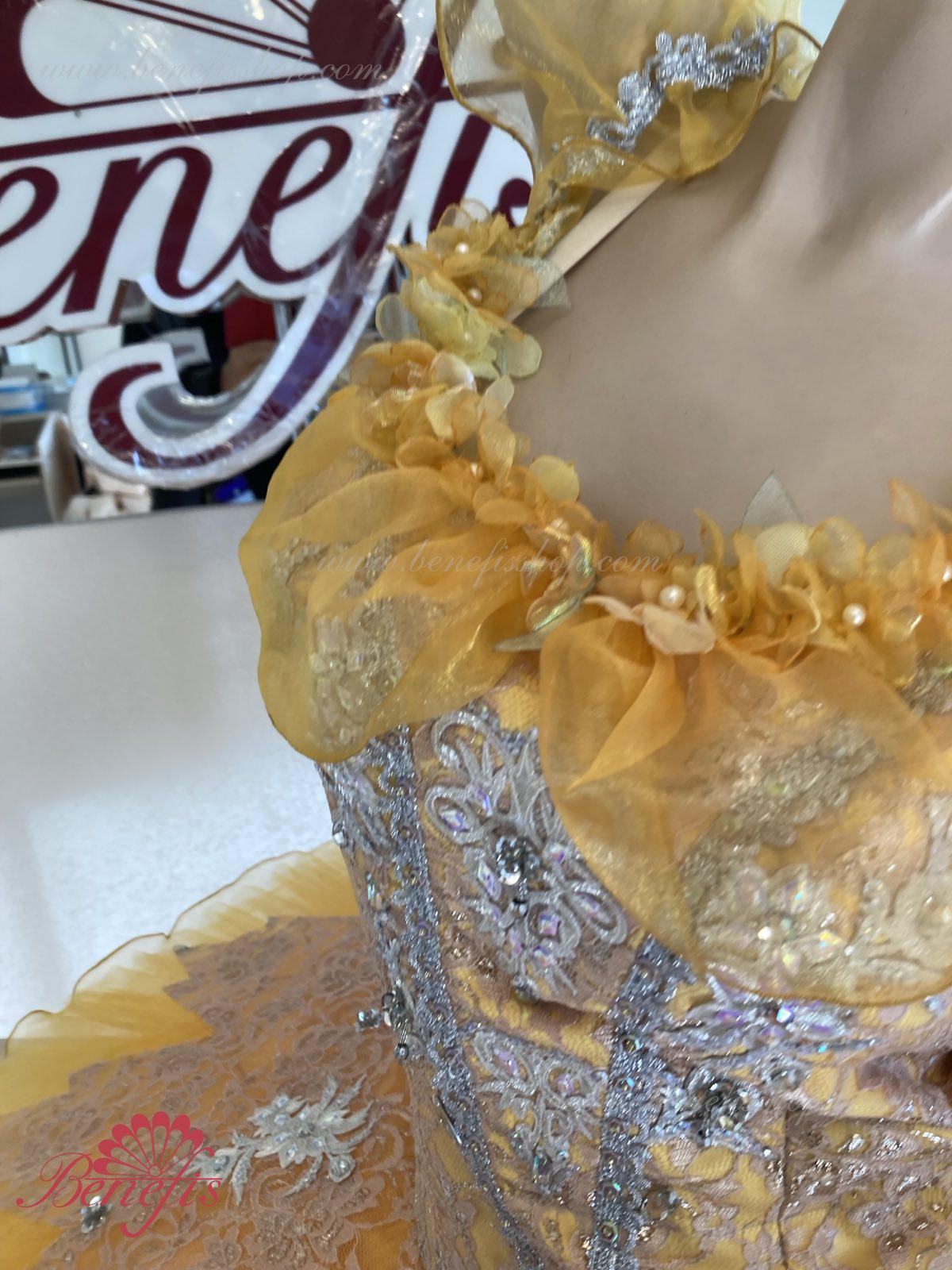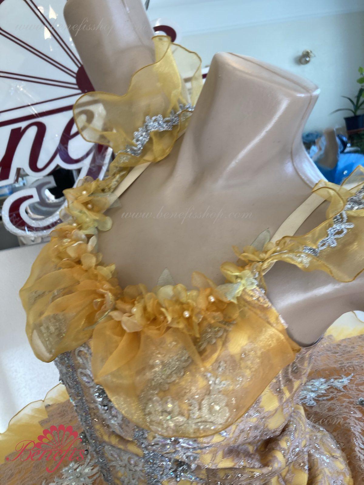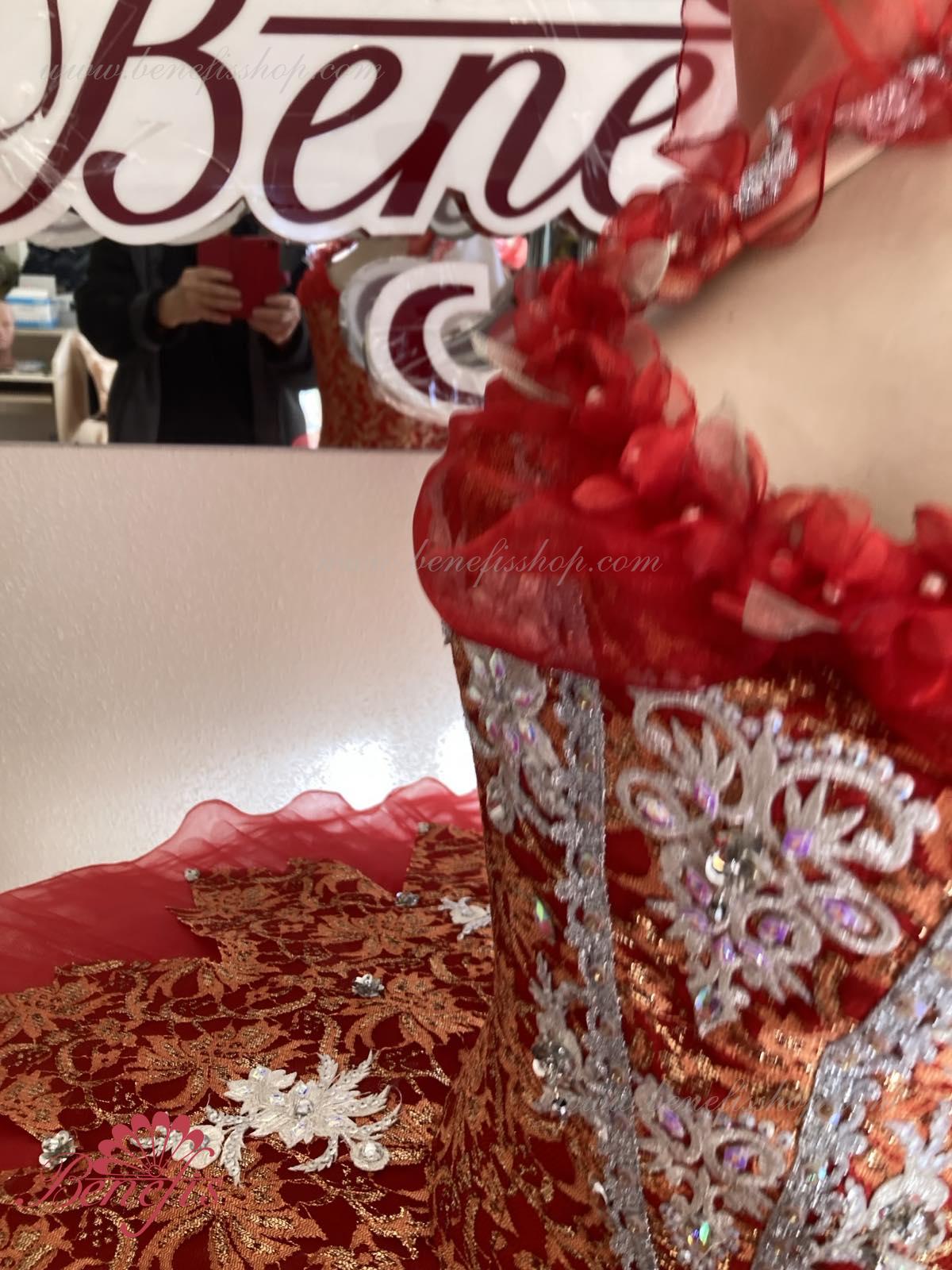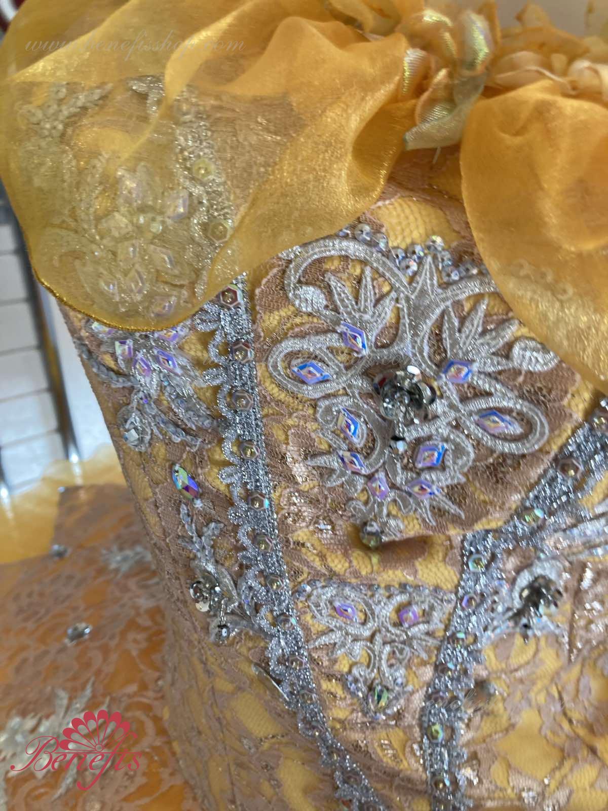 Corsetul este fixat cu cârlige în două rânduri pentru o reglare convenabilă, cordonul interior servește la strângerea corsetului în zona pieptului. Opt straturi gradate plisate de tul semi-moale-șapte lungi și unul scurt pe chiloți din tul cu un jug de 10 cm atașat la o centură elastică. Două cercuri de crinolină sunt încorporate în stratul mijlociu, cu două bibelouri scurte suplimentare la margini. Lungimea stratului superior este de 36-38 cm, fiecare strat următor este cu 4 cm mai scurt. Fusta este fixata în spate cu 6 cârlige și bucle mari. Corsetul este decorat și decorat cu margele, paiete, aplicații, flori din satin, panglică.