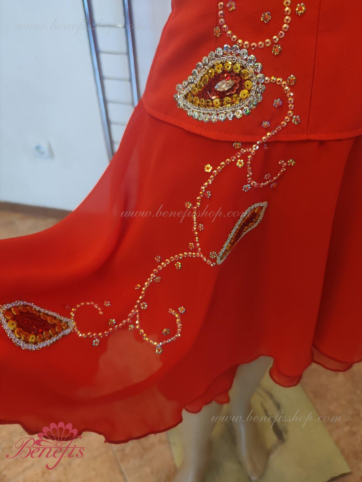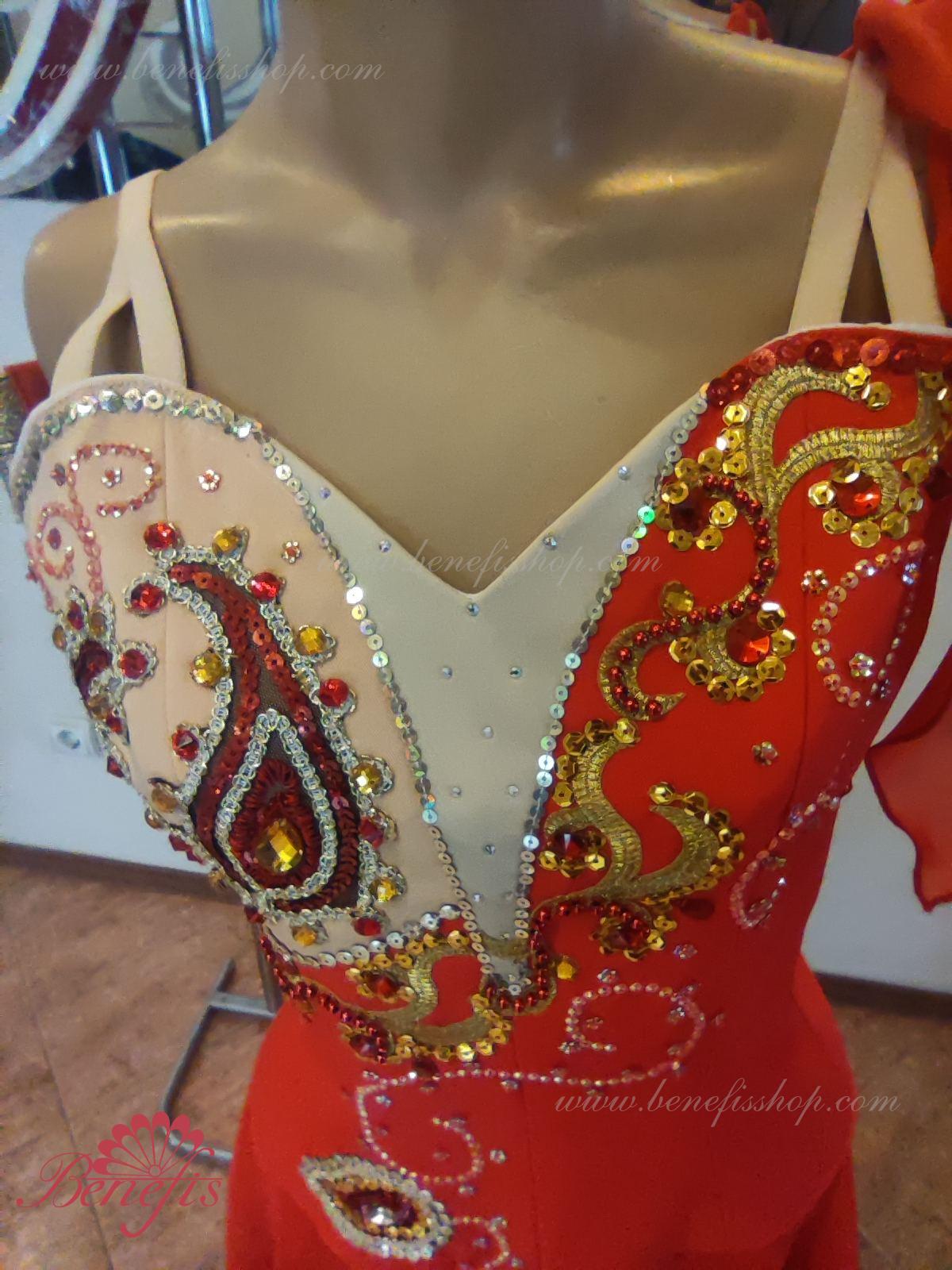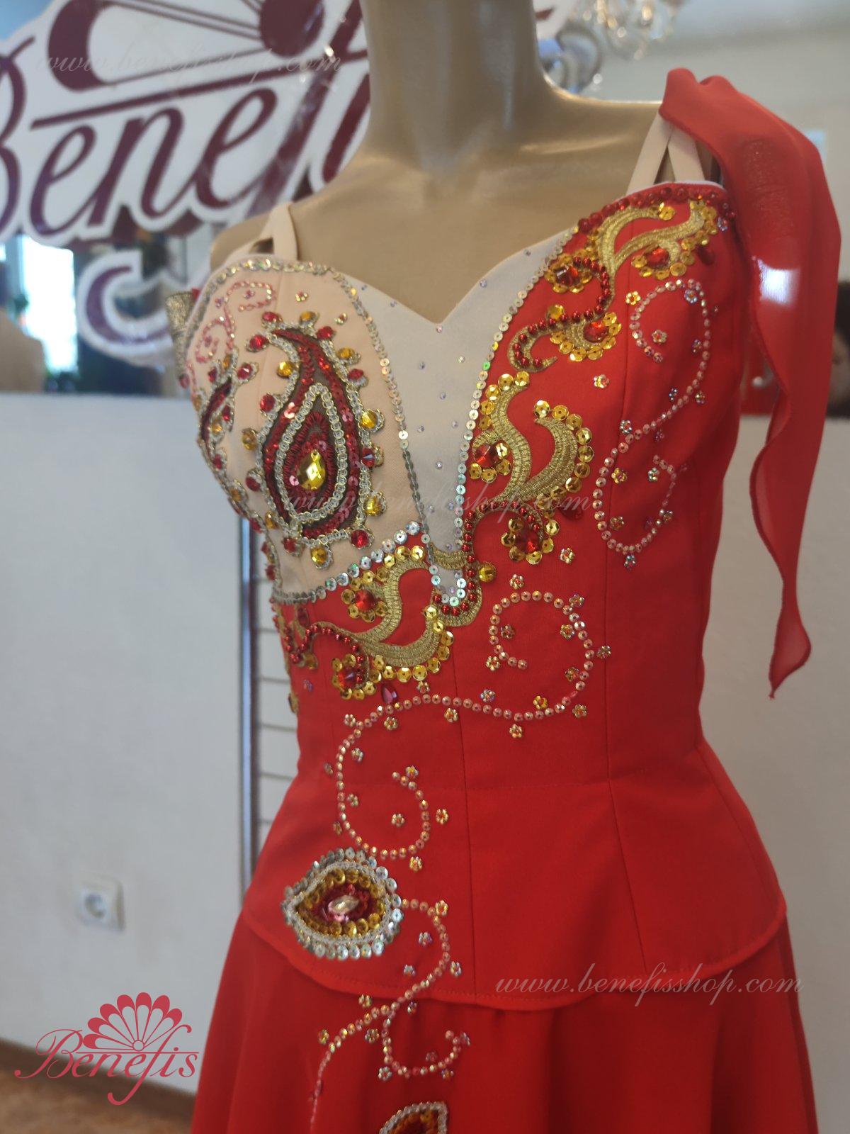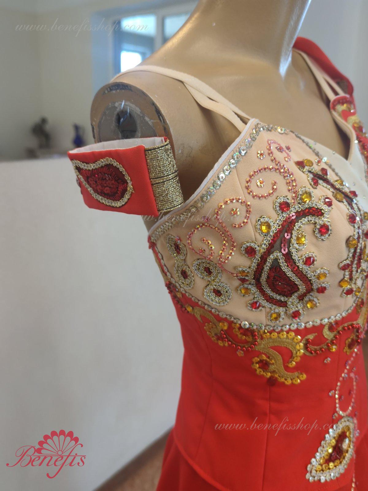 Corsetul este bogat decorat cu aplicații, decorat cu împletitură, strasuri, paiete și mărgele și fixat cu cârlige la spate. O mulțime de paiete strălucitoare sunt folosite pentru a decora fusta.