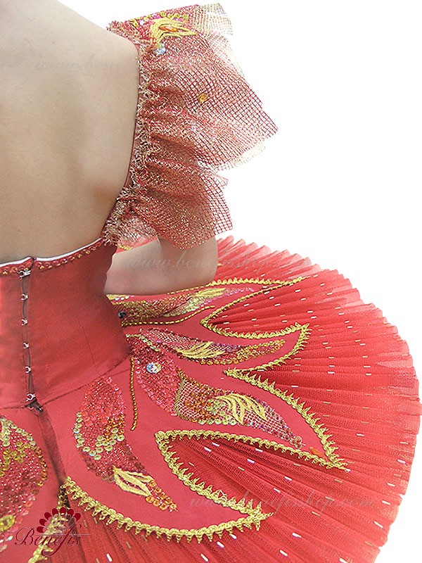 Costumul dat este executat într-un stil vechi al baletului «Pasarea Paun». Corsetul este executat din material semi – stretch şi are o culoare aprinsă. Tutu este decorată cu aplicaţii în forma flacării şi este brodată cu strase şi paiete. Este mult lucru manual. Întreg costumul este brodat cu strazele, paietele si biser după culoarea costumului.
