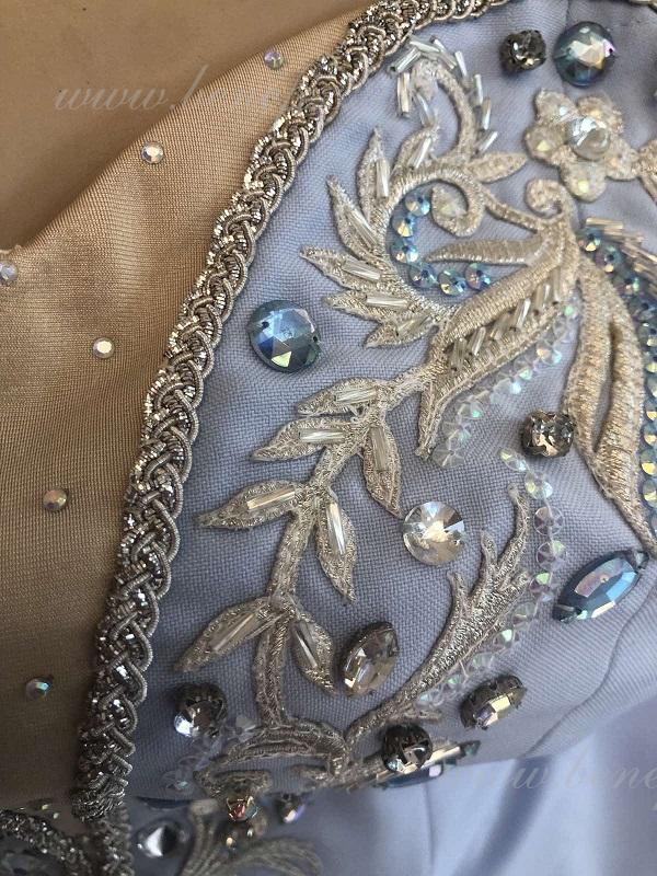 Decorul într-un stil restrâns este realizat în combinație cu tonul costumului. Au fost utilizate un număr mare de aplicații, împletituri, strasuri mari și mici, paiete, mărgele și mărgele de sticlă.Acest costum de balet este perfect pentru spectacolul "Spărgătorul de nuci".