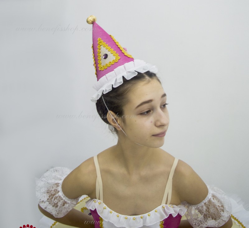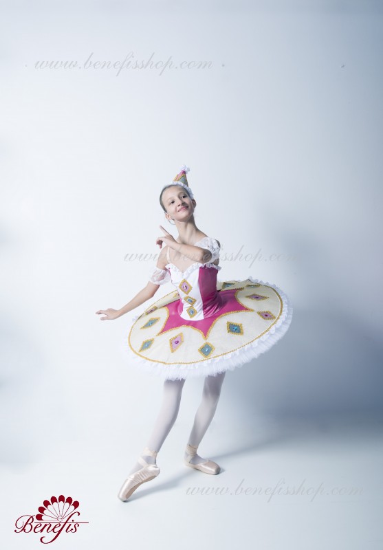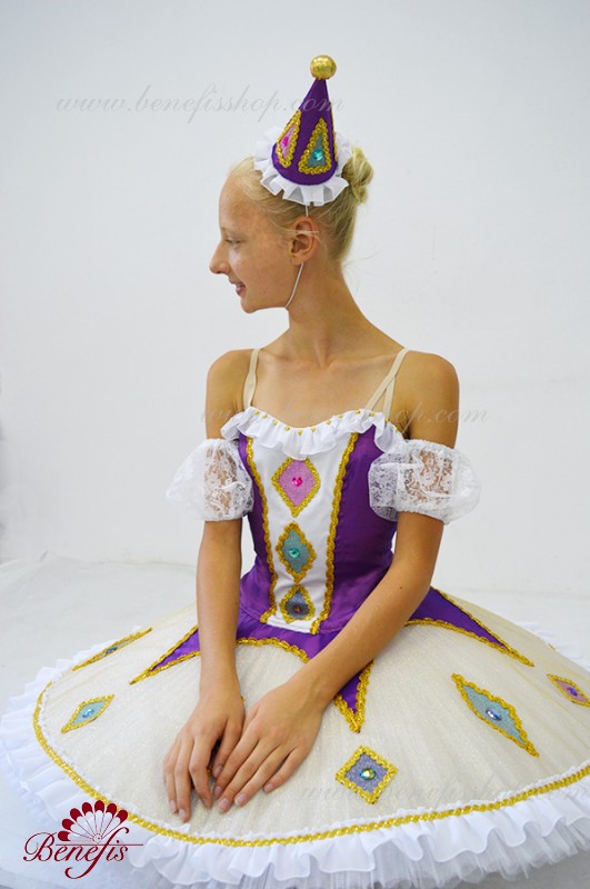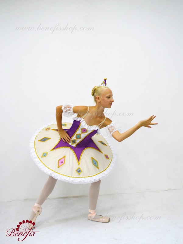Costum de scena pentru ballet executat pe baza de modelul T0002, corsetul este realizat din tesatura semi-stretch cu insertie in forma de V in fata. Corsetul se incheie pe doua rinduri de carlige, manecile sint executate din plasa cu dantela pe margini.