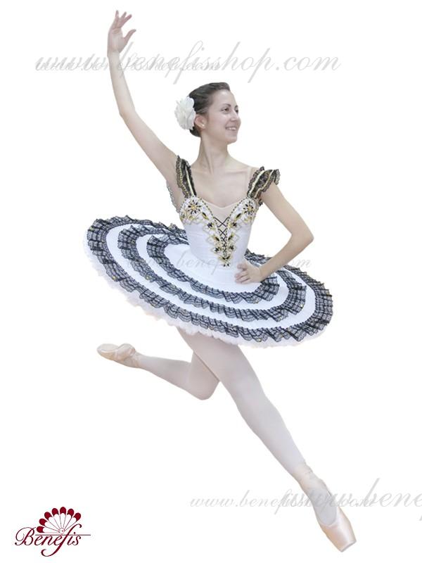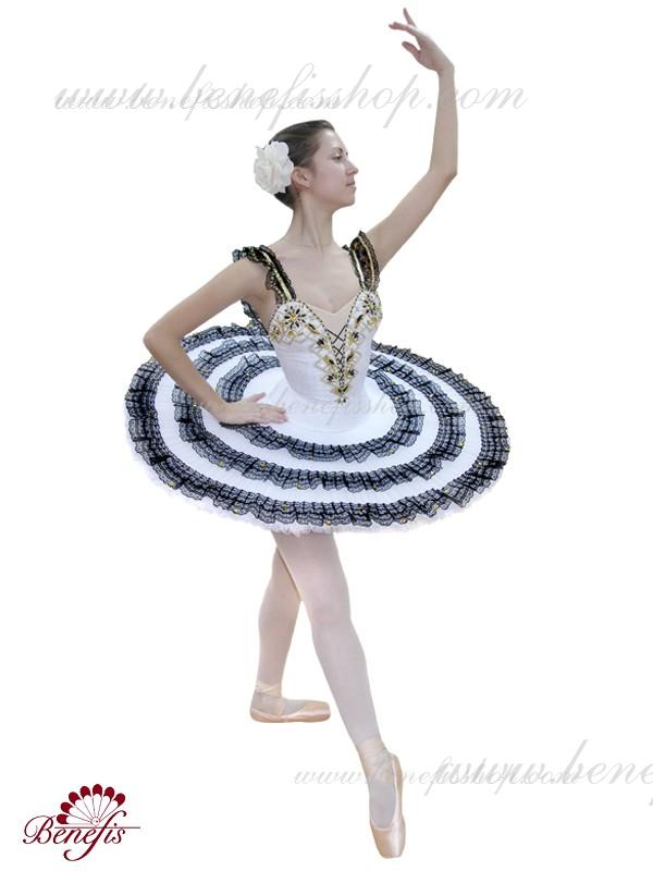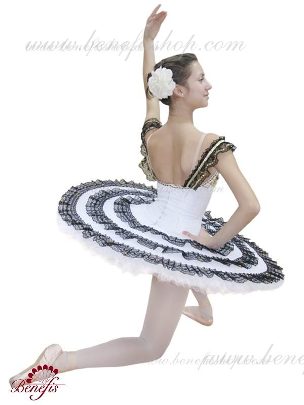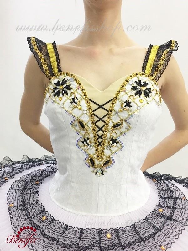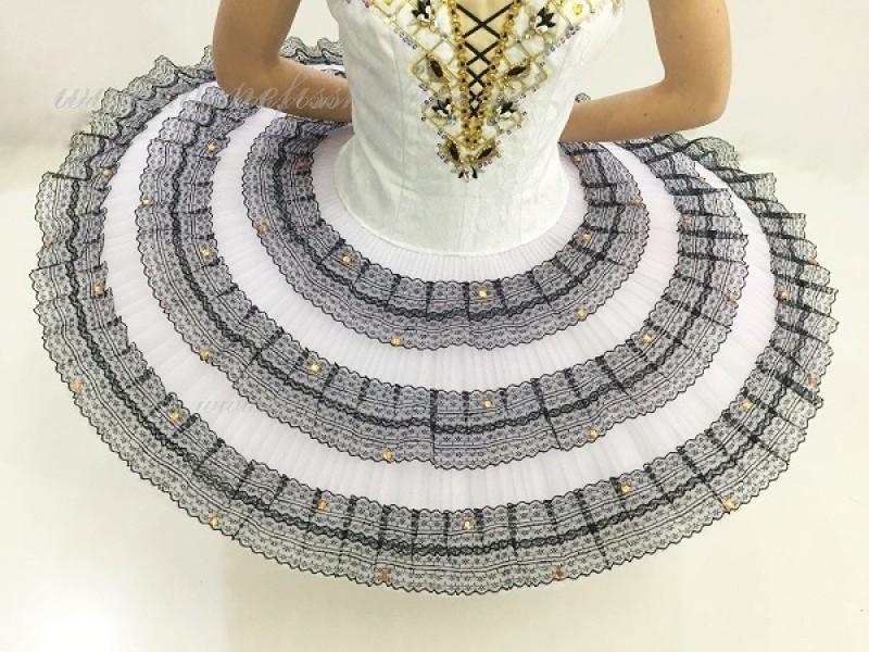 Costum de scena profesionist. Este confectionat in baza fustei de balet profesioniste #T0001B (vezi compartimentul „Fuste de balet de baza”). Corsetul este confecționat din țesătură groasă. Pe piept există o inserție de culoarea pielii. Curele de culoarea pielii.