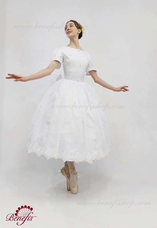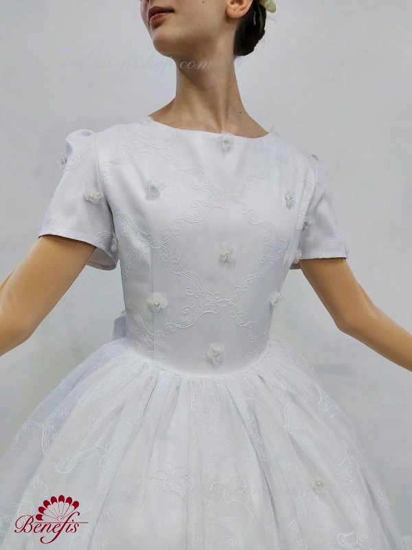 Corsetul rochiei este confectionat din tesatura densa semistretch, este rostuit bogat cu aplicatii, margele, strasuri si panglica. Fusta rochiei este cusuta din cateva straturi de tul moale si gras. Stratul de sus din tesatura usoara este impodobit cu aplicatii in forma de flori mici si este bordurat cu dantele. Din aceeasi tesatura sunt cusute si manecile. Crinolina este inclusa in costum.
