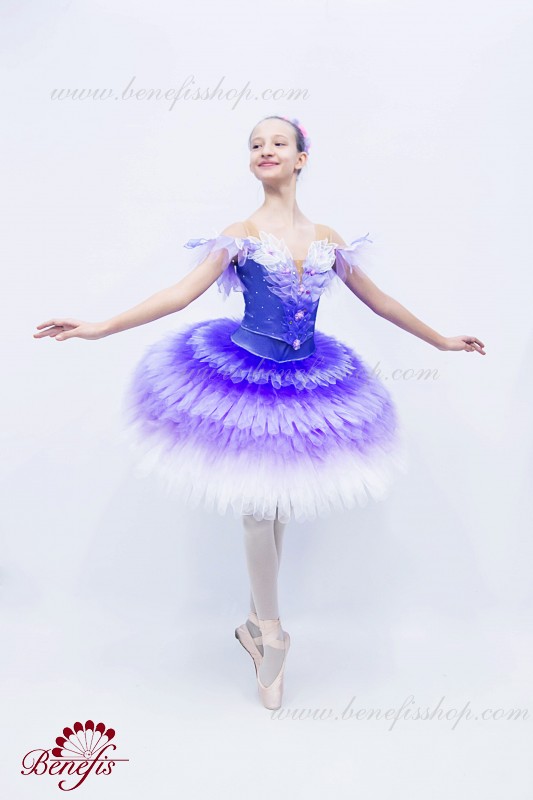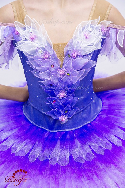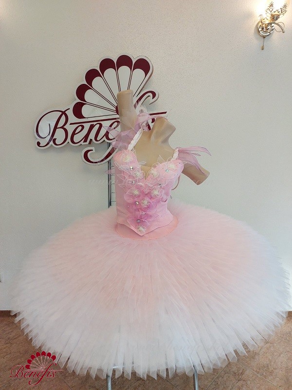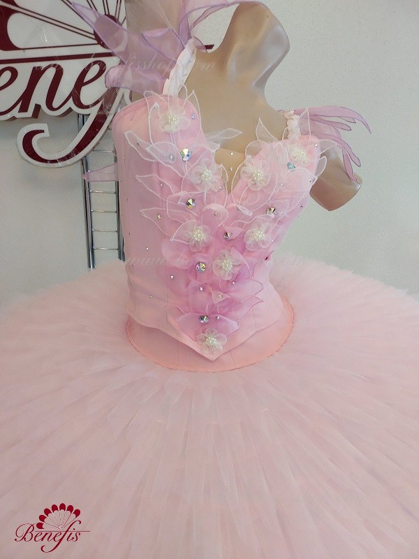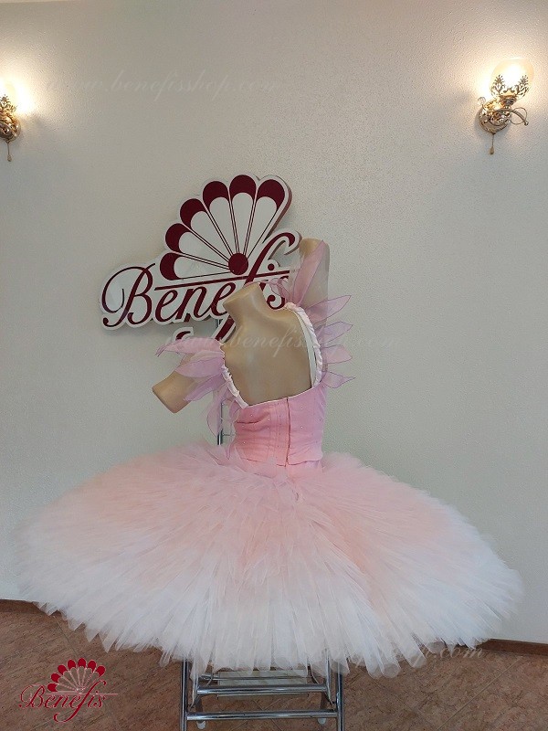 Corsetul este alcătuit din două părți care sunt unite cu benzi elastice in zona taliei. Partea inferioară este cusuta de fusta tutu . Partea superioară este suprapusă pe partea de jos, ceea ce permite ajustarea lungimii corsajului, în funcție de înălțimea balerinei, și o face mai flexibilă. Pentru ajustarea confortabilă, corsetul se incheie cu două rânduri de cârlige la spate. În zona pieptului, corsetul este reglat cu un cordon interior. Toată originalitatea costumului se datoreaza decorului, care prezinta o tranzitie de culori , si este format din tulul moale.