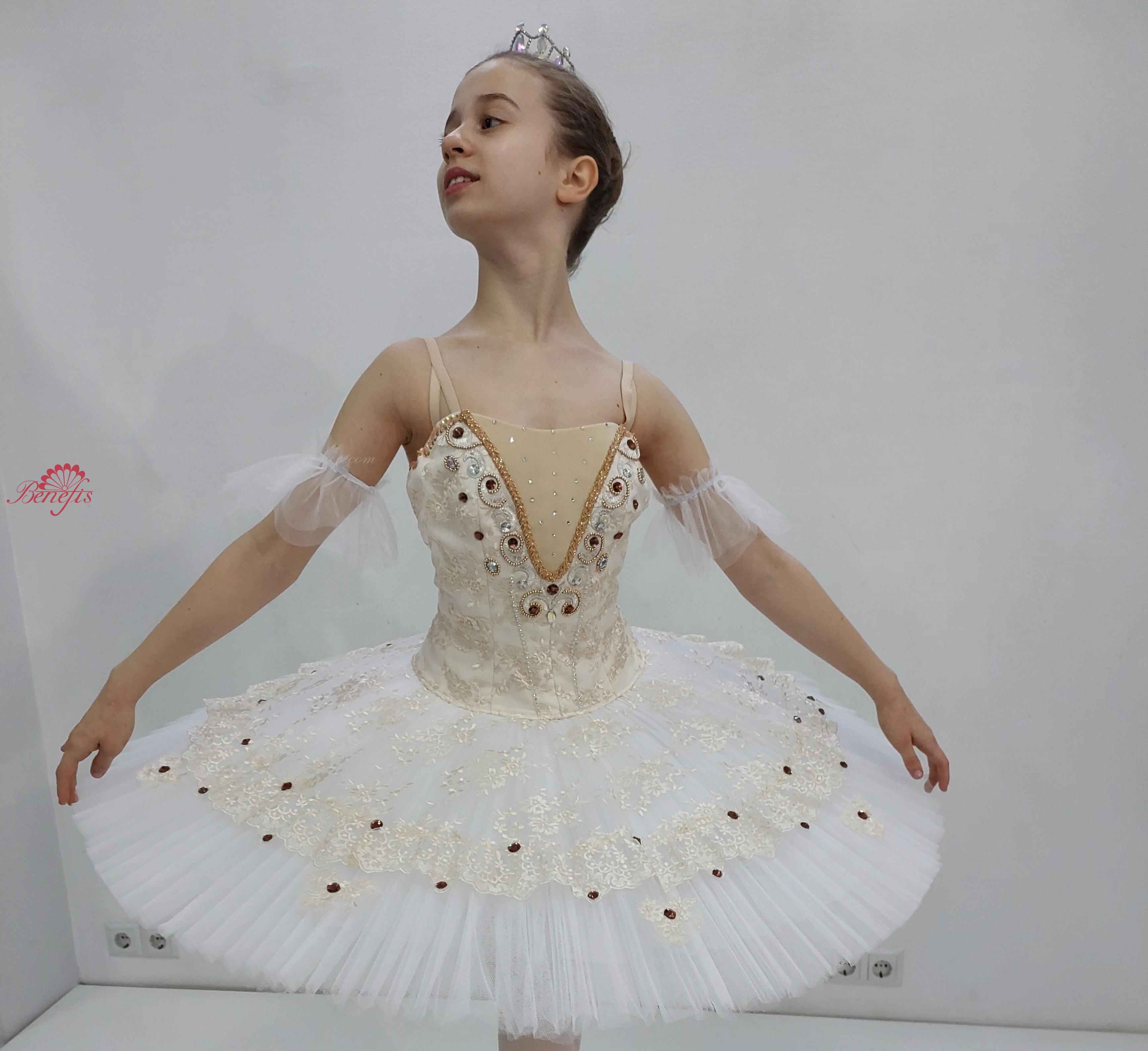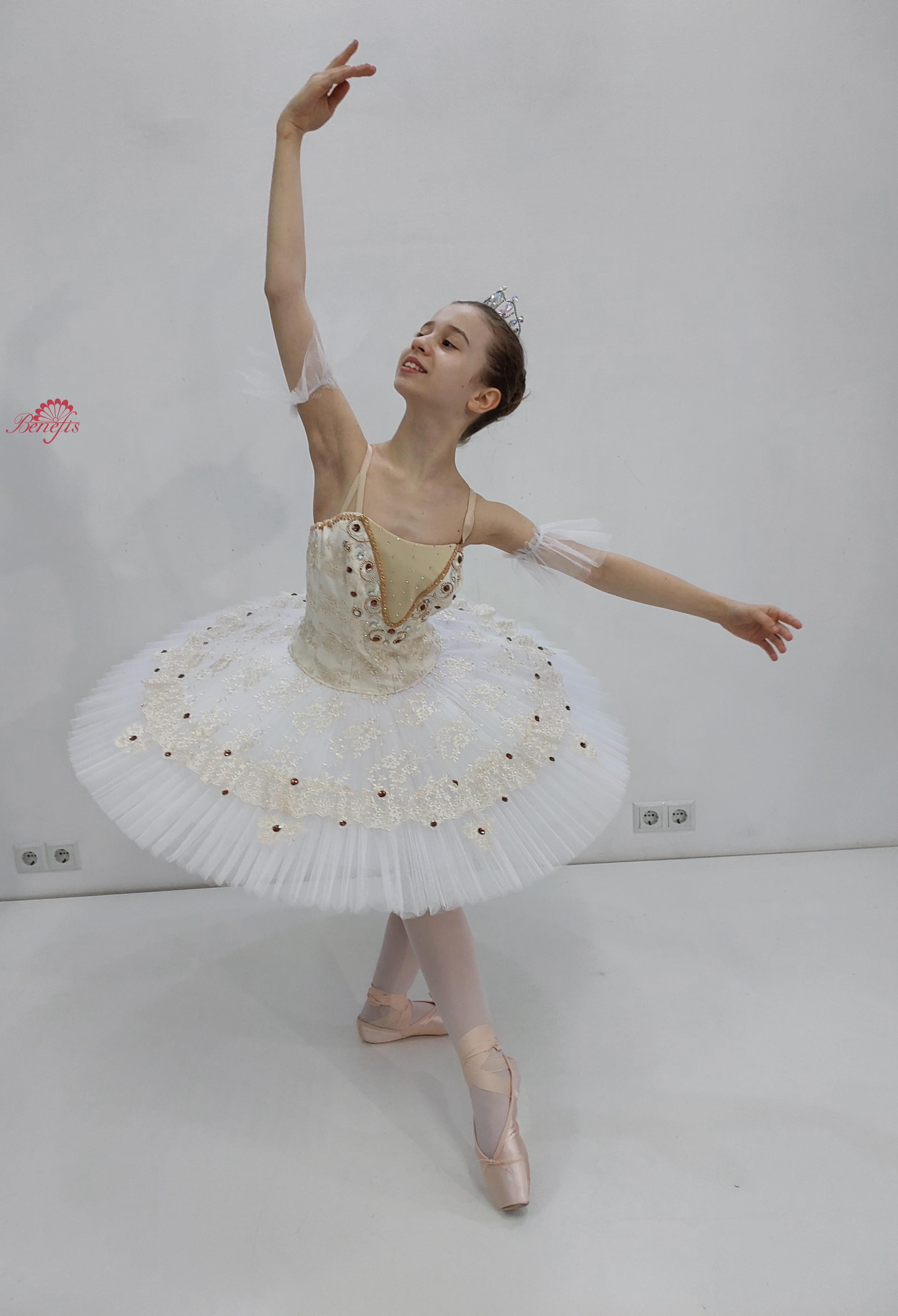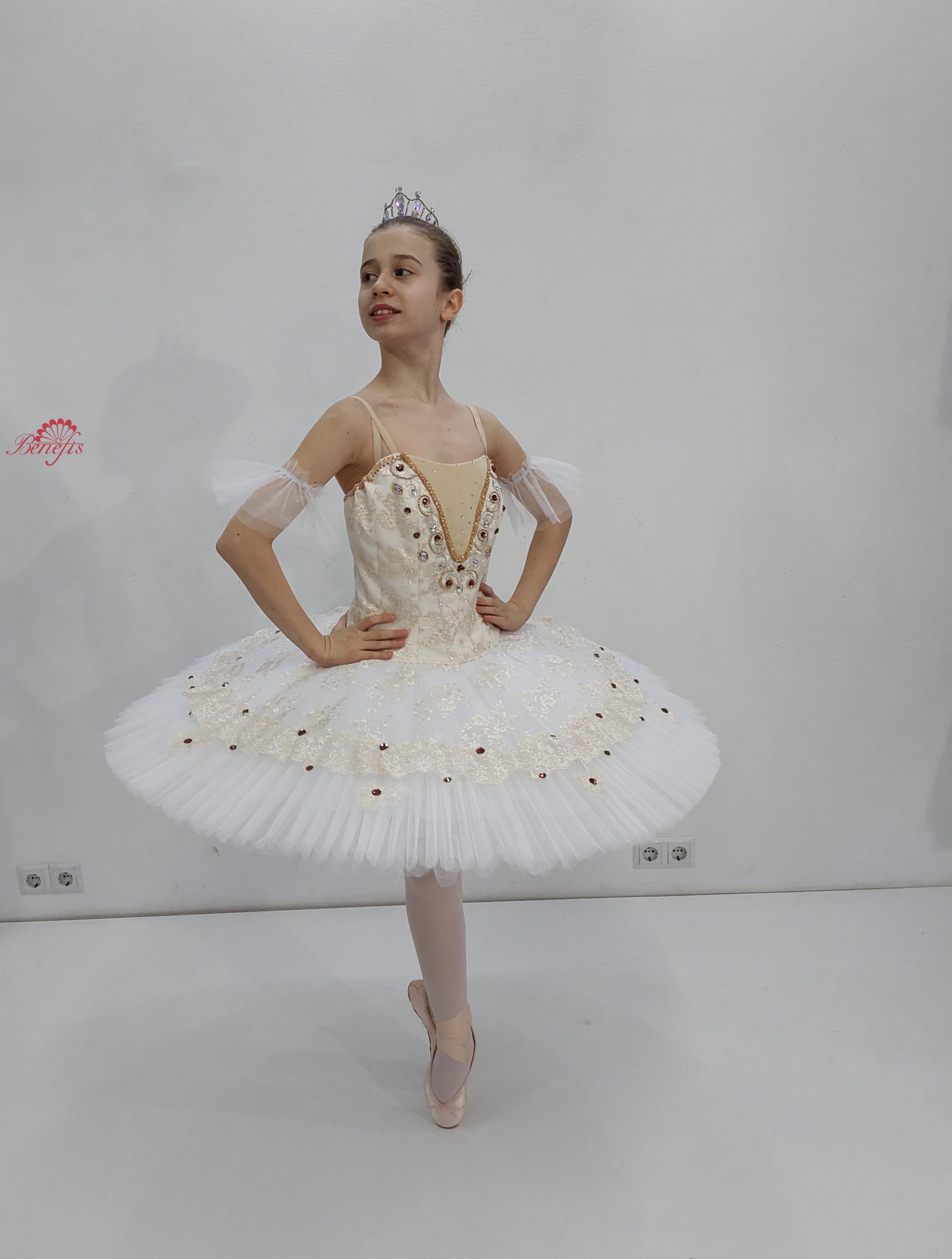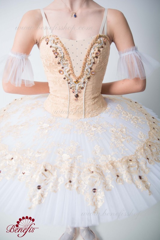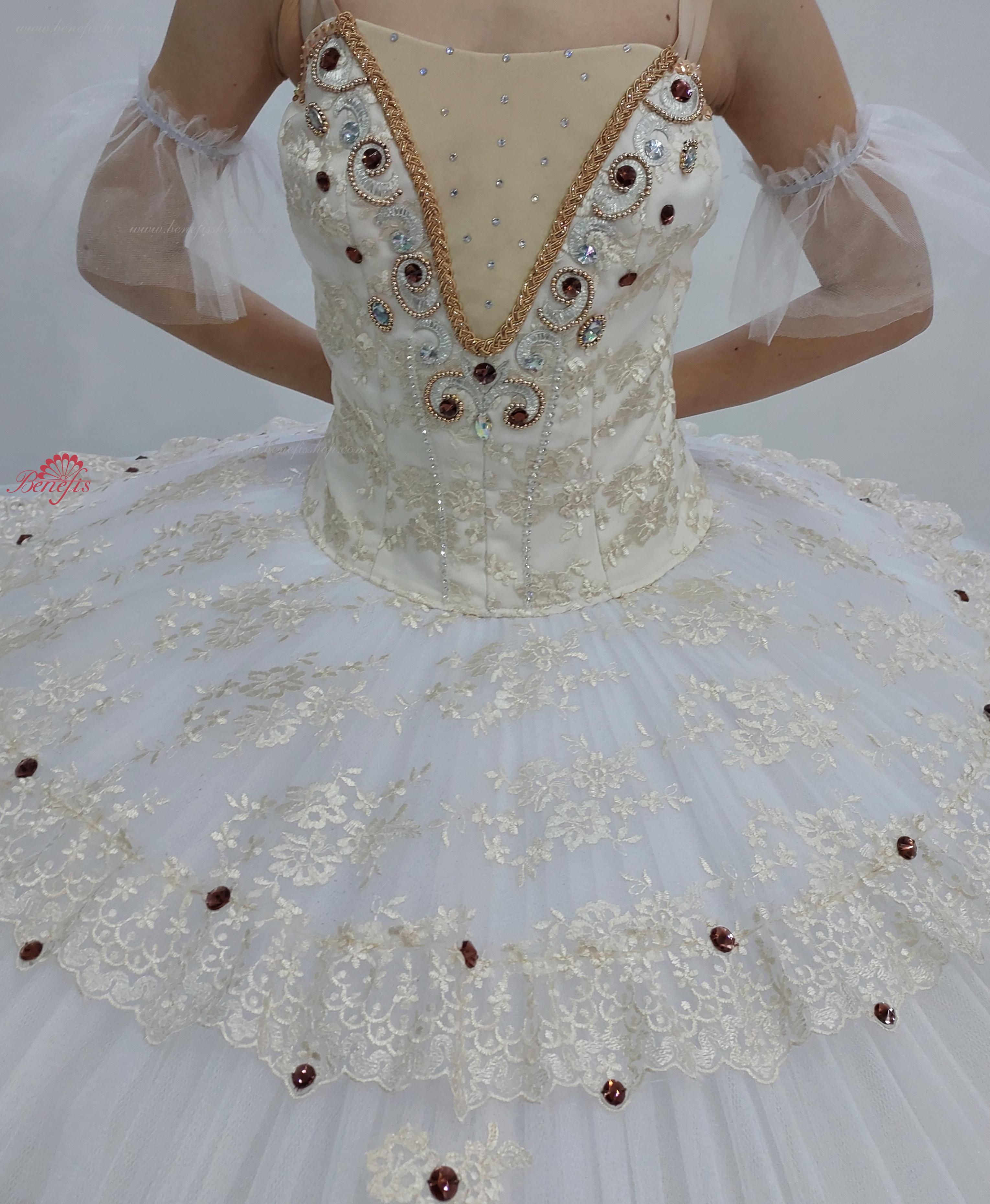 Acest costum profesionist de balet se face pe baza fustei de balet de baza T0001B. Corsetul este fabricat dintr-o tesatura semi-elastica cu un pariu V in fata si duplicat cu guipure. Corsetul are două rânduri de cârlige la spate. Costumul este decorat cu aplicatii, panglica, margele, margele, stralucire si pietre.