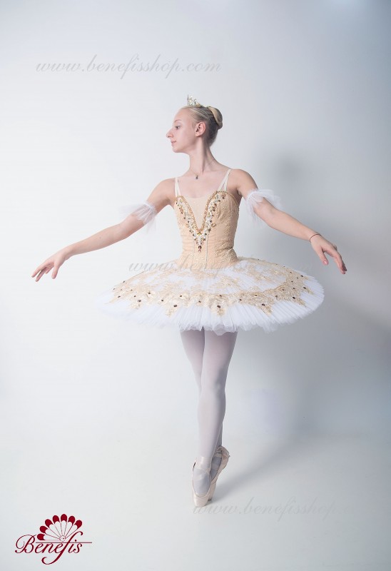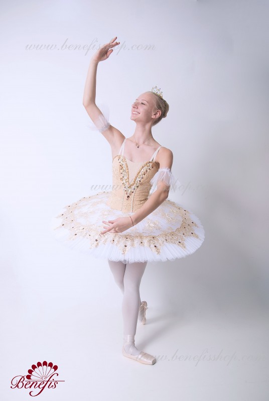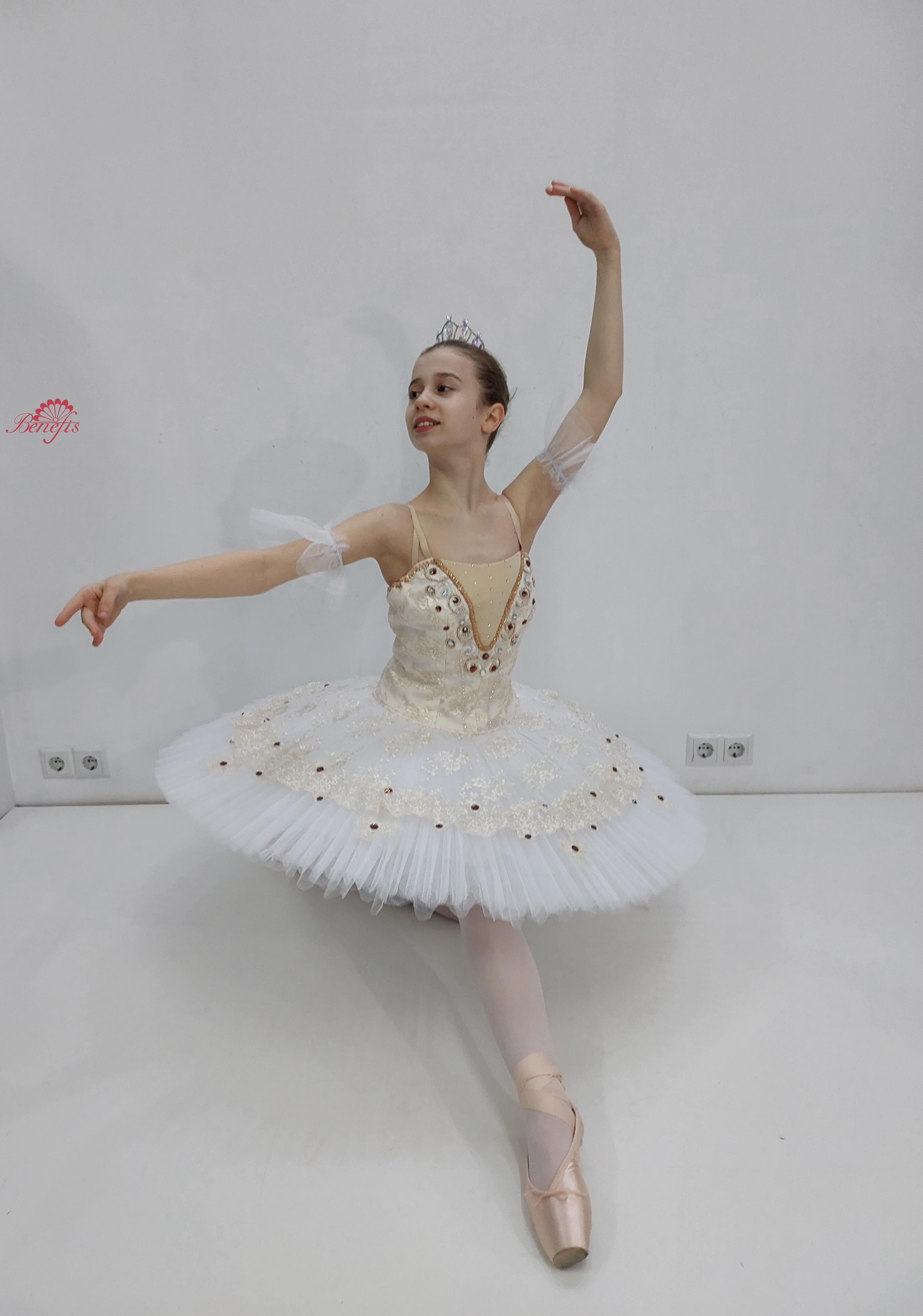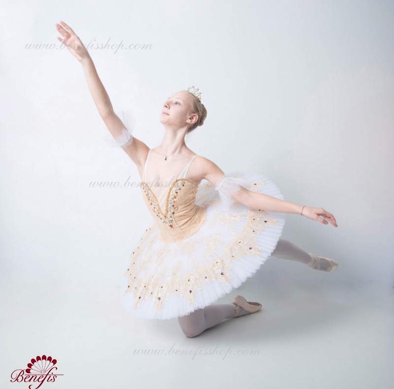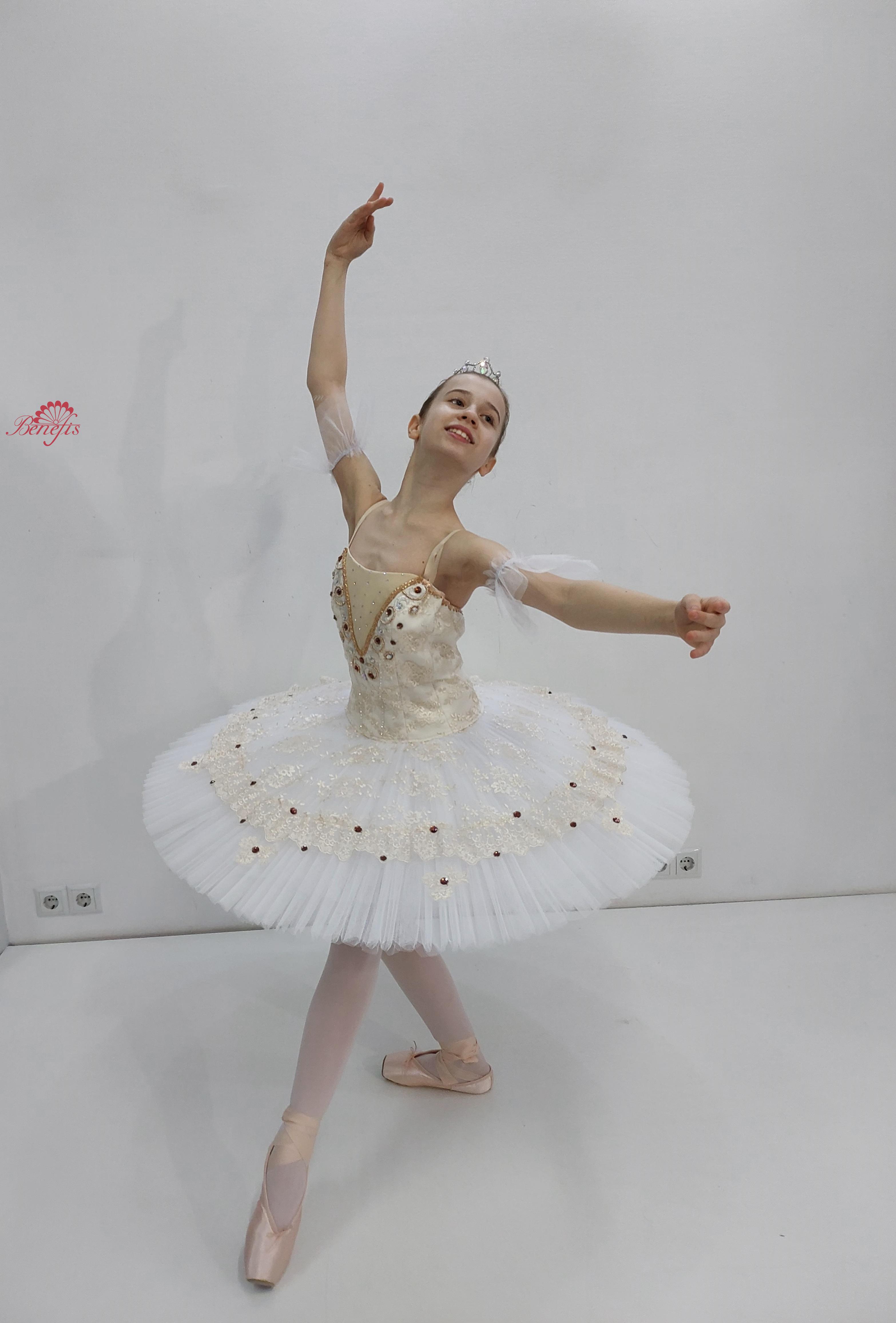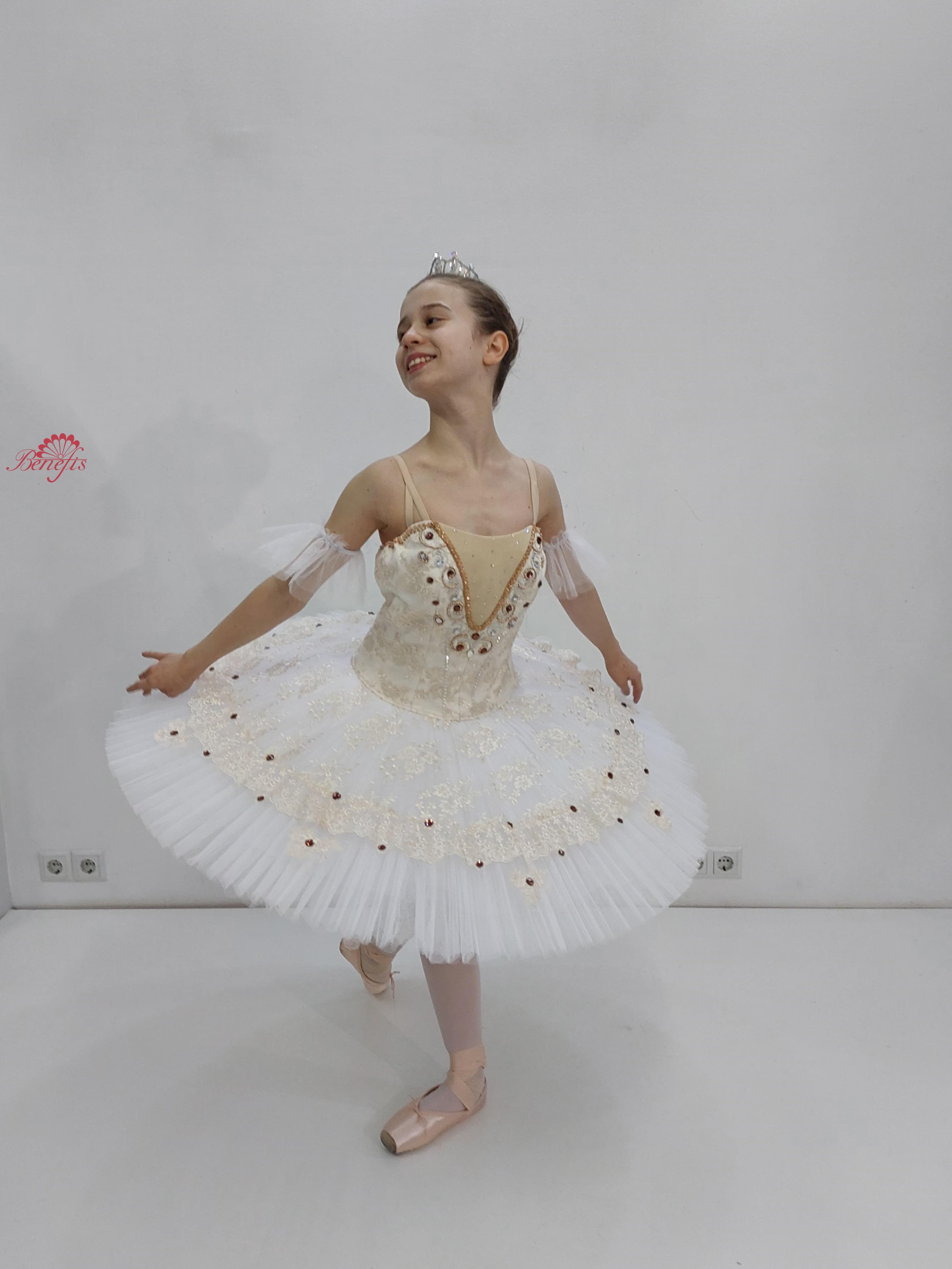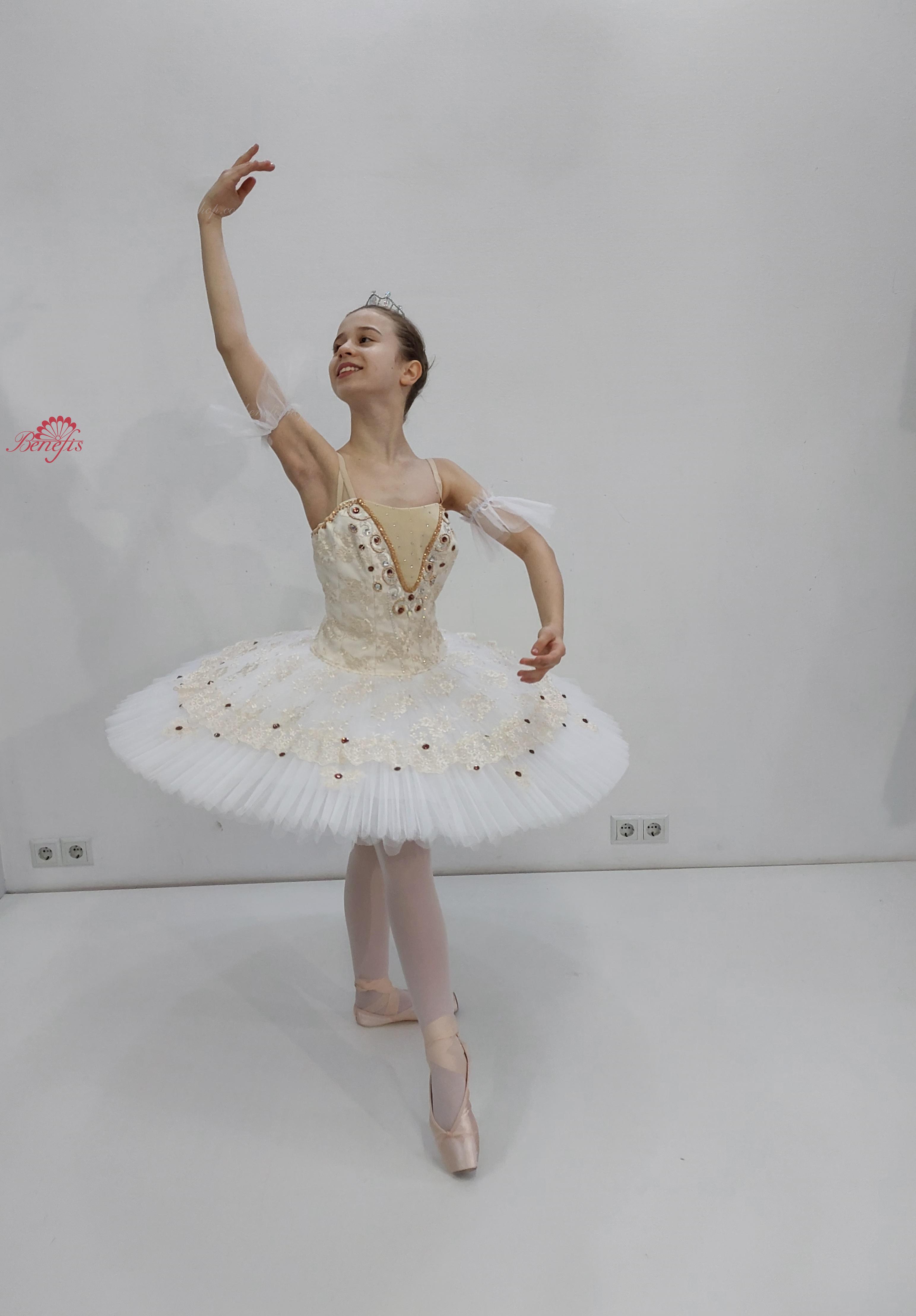 Acest costum profesionist de balet se face pe baza fustei de balet de baza T0001B. Corsetul este fabricat dintr-o tesatura semi-elastica cu un pariu V in fata si duplicat cu guipure. Corsetul are două rânduri de cârlige la spate. Costumul este decorat cu aplicatii, panglica, margele, margele, stralucire si pietre.