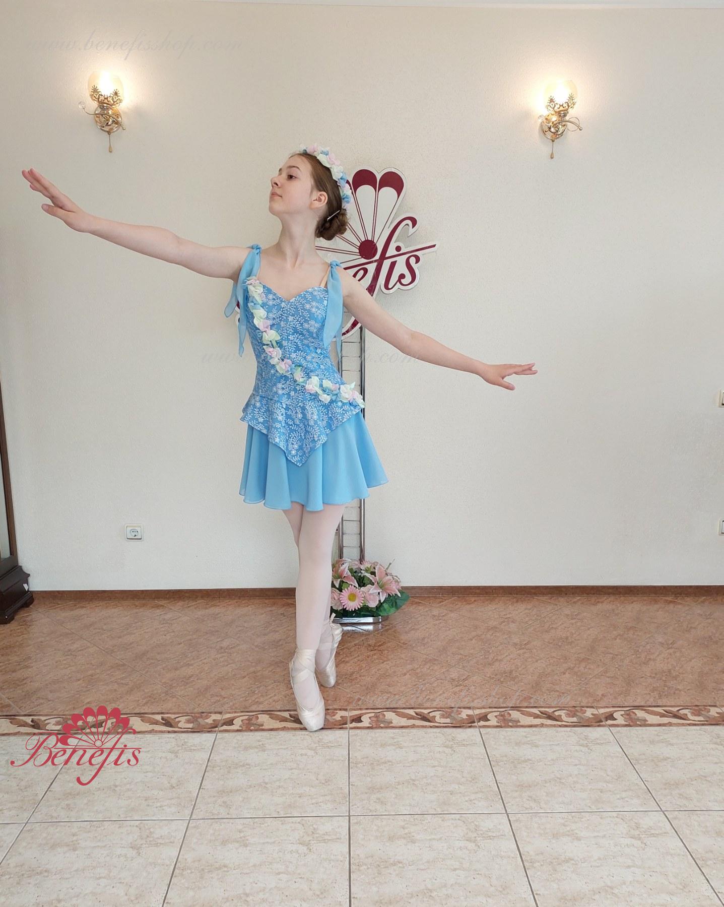 Costum de scena profesionist. Este facut din textura densa, dublat cu ghipura, cu chingele elastice de culoarea pielii si este decorat cu aplicatii in tonul costumului.