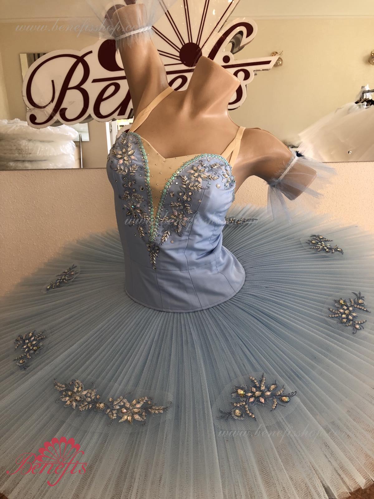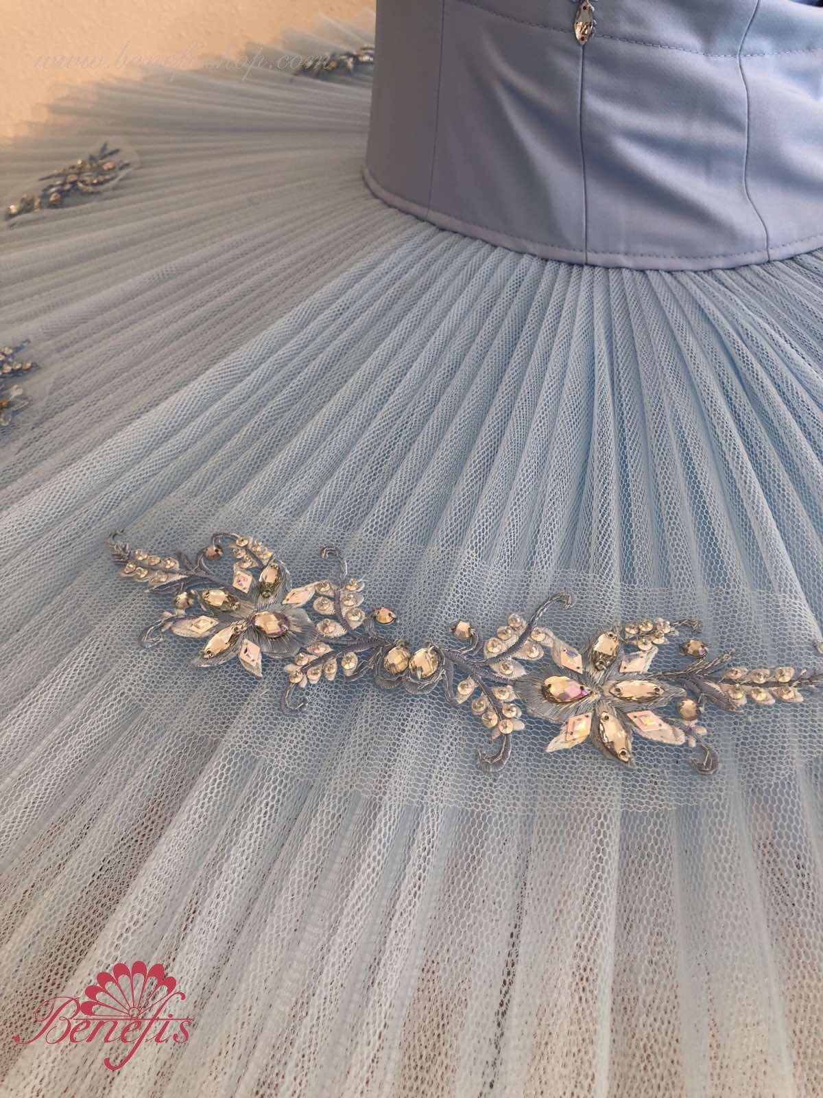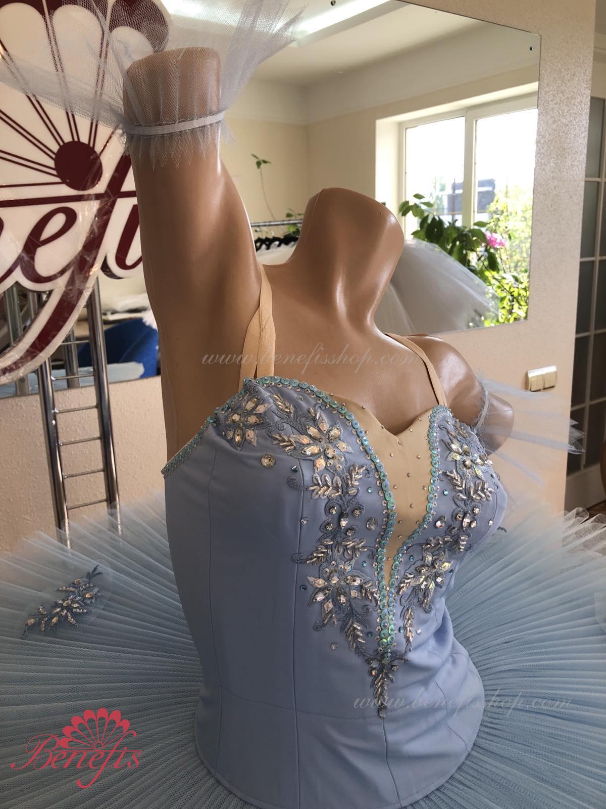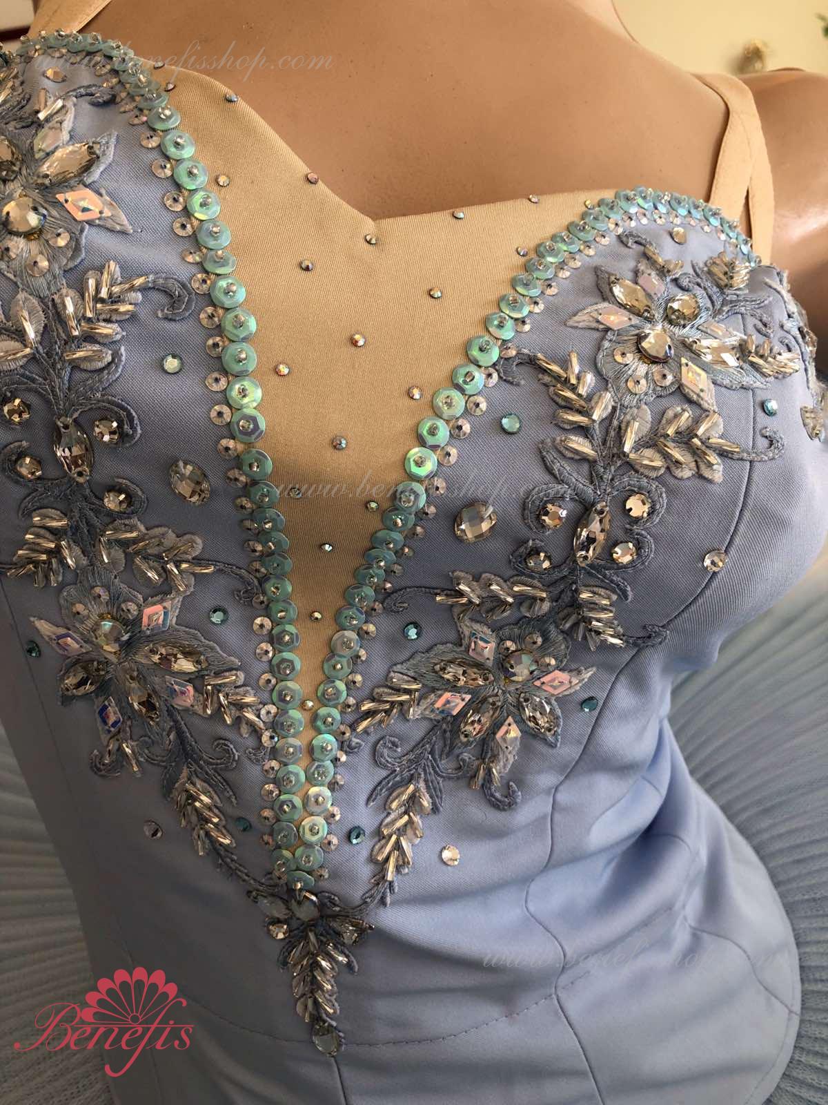Costumul de scena este confectionat pe baza corsetului T0009 si a bazei T00013, cu maneci delicate. Ca decor folosit: Aplicații, paiete, pietre.