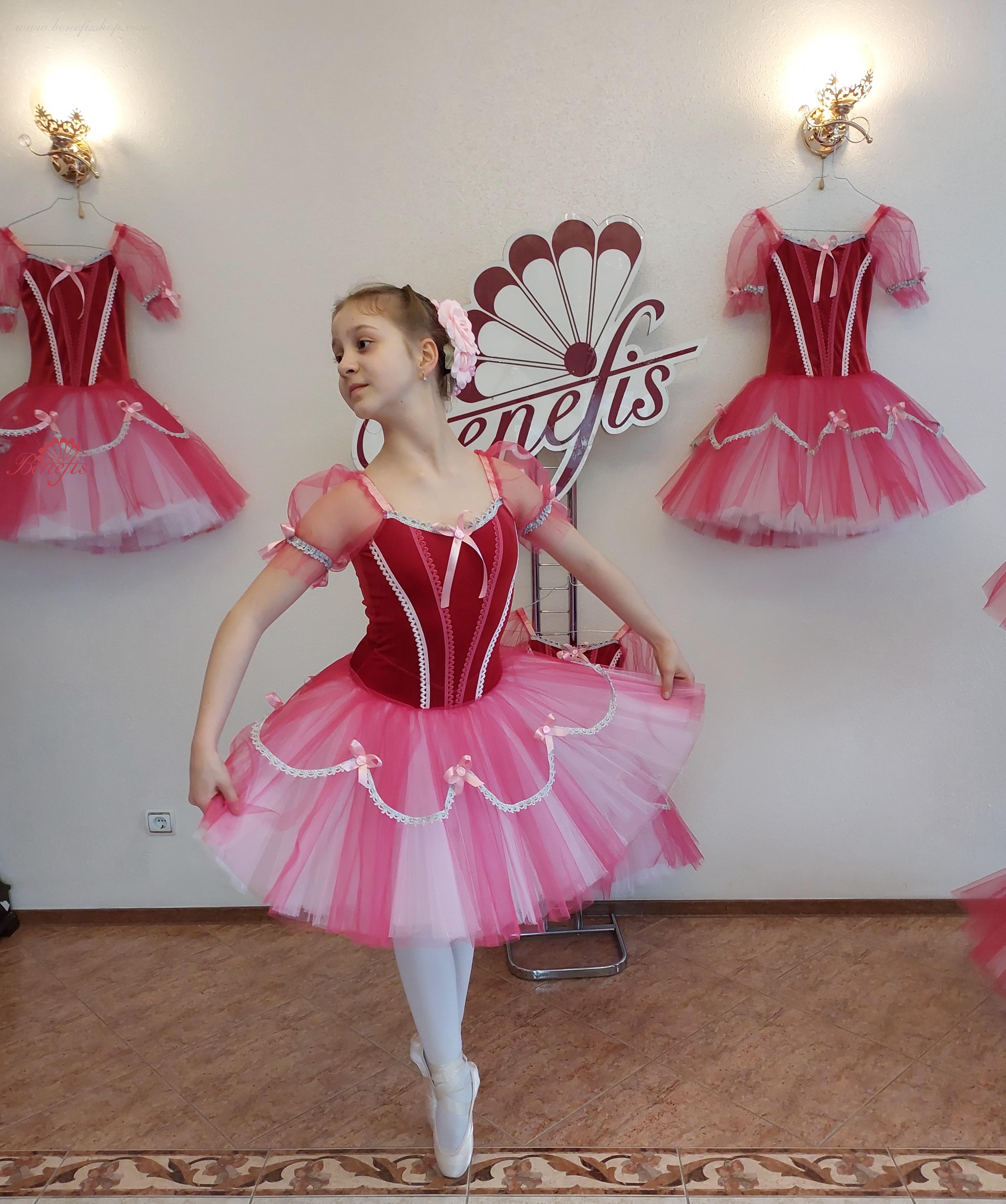 Acest costum de concert este indeplinit in baza unui tricou din catifea si a fustei cu cercuri. Corset si fusta sunt impodobite cu aplicatii si cristale.