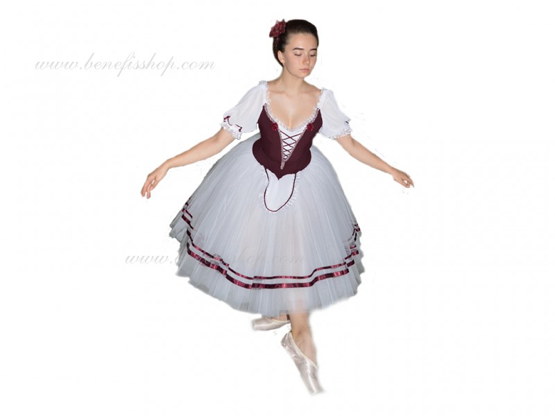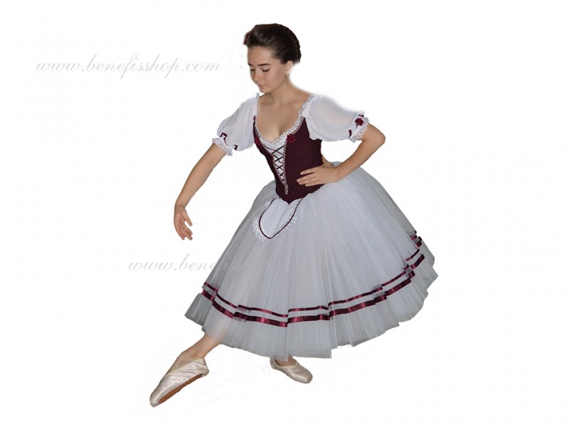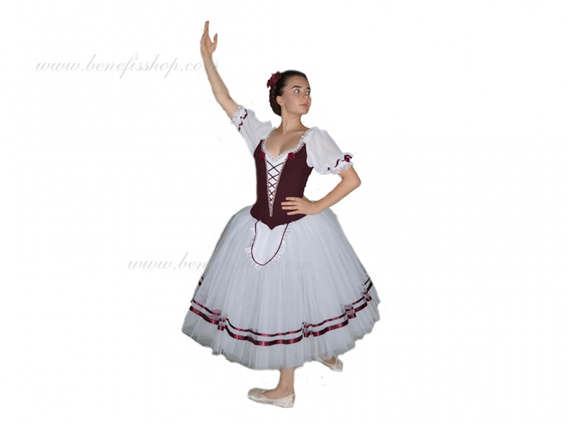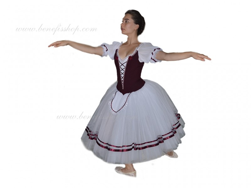 Costumul profesional de scenă este realizat pe baza fustei de bază T0003. Stratul superior al fustei este tăiat cu o panglică de satin de diferite lățimi. Corsetul este confectionat din tesatura semi-elastica cu insertie in forma de V in fata si Siret decorativ. Mânecile felinarelor sunt din sifon.