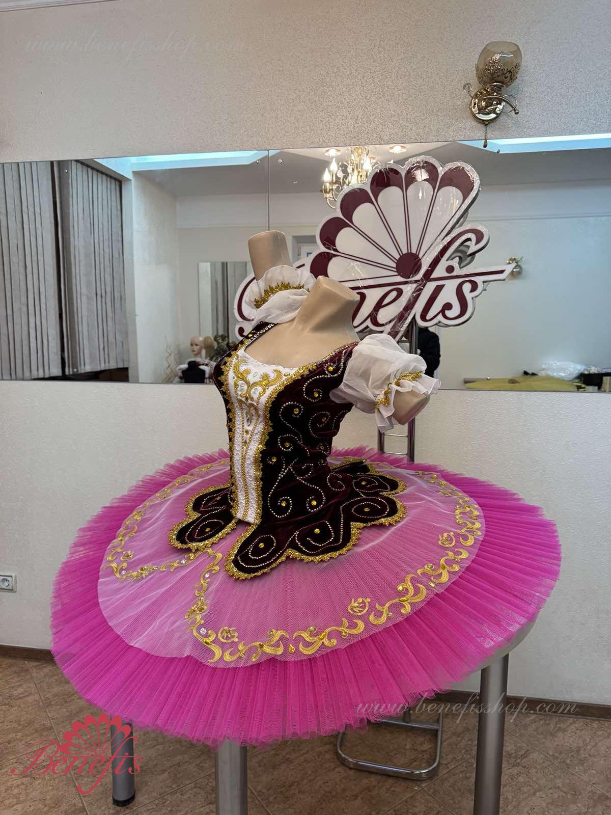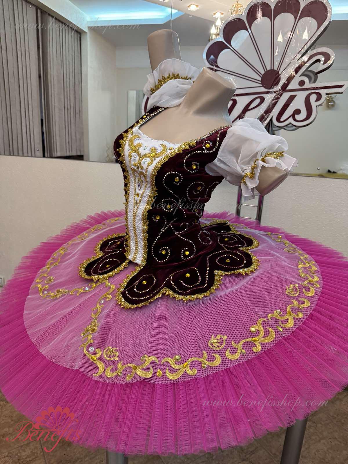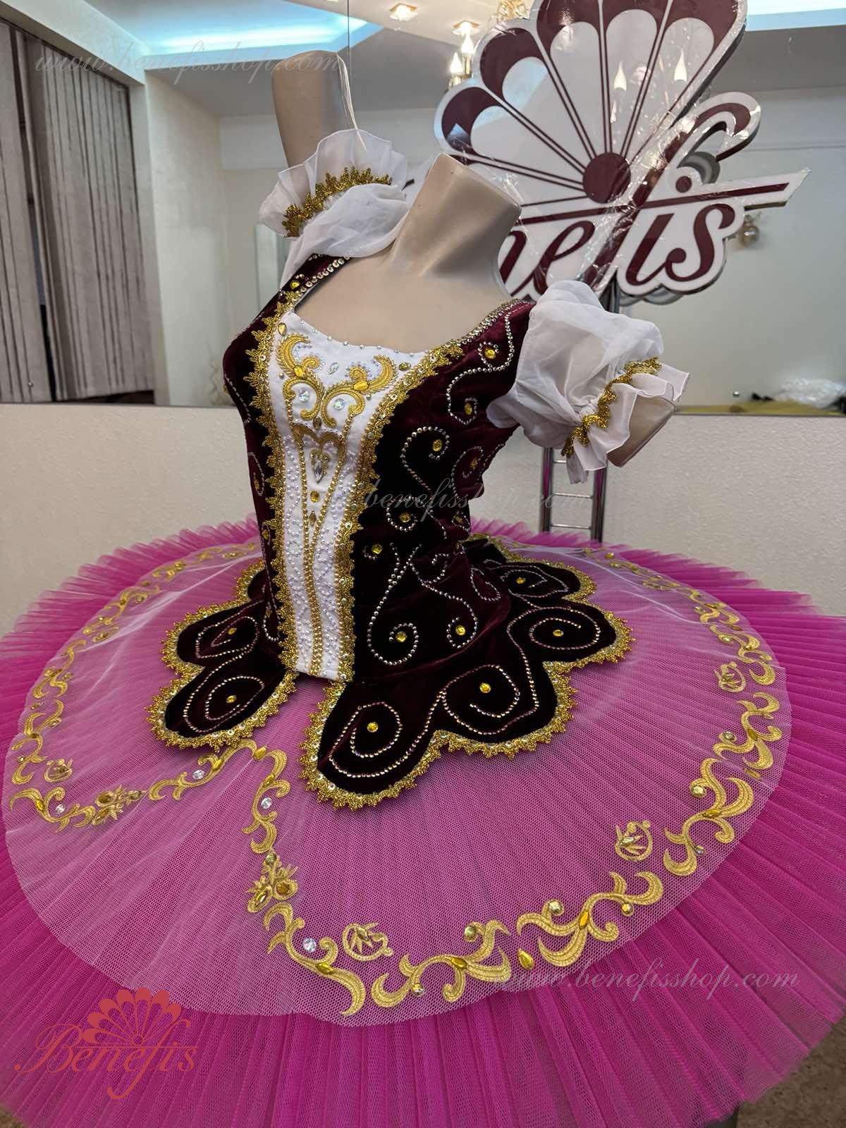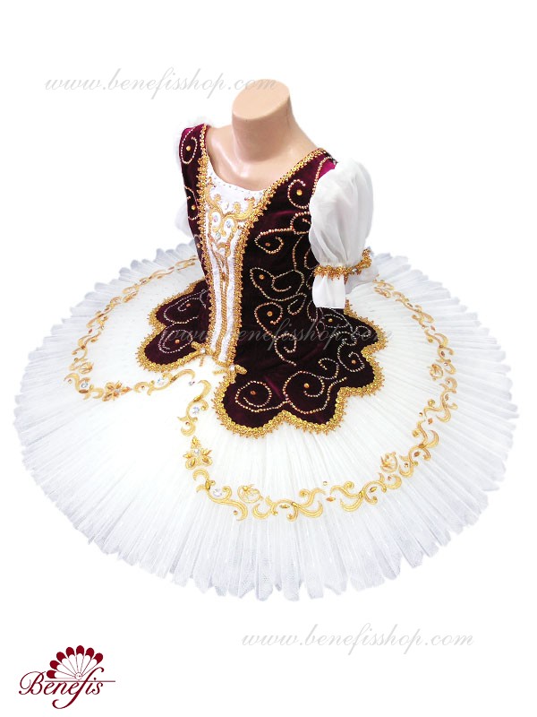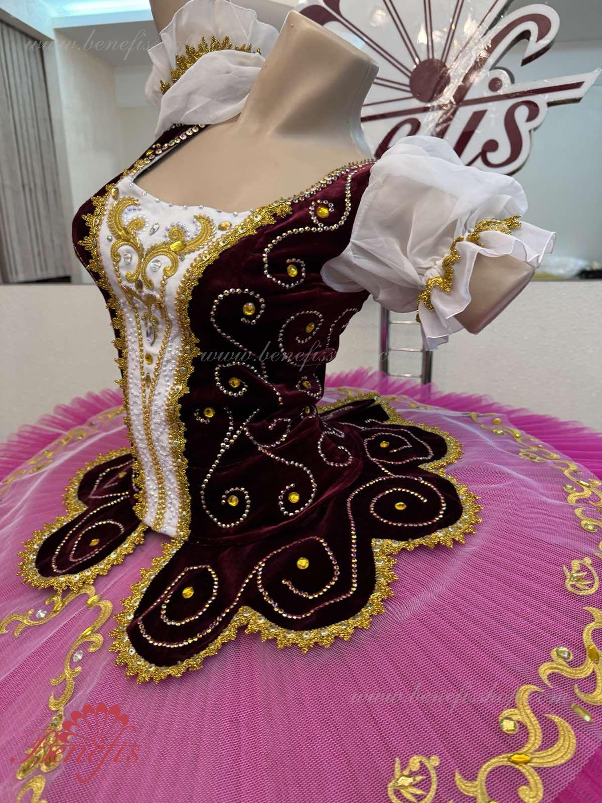 Costumul professional este indeplinit in stil francez, cu fusta putin lasata. Corsetul si stratul superior al fustei este fabricat dintr-o tesatura densa semi-elastica. Insertia de pe corset este indeplinita dintr-o tesatura monocromatica si este bogat impodobita cu applicatii, strase, paiete si margele marunte. Pe corset sunt prezente cirlige ( la dorinta consumatorului in doua rinduri) si un snur intern pentru imbaierarea corsetului la nivelul pieptului. Aplicatiile ajurate in forma de legatura antica ofera costumului un aspect de gala. Manopera este prezenta in infrumusetarea abundenta cu strase, paiete, margele marunte si de sticla, panglica. Acest costum poate fi utilizat in baletele “Sarbatoarea florilor in Cinzano ”, “Frumoasa Adormita” , numarul de concert Grand pas Classique.
