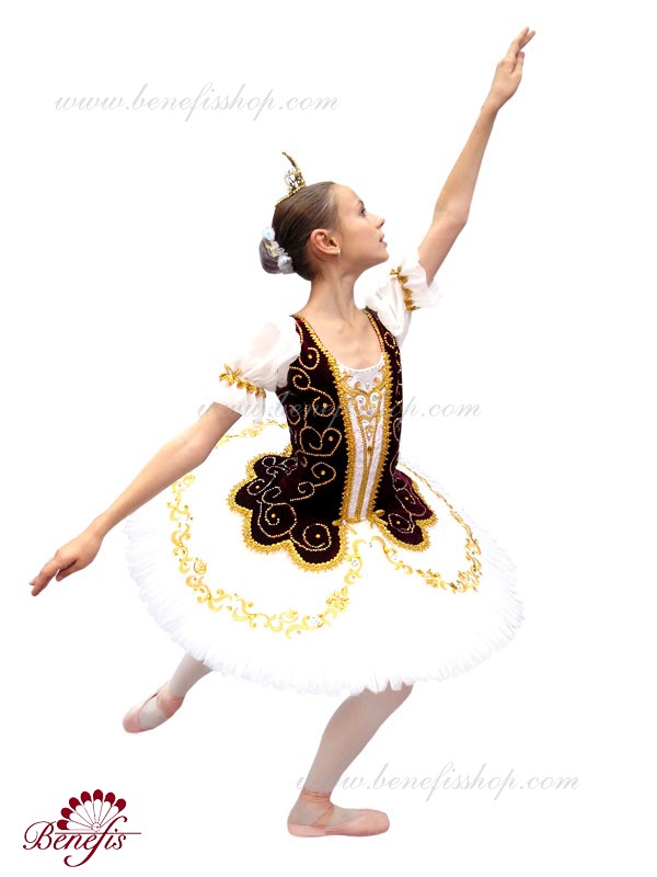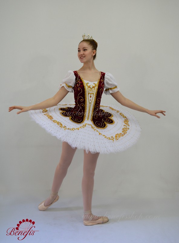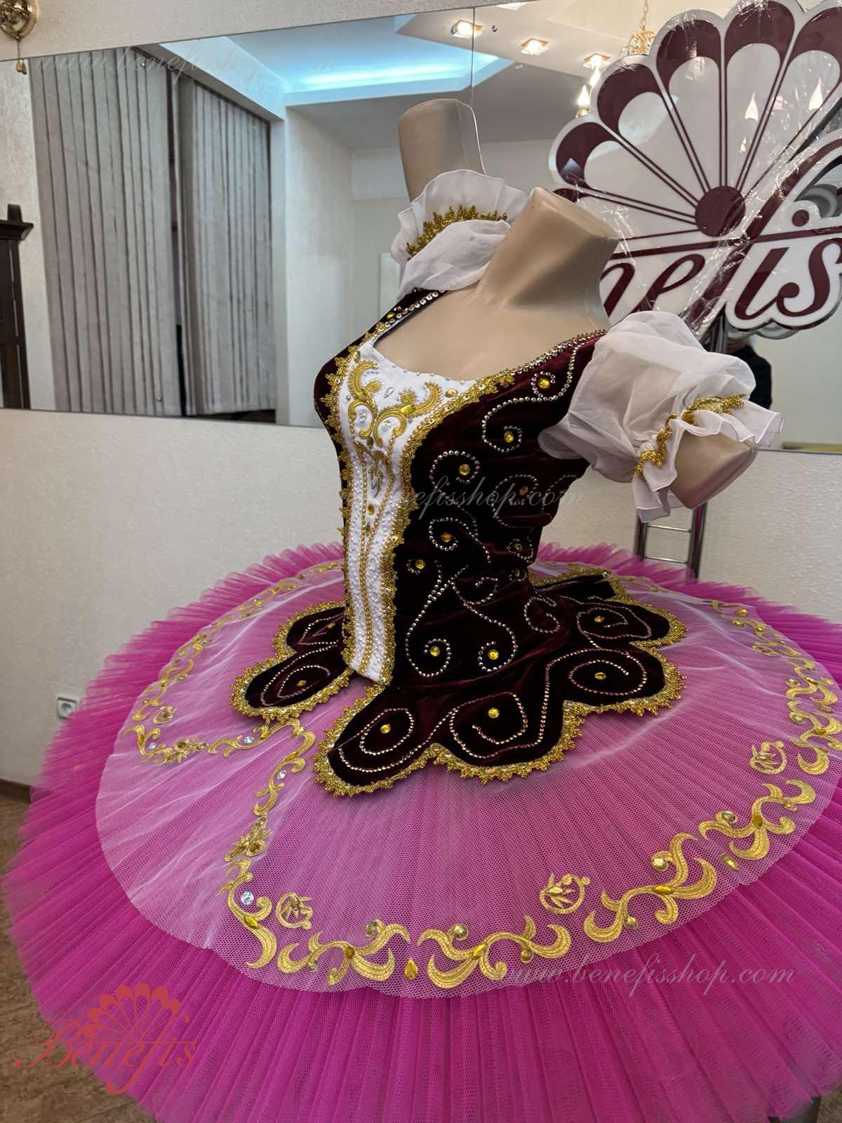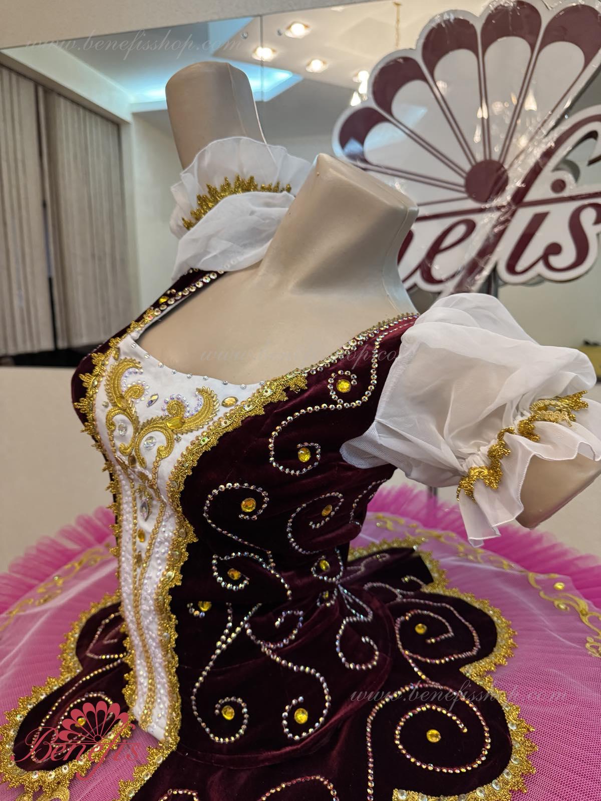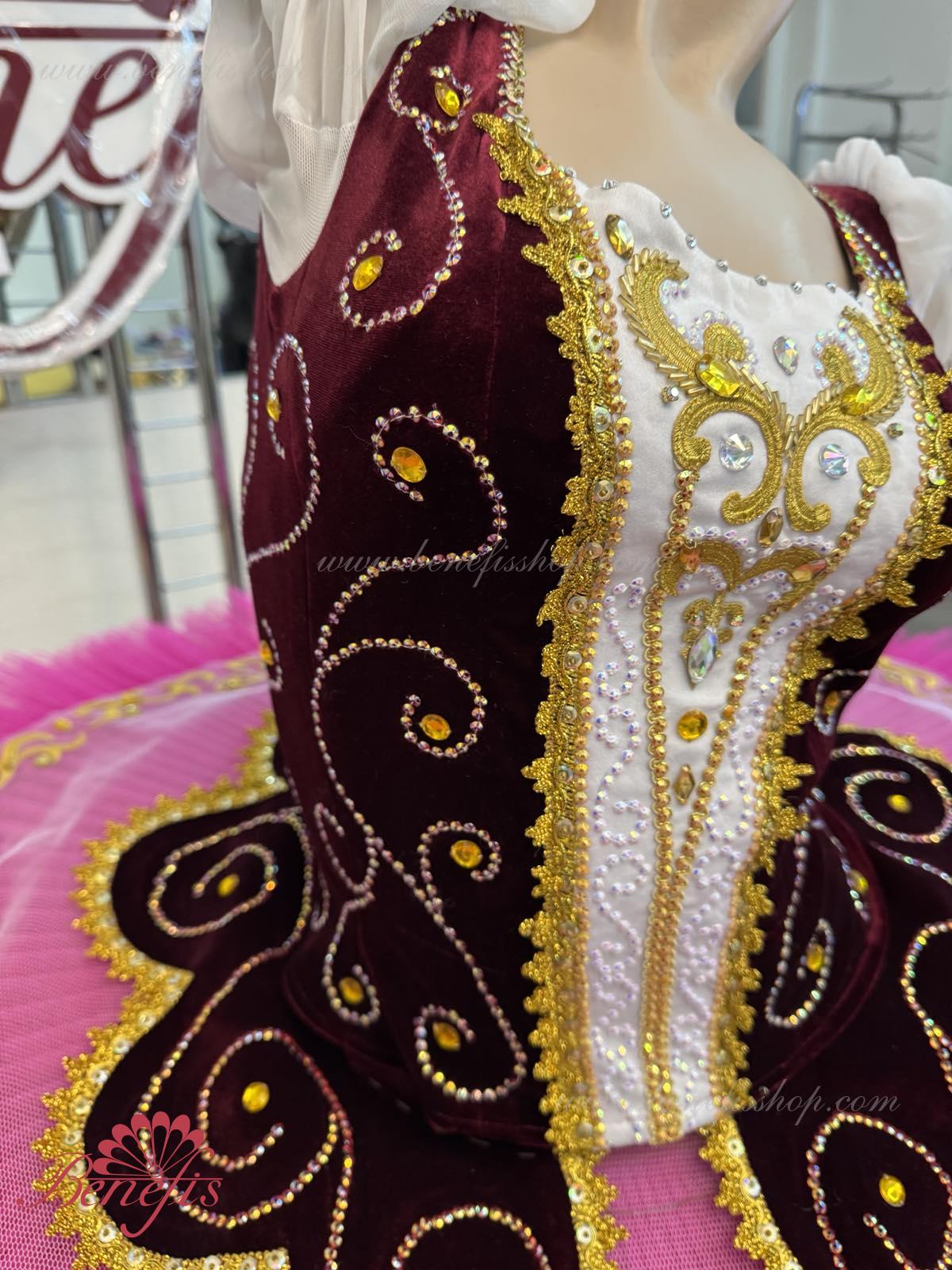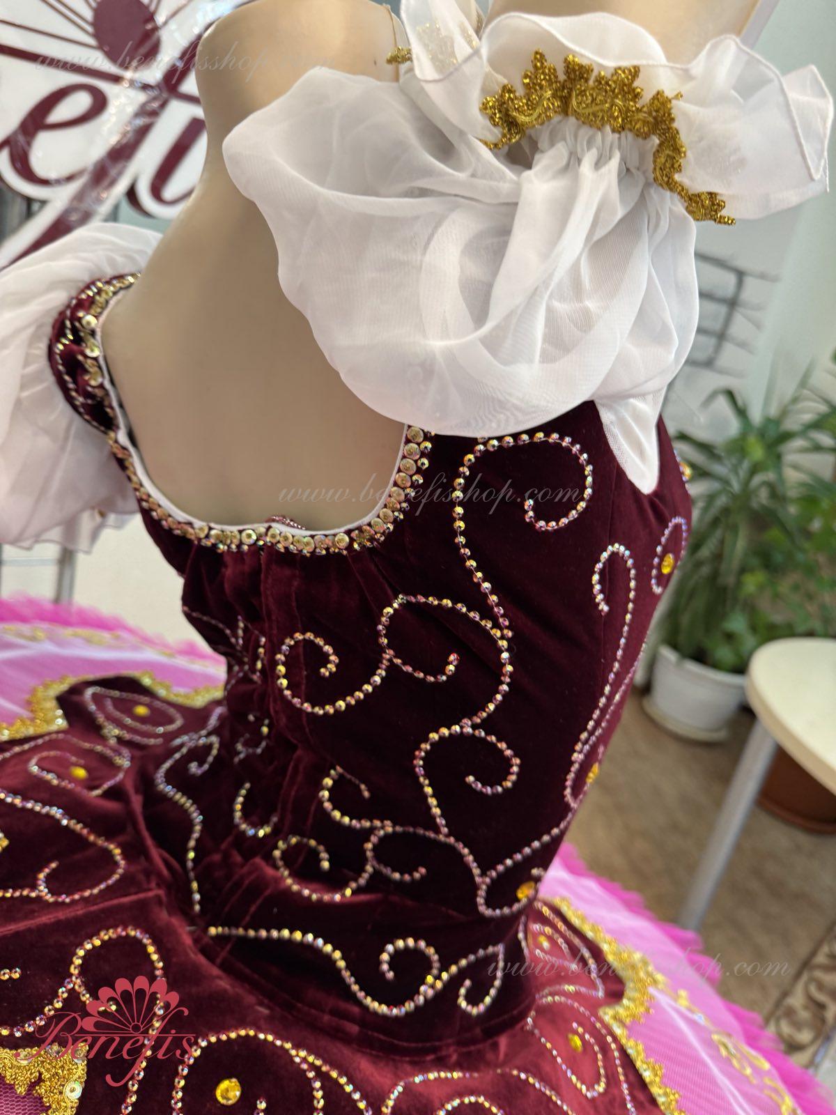 Costumul professional este indeplinit in stil francez, cu fusta putin lasata. Corsetul si stratul superior al fustei este fabricat dintr-o tesatura densa semi-elastica. Insertia de pe corset este indeplinita dintr-o tesatura monocromatica si este bogat impodobita cu applicatii, strase, paiete si margele marunte. Pe corset sunt prezente cirlige ( la dorinta consumatorului in doua rinduri) si un snur intern pentru imbaierarea corsetului la nivelul pieptului. Aplicatiile ajurate in forma de legatura antica ofera costumului un aspect de gala. Manopera este prezenta in infrumusetarea abundenta cu strase, paiete, margele marunte si de sticla, panglica. Acest costum poate fi utilizat in baletele “Sarbatoarea florilor in Cinzano ”, “Frumoasa Adormita” , numarul de concert Grand pas Classique.