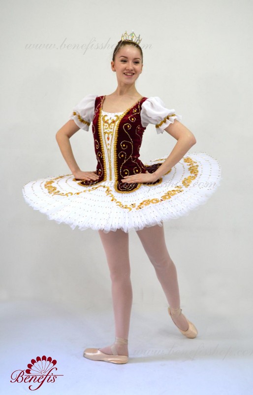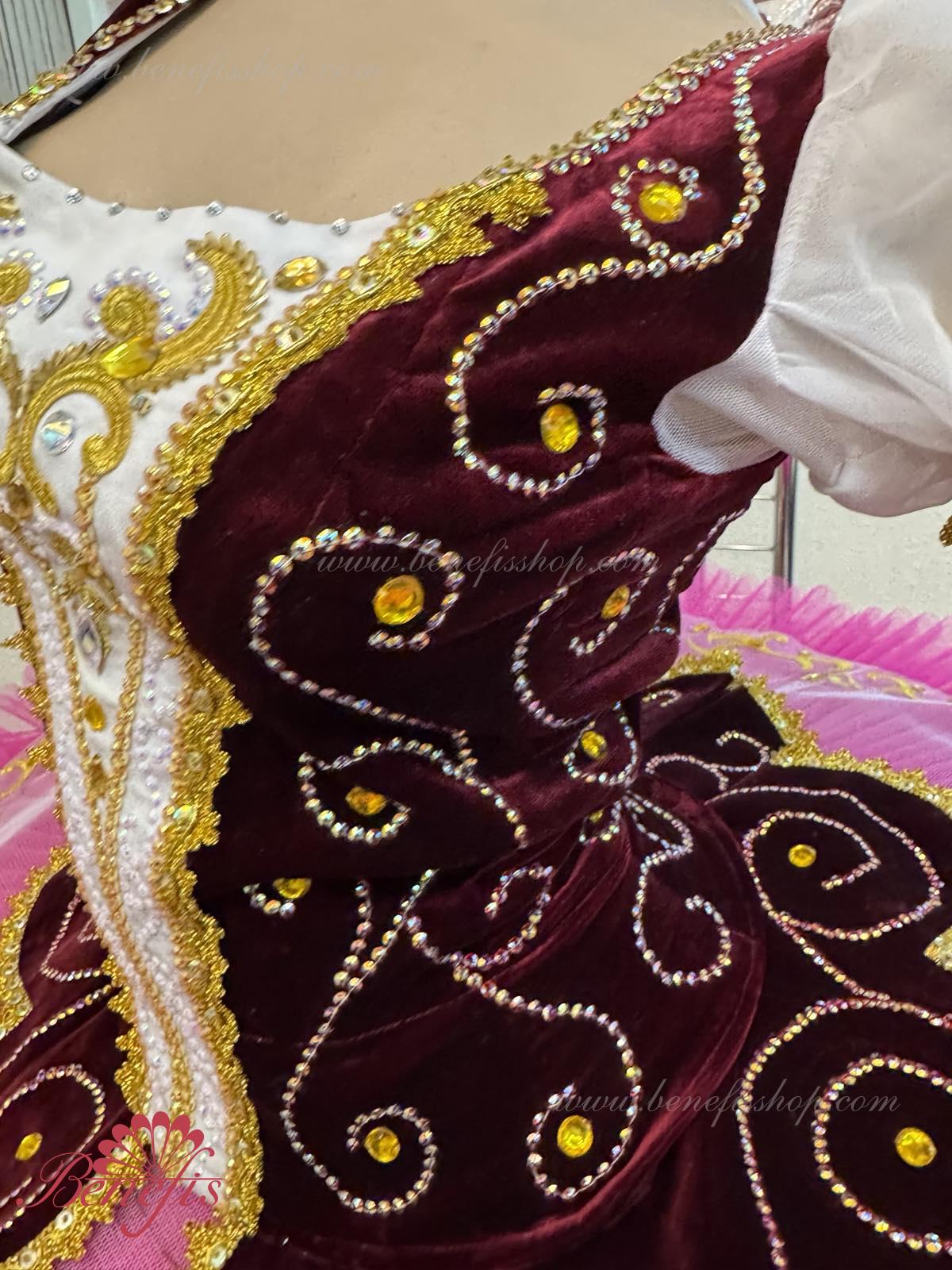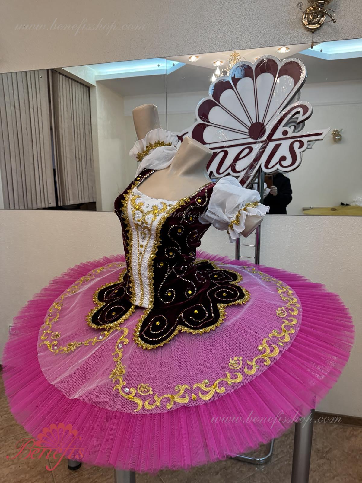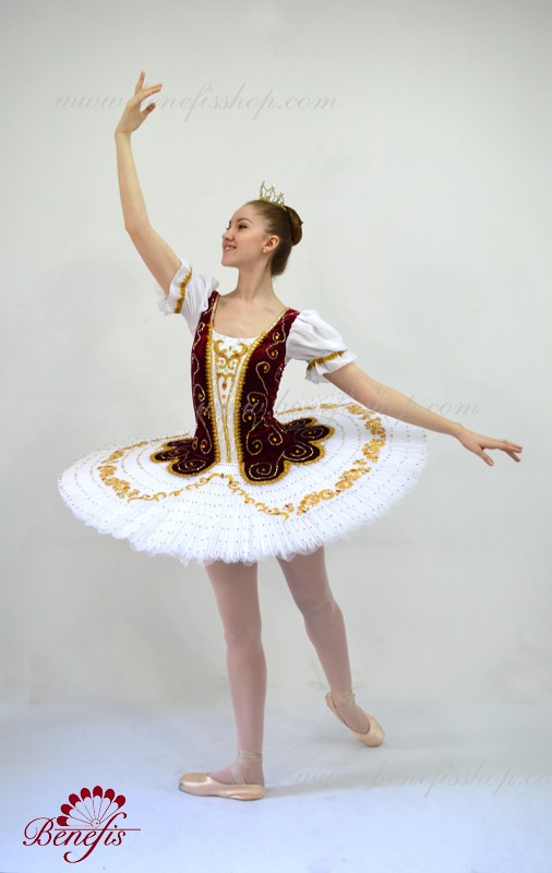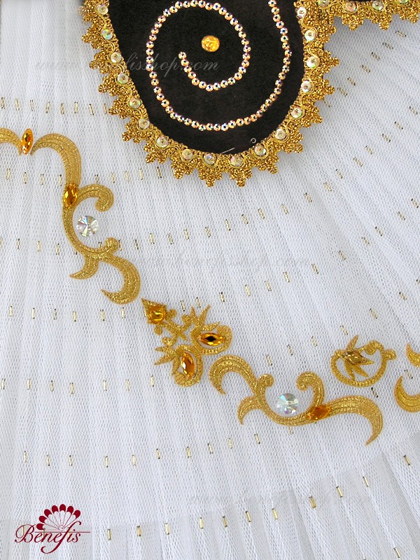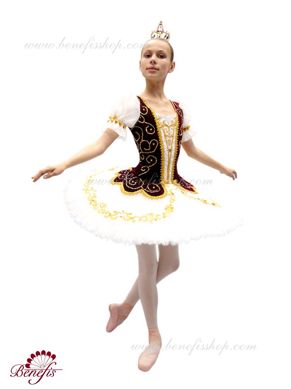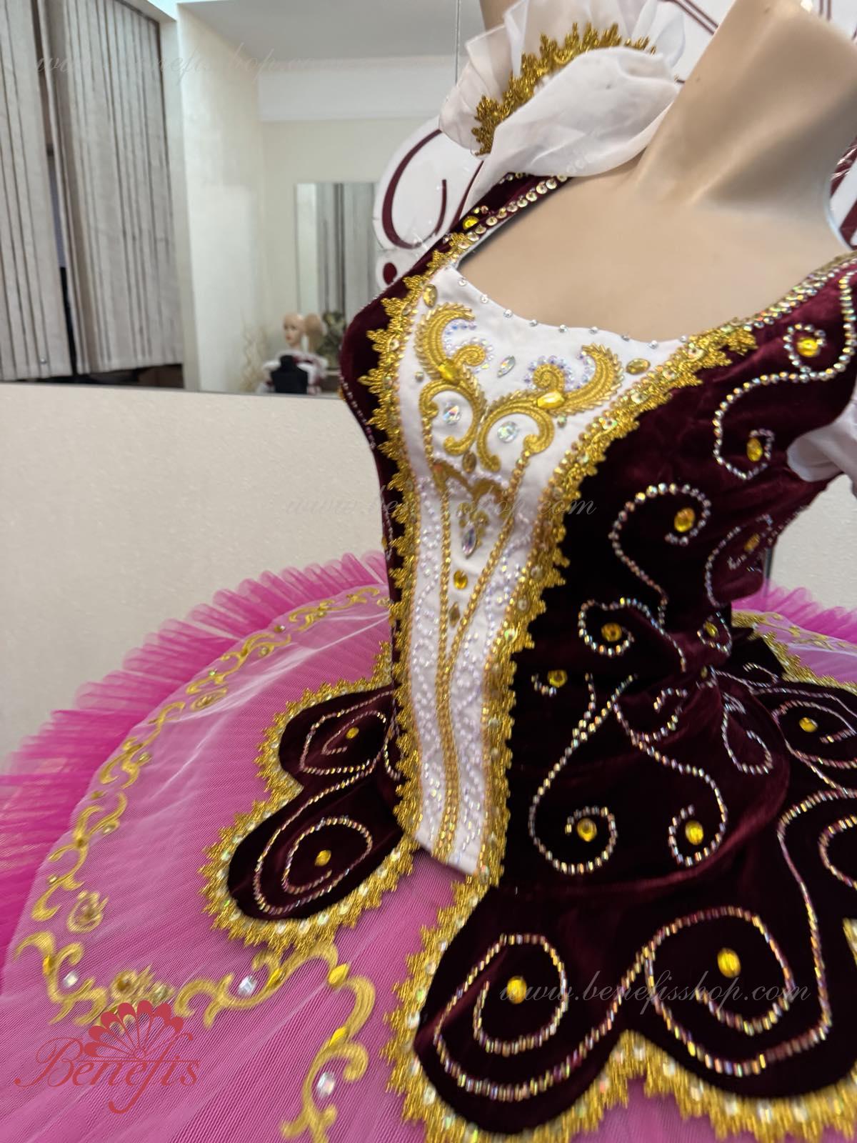 Costumul professional este indeplinit in stil francez, cu fusta putin lasata. Corsetul si stratul superior al fustei este fabricat dintr-o tesatura densa semi-elastica. Insertia de pe corset este indeplinita dintr-o tesatura monocromatica si este bogat impodobita cu applicatii, strase, paiete si margele marunte. Pe corset sunt prezente cirlige ( la dorinta consumatorului in doua rinduri) si un snur intern pentru imbaierarea corsetului la nivelul pieptului. Aplicatiile ajurate in forma de legatura antica ofera costumului un aspect de gala. Manopera este prezenta in infrumusetarea abundenta cu strase, paiete, margele marunte si de sticla, panglica. Acest costum poate fi utilizat in baletele “Sarbatoarea florilor in Cinzano ”, “Frumoasa Adormita” , numarul de concert Grand pas Classique.