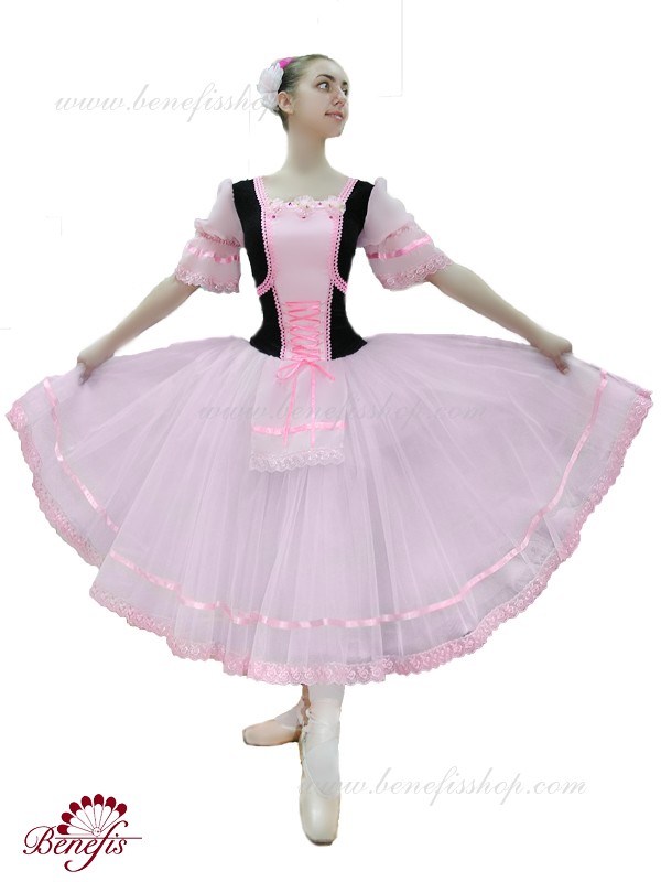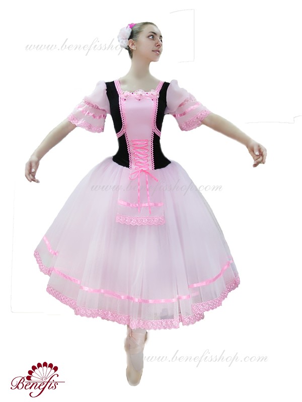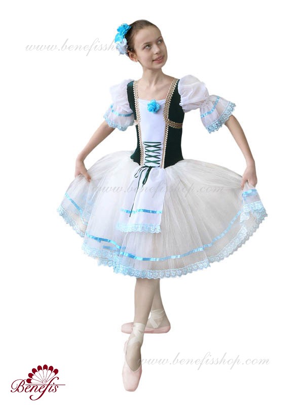 Costumul este indeplinit asemanator costumului de cardabalet pentru adulti din baletul “Giselle”, si are ca baza tricoul. Corsetul este confectionat din catifea fiind infrumusetat cu un siret aplicat in stil taranesc si cu o panglica lata. Fusta pufoasa este executata din 4 straturi de tul si este decorata cu o panglica de atlas. Panglica de atlas la fel decoreaza corsetul si miinicele intr-un stil taranesc. Stratul superior al fustei, sortul si miinecele din chiffon sunt bordurate cu ghipura.