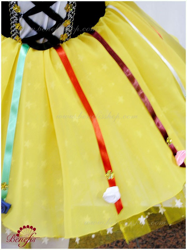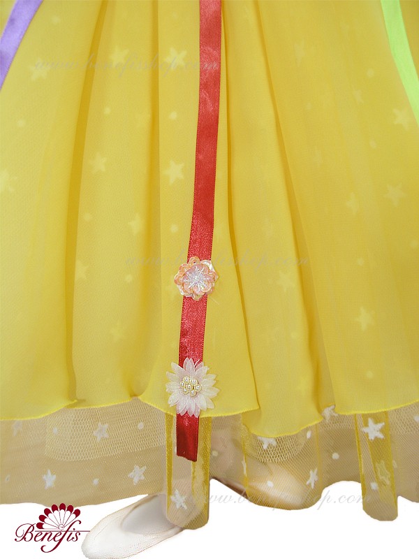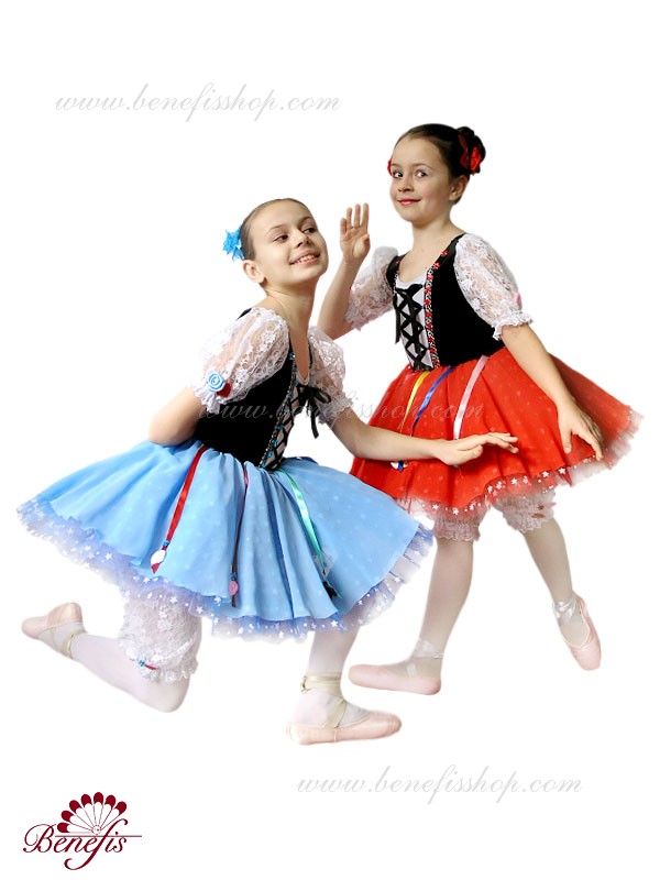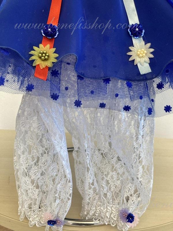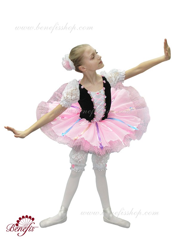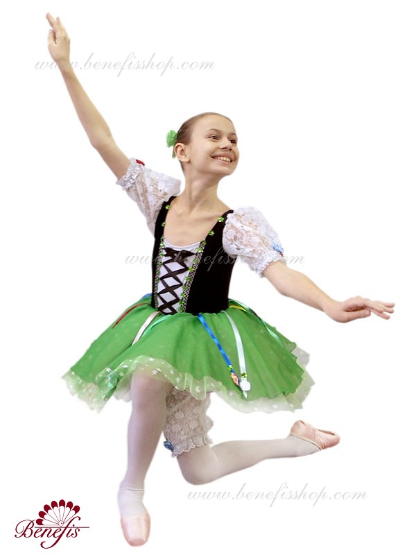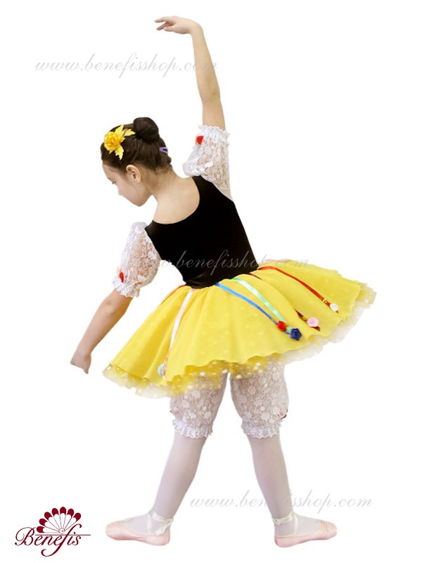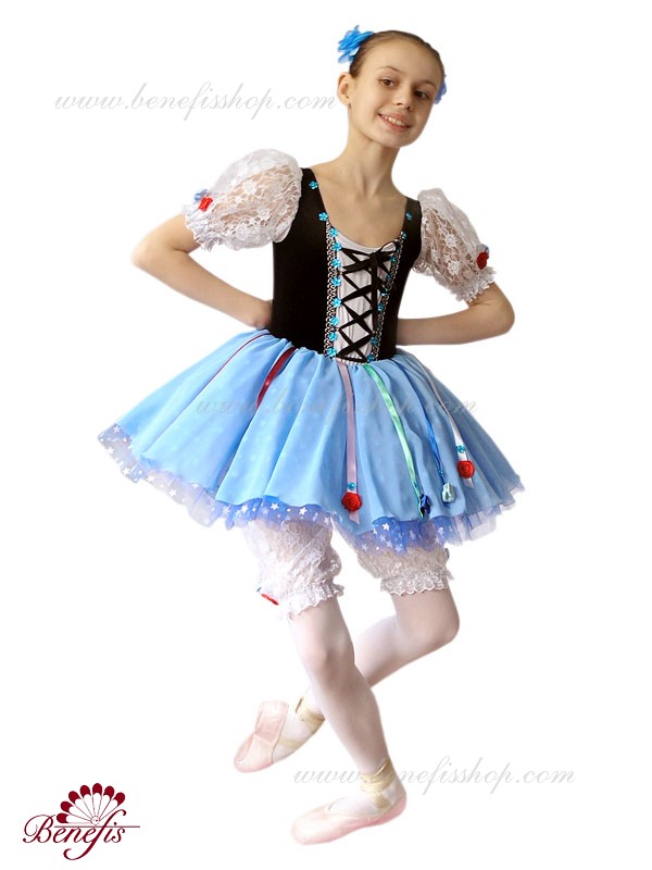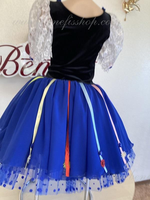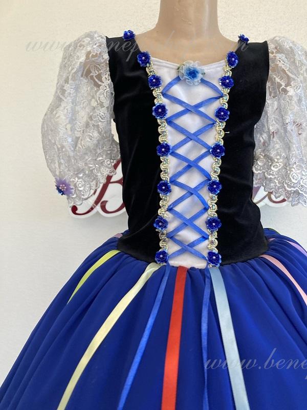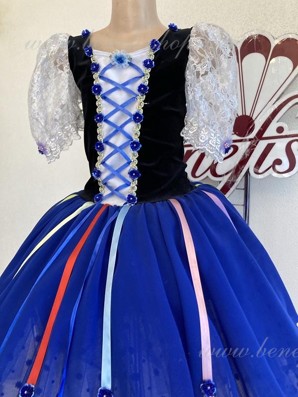 Costumul este indeplinit in baza de tricou fara incheietoare la spate, la indeplinirea corsetului este folosita catifea elastica. Miinicele si pantalonii sunt executati din ghipur. Fusta este executata din fatin decorativ ce are inserat un desen, stratul superior este indeplinit din chiffon. Costumul este infrumusetat cu panglici late de satin si flori.