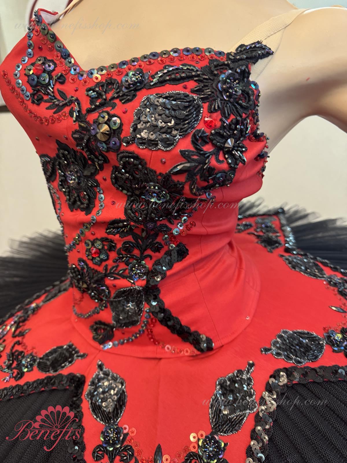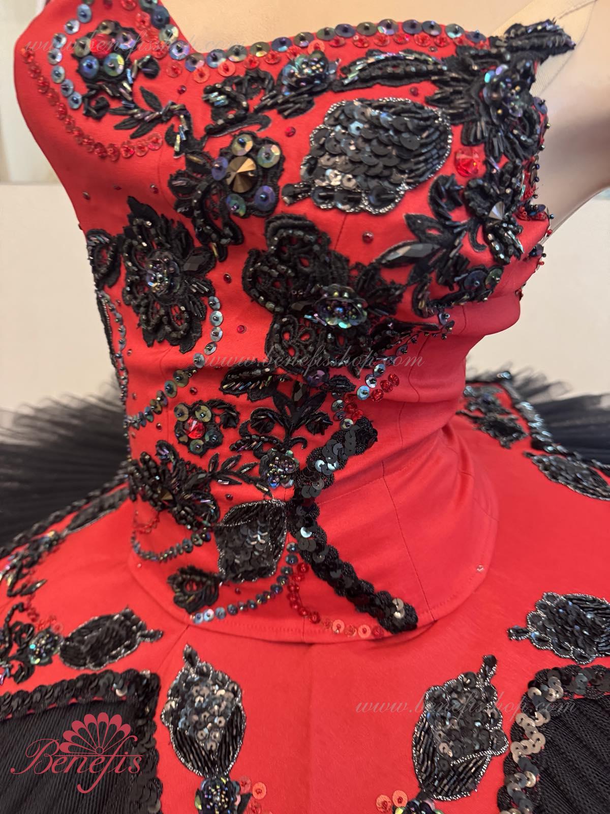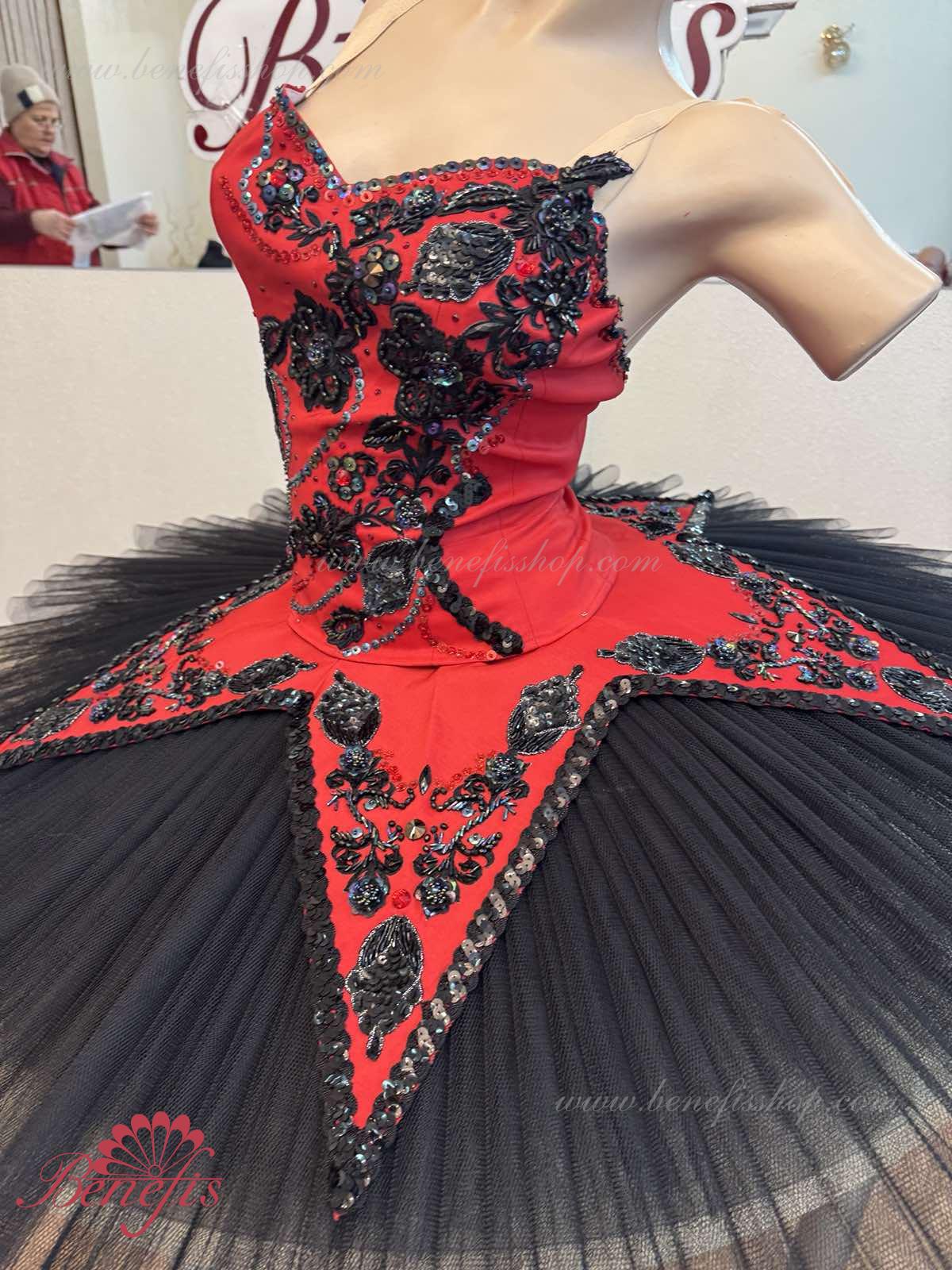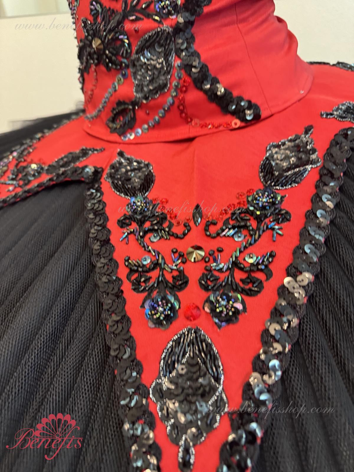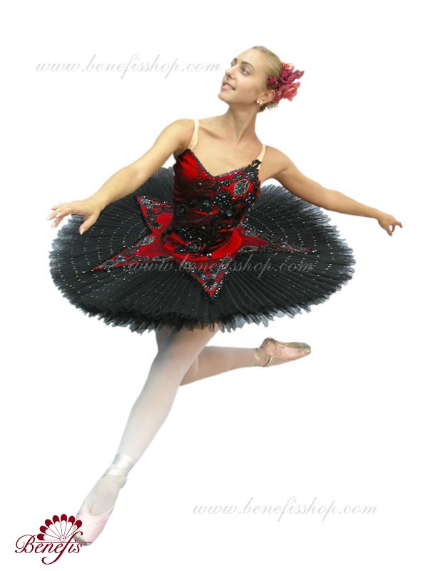 Costumul dat este executat intr-un mod strict conform baletului classic. Corsetul si partea superioara sunt executate din material semi – strench, tafta – strench cu putin luciu.Pe corset sunt prezente doua rindure de chirlige pentru regularea comoda. Ca decor sunt folosite dantele decorative ce sunt cusute manual cu diverse paiete, margele marunte si strase. Aplicatiile de pe corset sunt indeplinite asimetric si sunt asemanatoare unui ram de pe piept.