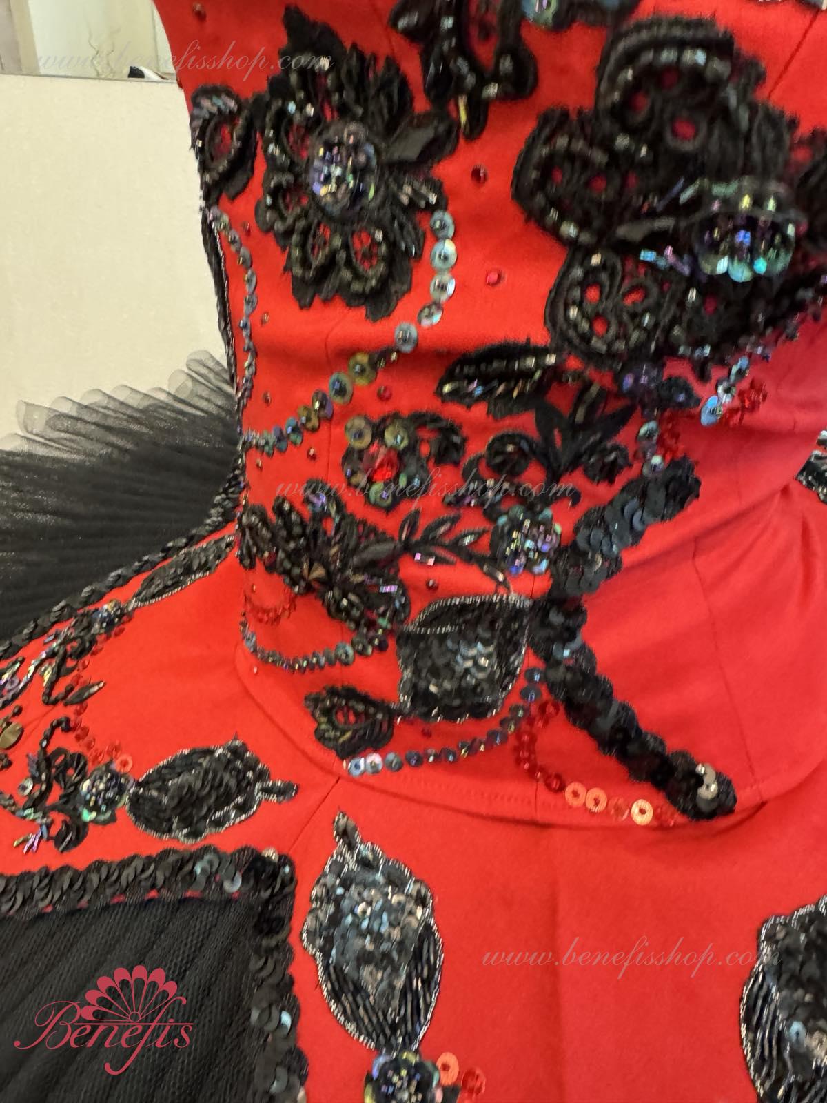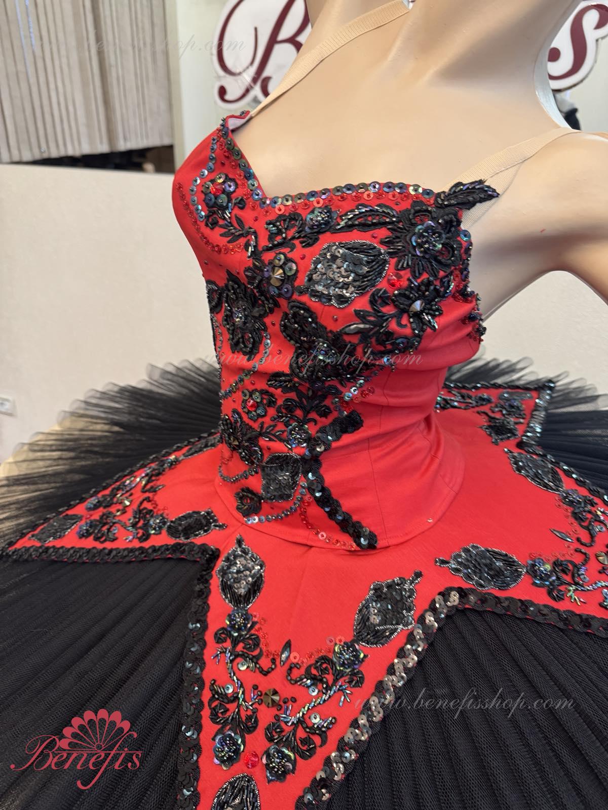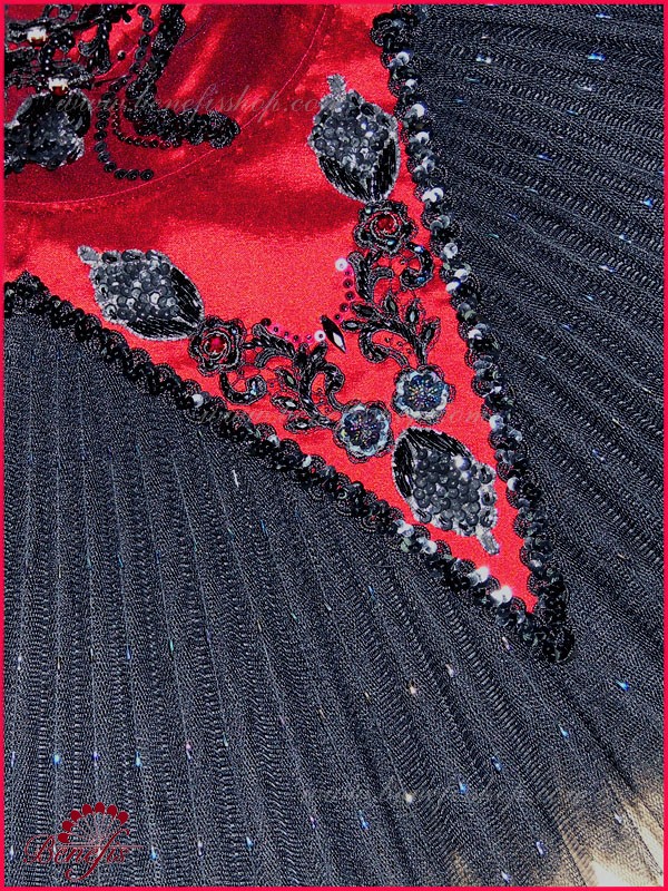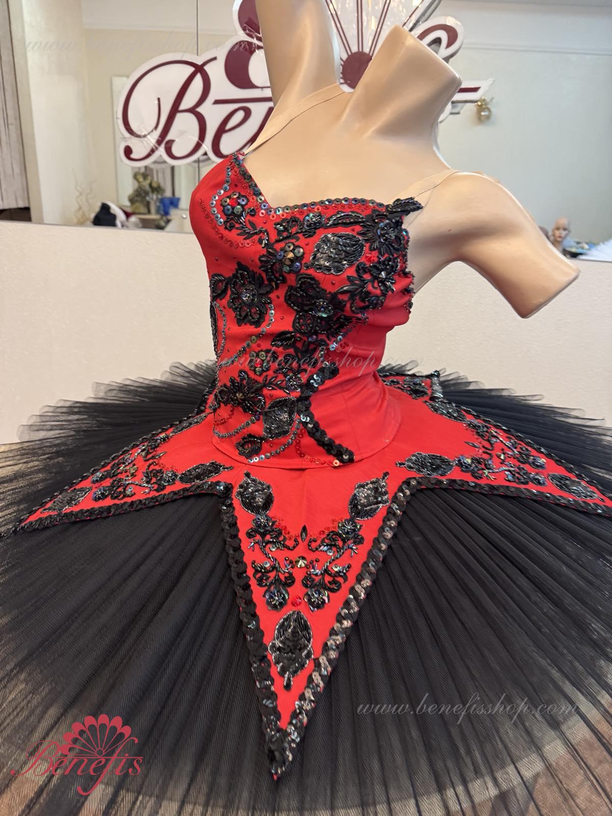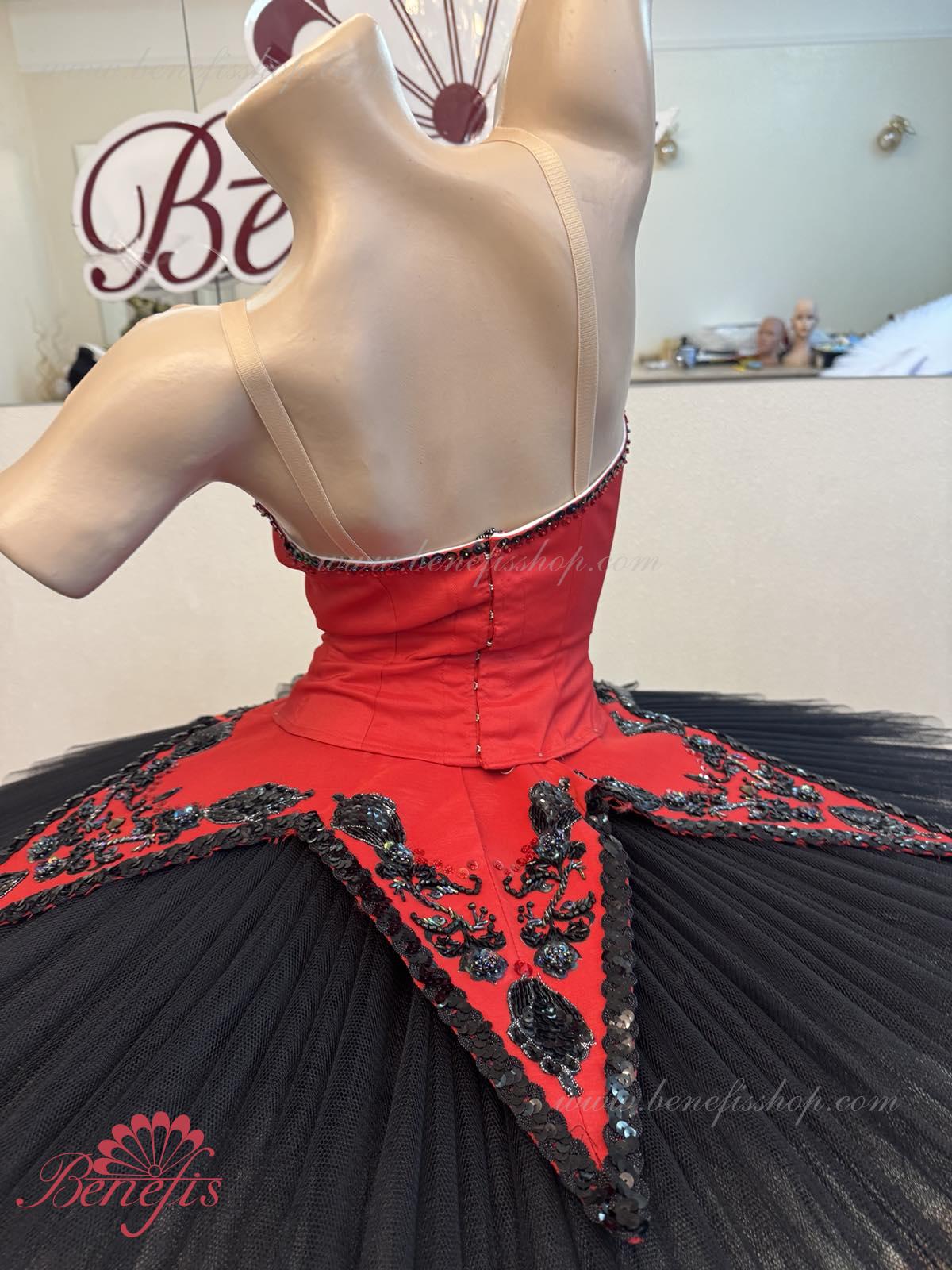 Costumul dat este executat intr-un mod strict conform baletului classic. Corsetul si partea superioara sunt executate din material semi – strench, tafta – strench cu putin luciu.Pe corset sunt prezente doua rindure de chirlige pentru regularea comoda. Ca decor sunt folosite dantele decorative ce sunt cusute manual cu diverse paiete, margele marunte si strase. Aplicatiile de pe corset sunt indeplinite asimetric si sunt asemanatoare unui ram de pe piept.