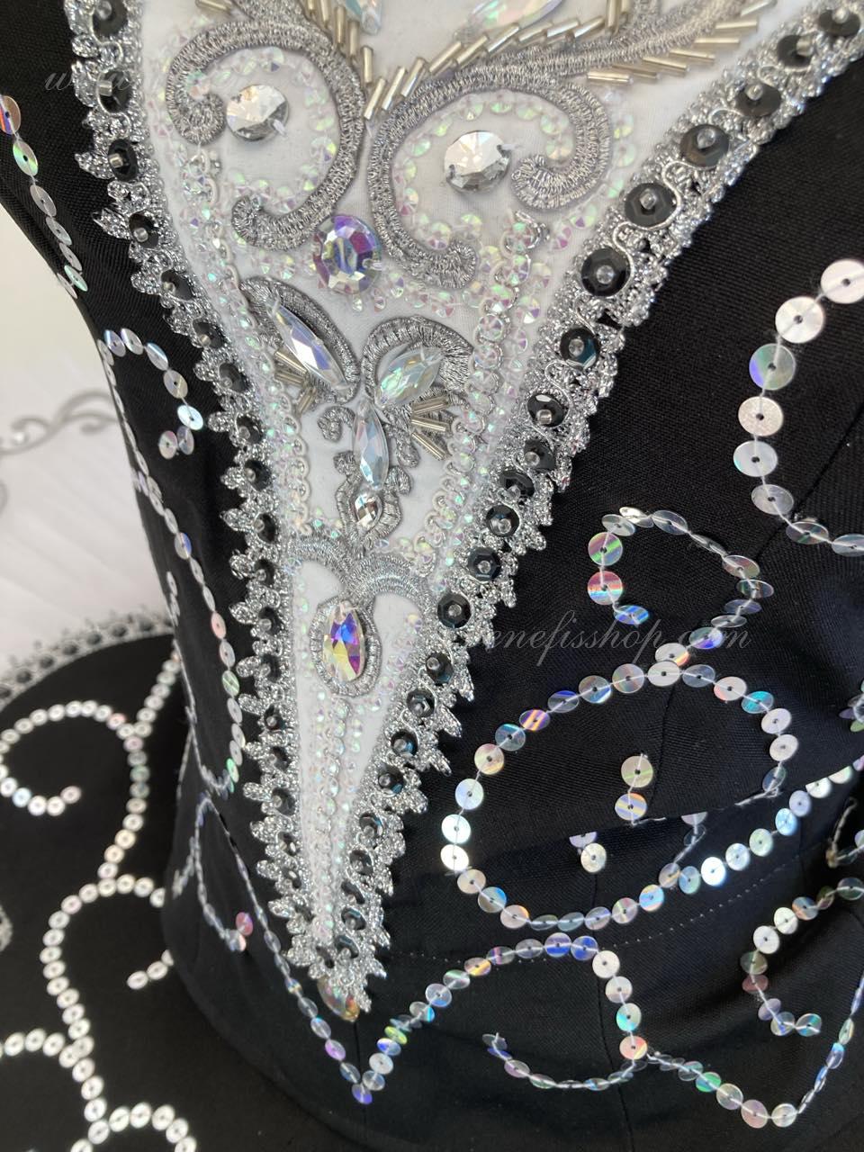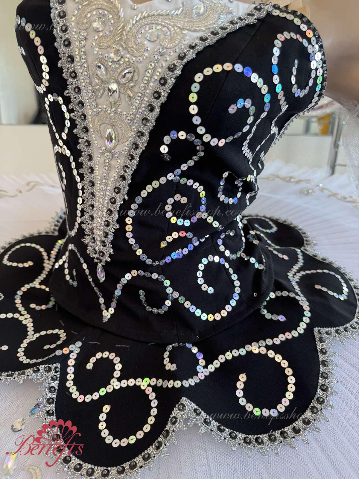 Stratul superior al fustei și inserția sunt decorate cu aplicații, o mulțime de margele, paiete și pietre.