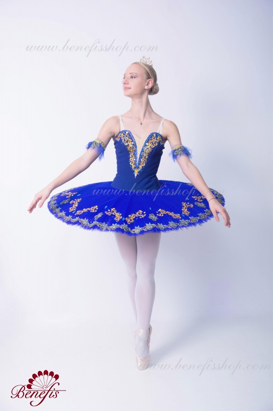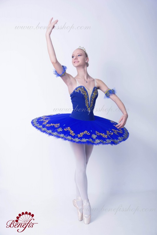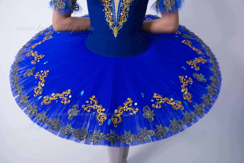 Этот профессиональный балетный костюм выполнен на основе базовой модели T0001B. Лиф выполнен на основе базовой модели T0009. Костюм украшен аппликациями, блестками, стеклянными бусами, стразами и тесьмой.