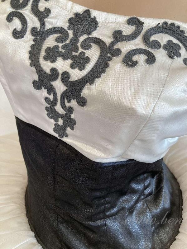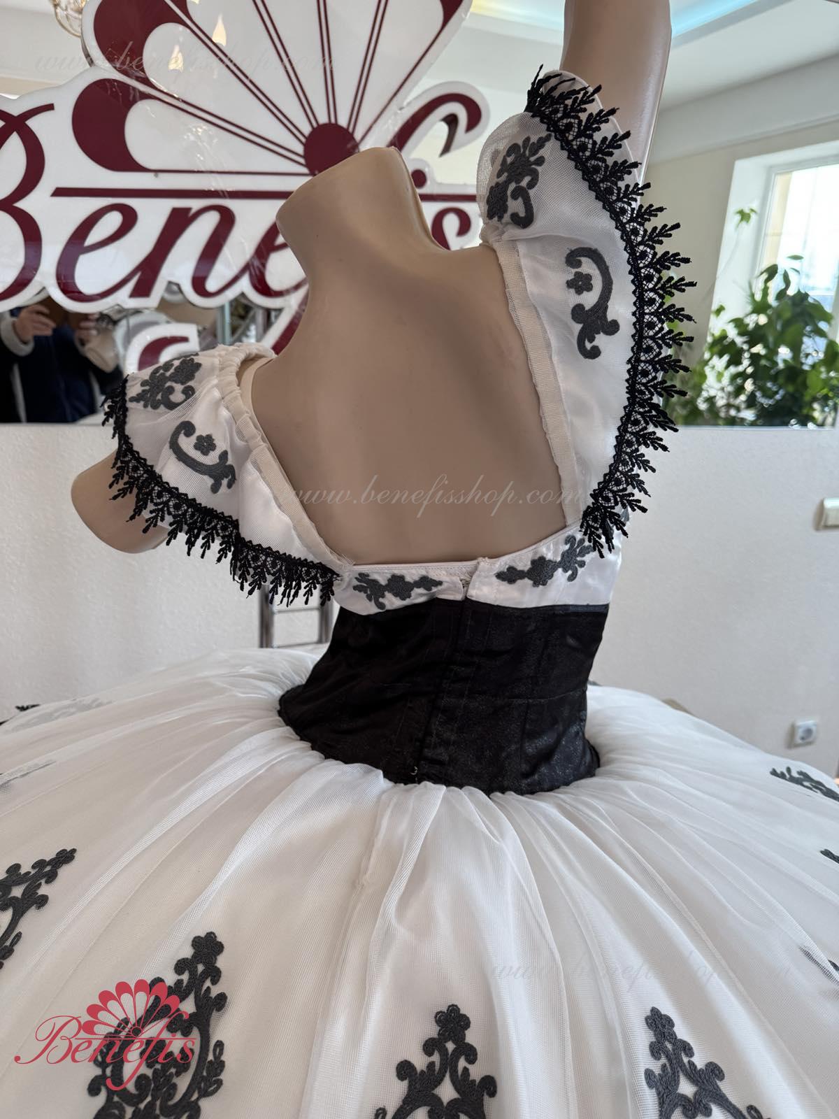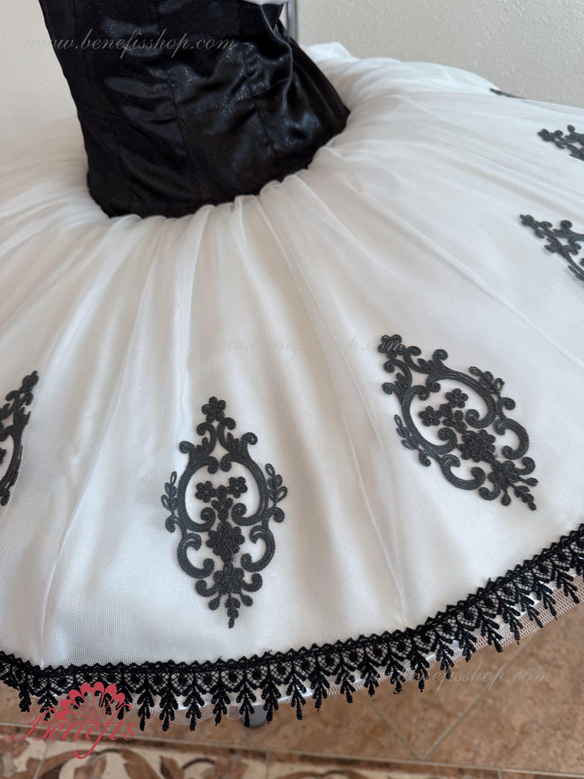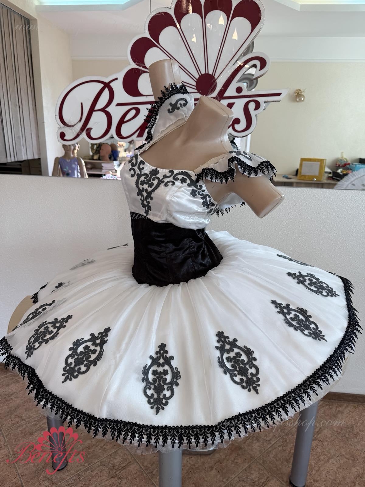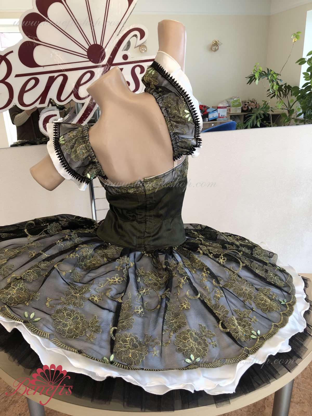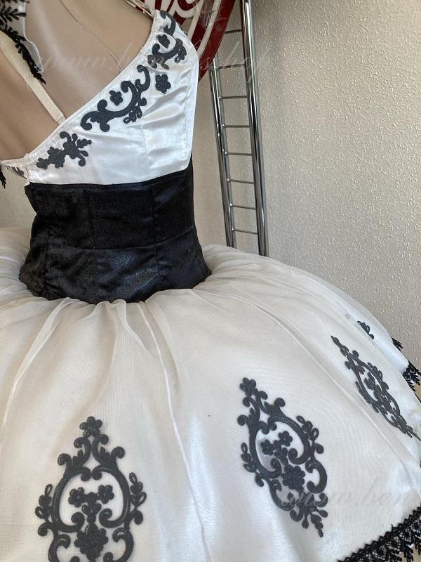 Детали: платье. Это профессиональный сценический балетный костюм. Лиф застегивается сзади на два ряда крючков. В области груди лиф застегивается внутренним шнуром в области груди. Базик основан на базовой модели T0001r из легкого мягкого и жесткого тюля. В качестве декора используются аппликации, кружевная тесьма.