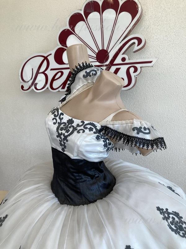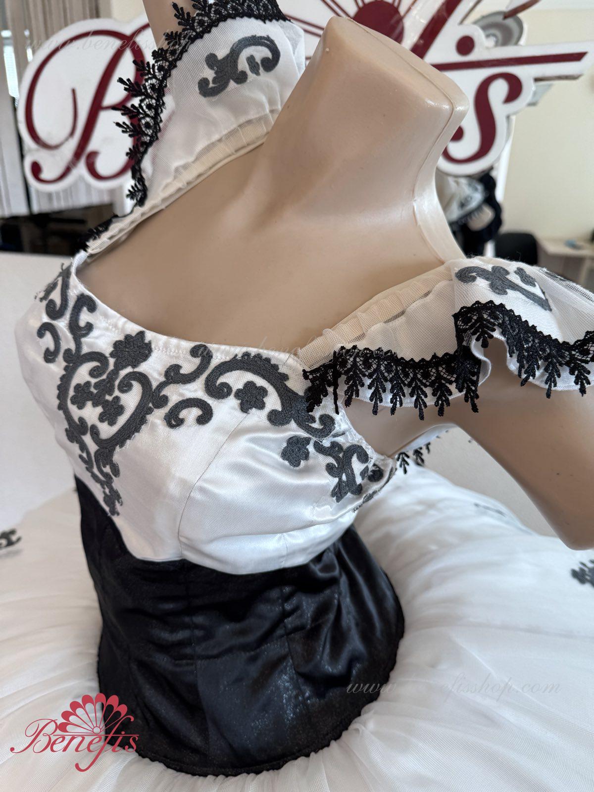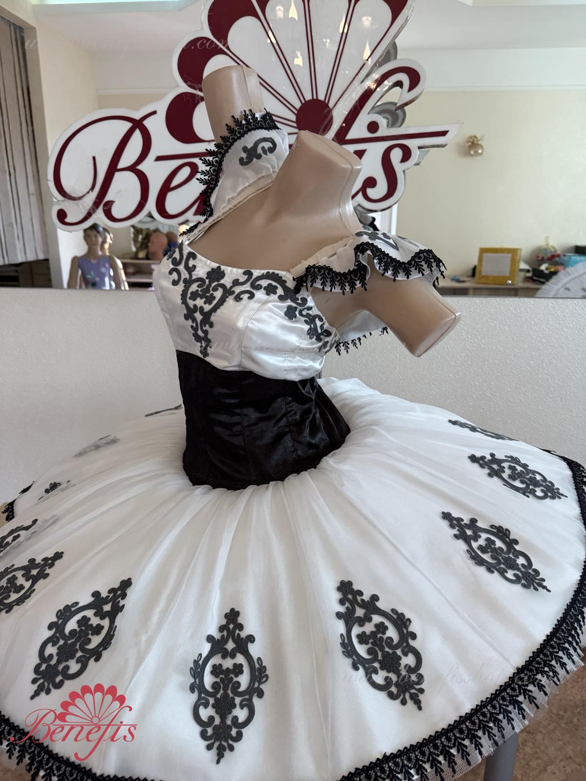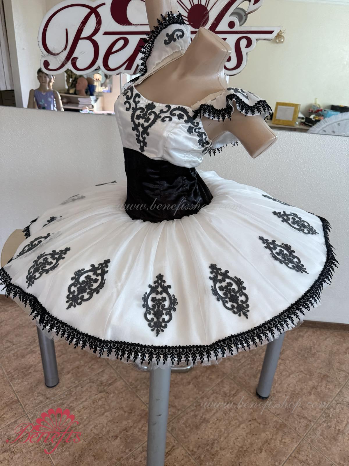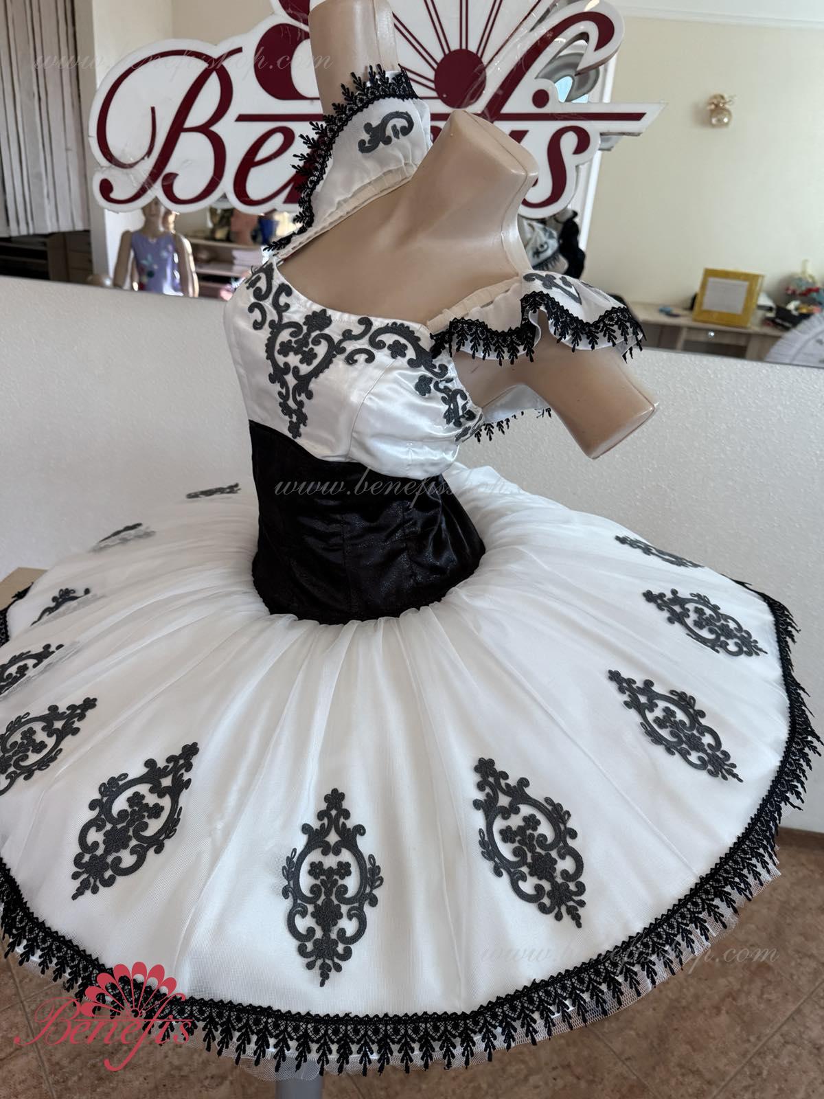 Детали: платье. Это профессиональный сценический балетный костюм. Лиф застегивается сзади на два ряда крючков. В области груди лиф застегивается внутренним шнуром в области груди. Базик основан на базовой модели T0001r из легкого мягкого и жесткого тюля. В качестве декора используются аппликации, кружевная тесьма.