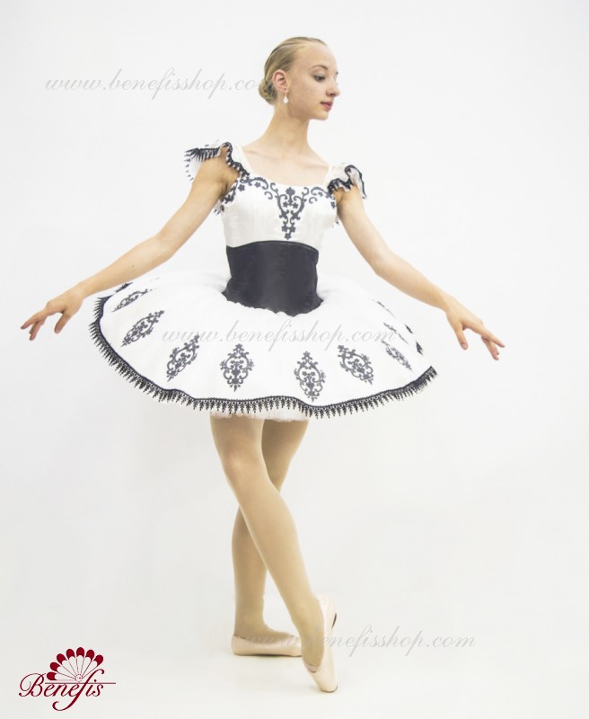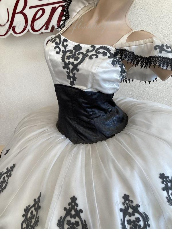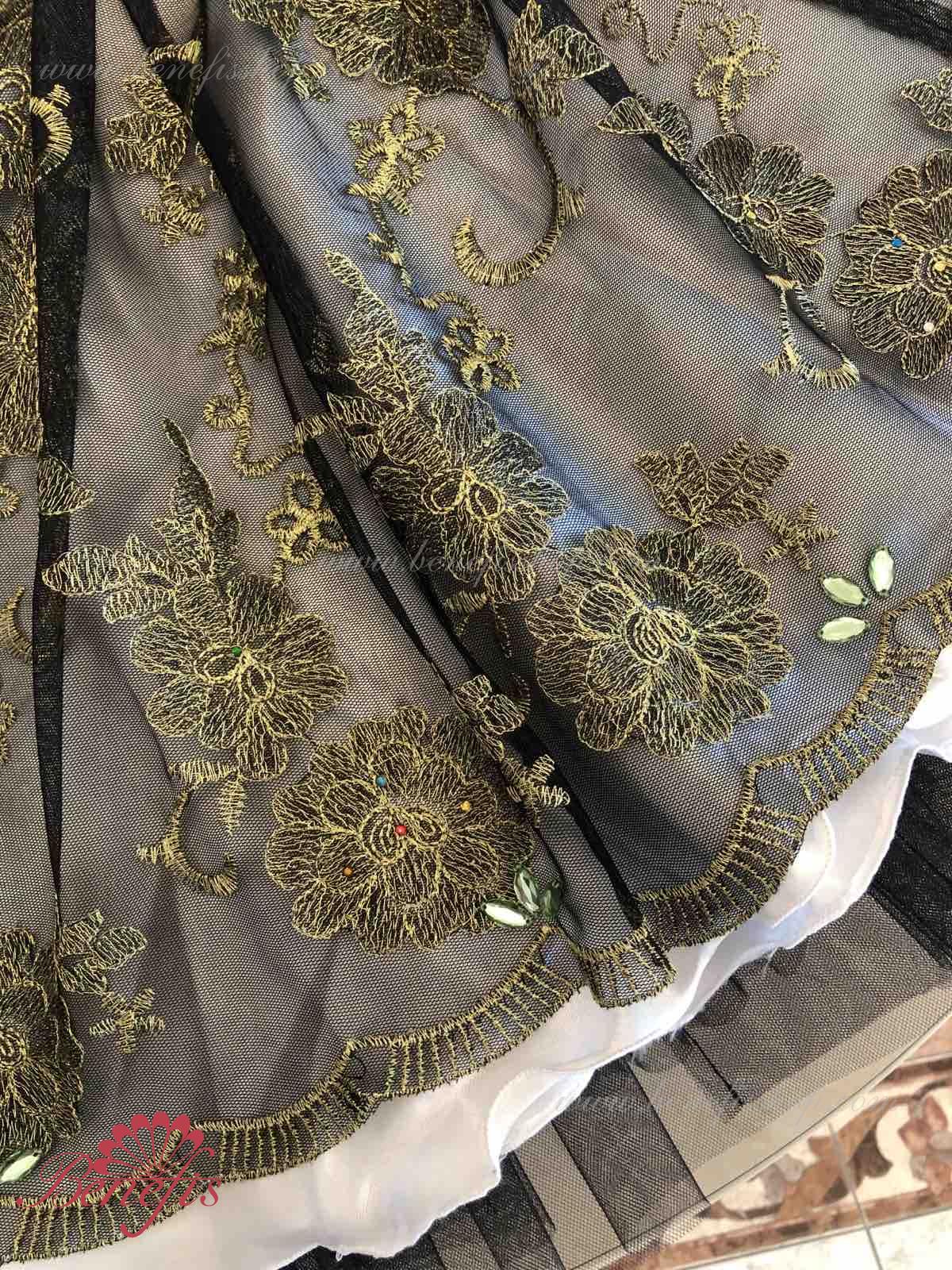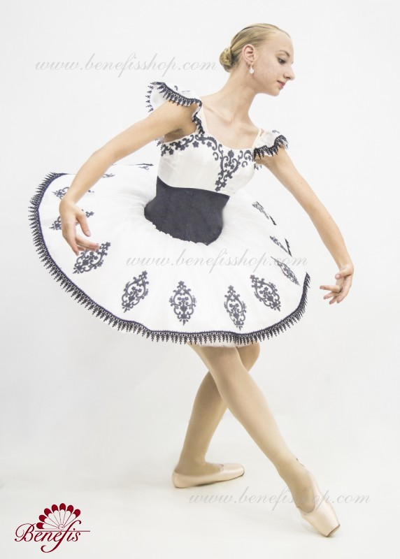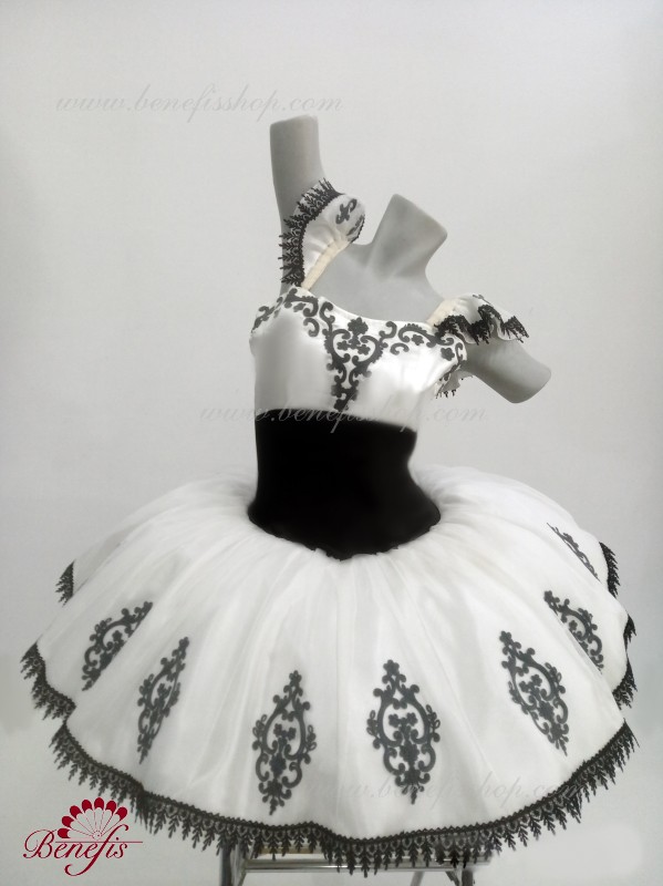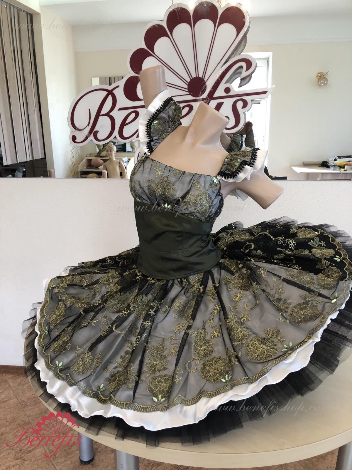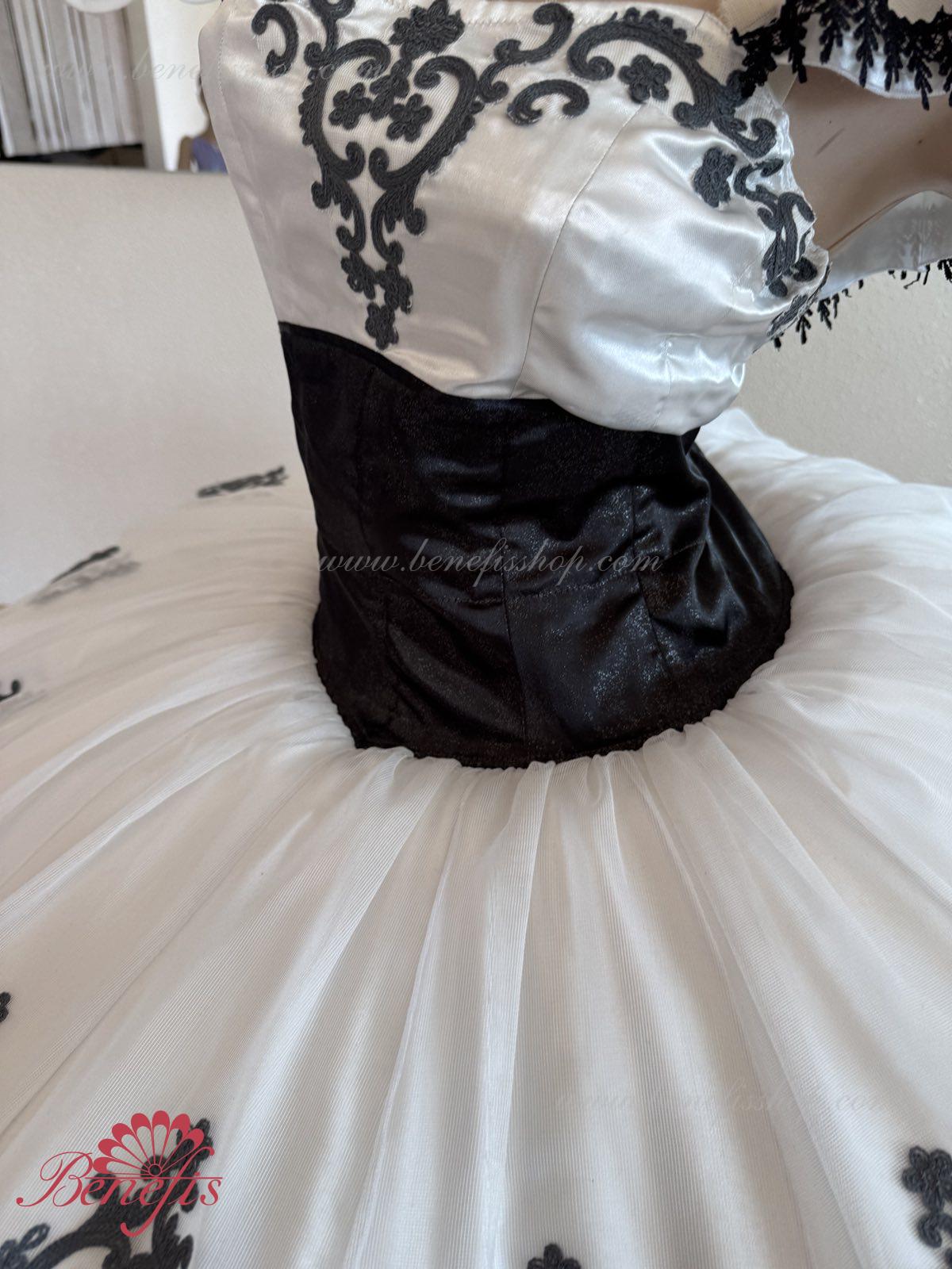 Детали: платье. Это профессиональный сценический балетный костюм. Лиф застегивается сзади на два ряда крючков. В области груди лиф застегивается внутренним шнуром в области груди. Базик основан на базовой модели T0001r из легкого мягкого и жесткого тюля. В качестве декора используются аппликации, кружевная тесьма.