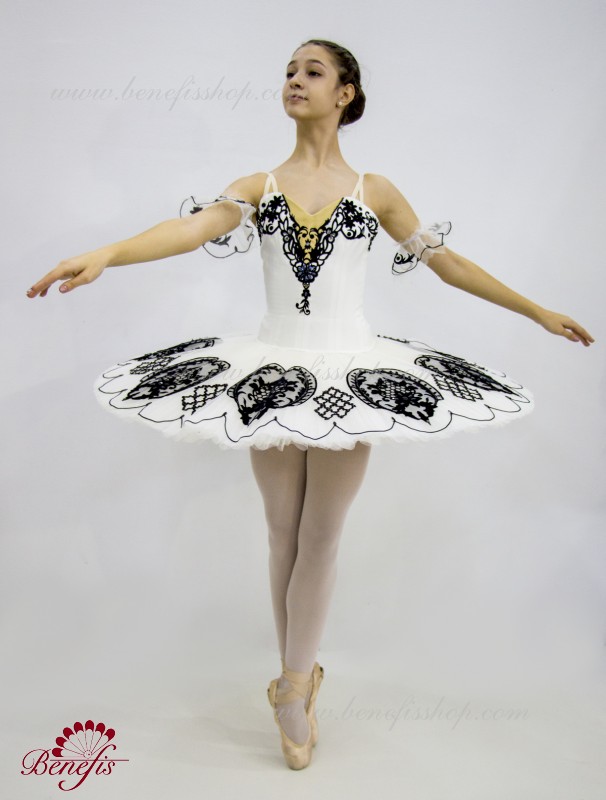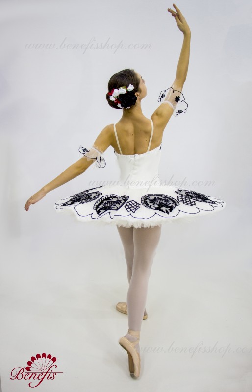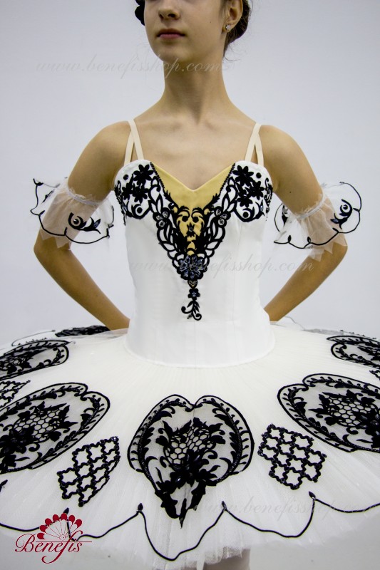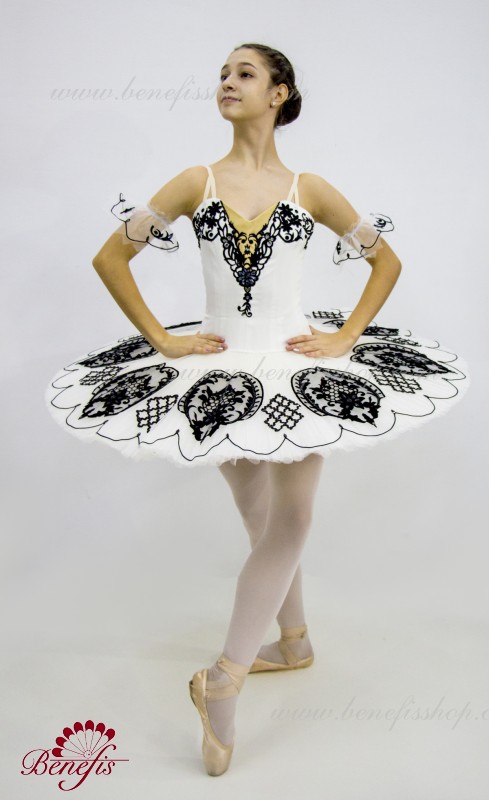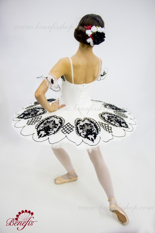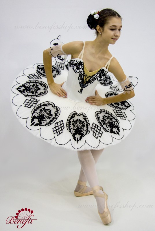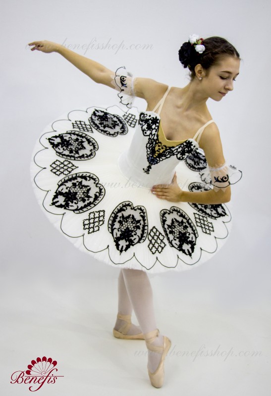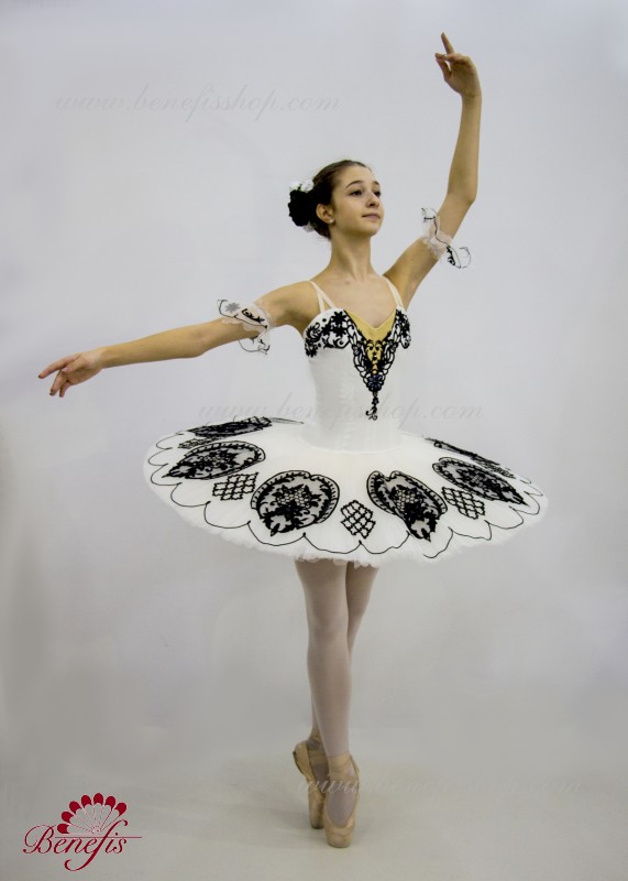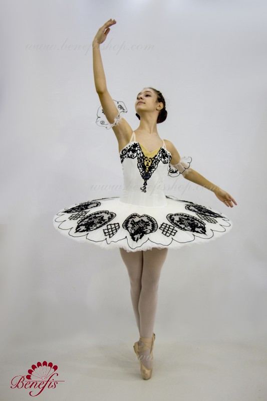 Т 0009 на эластичных лямках и с телесной вставкой на груди, выполнен из плотной полу эластичной ткани. Лиф застегивается на крючки в два ряда, для удобного регулирования, внутренний шнур служит для затягивания лифа в области груди. Низ изделия основан на пачке Т 0001В, который в свою очередь состоит из восьми слоев разной длины, посаженых на трусики с кокеткой, внутренний обруч внедрен в средние слои пачки. В качестве декора служит блесточная тесьма, аппликации, стразы и камни. Костюм может быть выполнен в любом цвете по