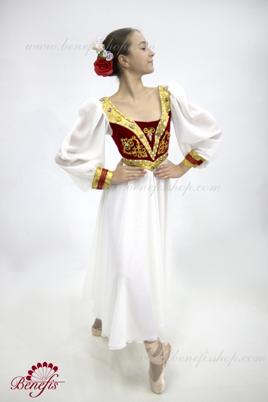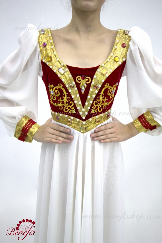 Детали: платье. Это профессиональное, балетное, сценическое платье. Лиф с плечевыми швами застегивается сзади на два ряда крючков и затягивается внутренним шнуром в области спинки. Пышные рукава и легкая юбка придают изящность всему костюму. В качестве декора используется тесьма, аппликации, стразы, бусы и камни .
