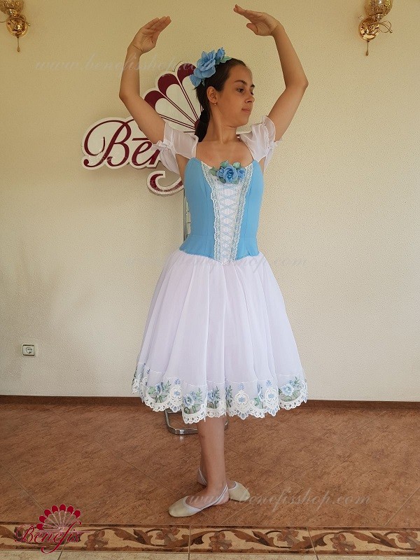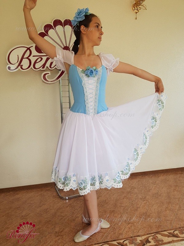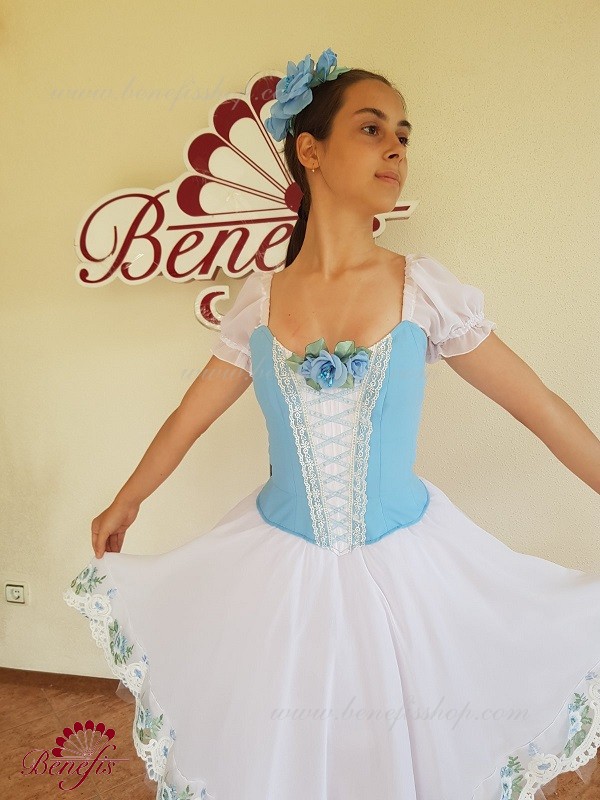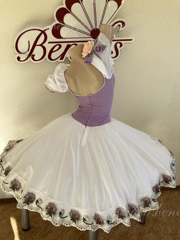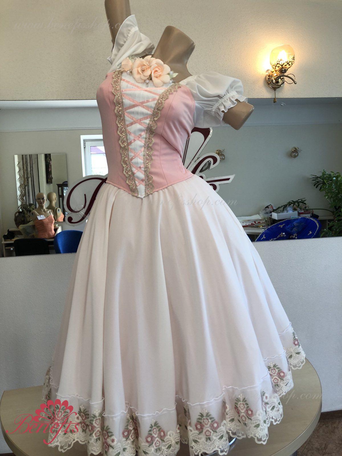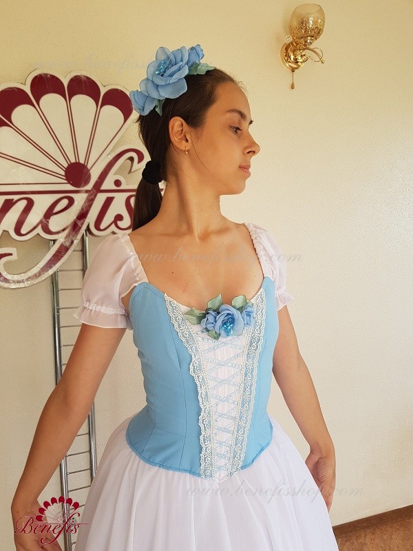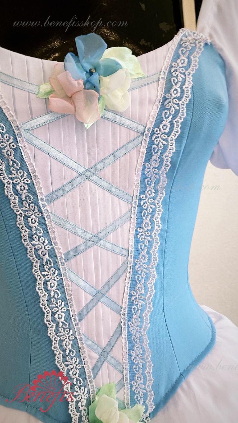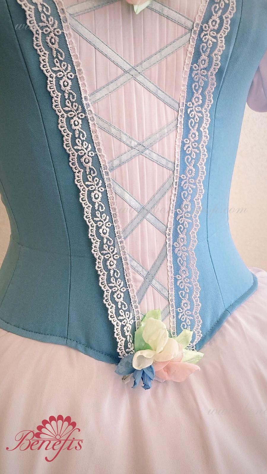 Сценический костюм выполнен на основе профессиональной романтической юбки состоящий из 3-х слоев фатина, которые покрываются легким шифоном с кружевом. Лиф выполняется из плотной ткани с декоративной шнуровкой спереди. Линия вставки по груди оторочена кружевом. Лиф застегивается на крючки в два ряда для удобного регулирования, а внутренний шнур служит для затягивания лифа в области груди. К телесным лямкам пришиты рукава-фонарики из шифона.