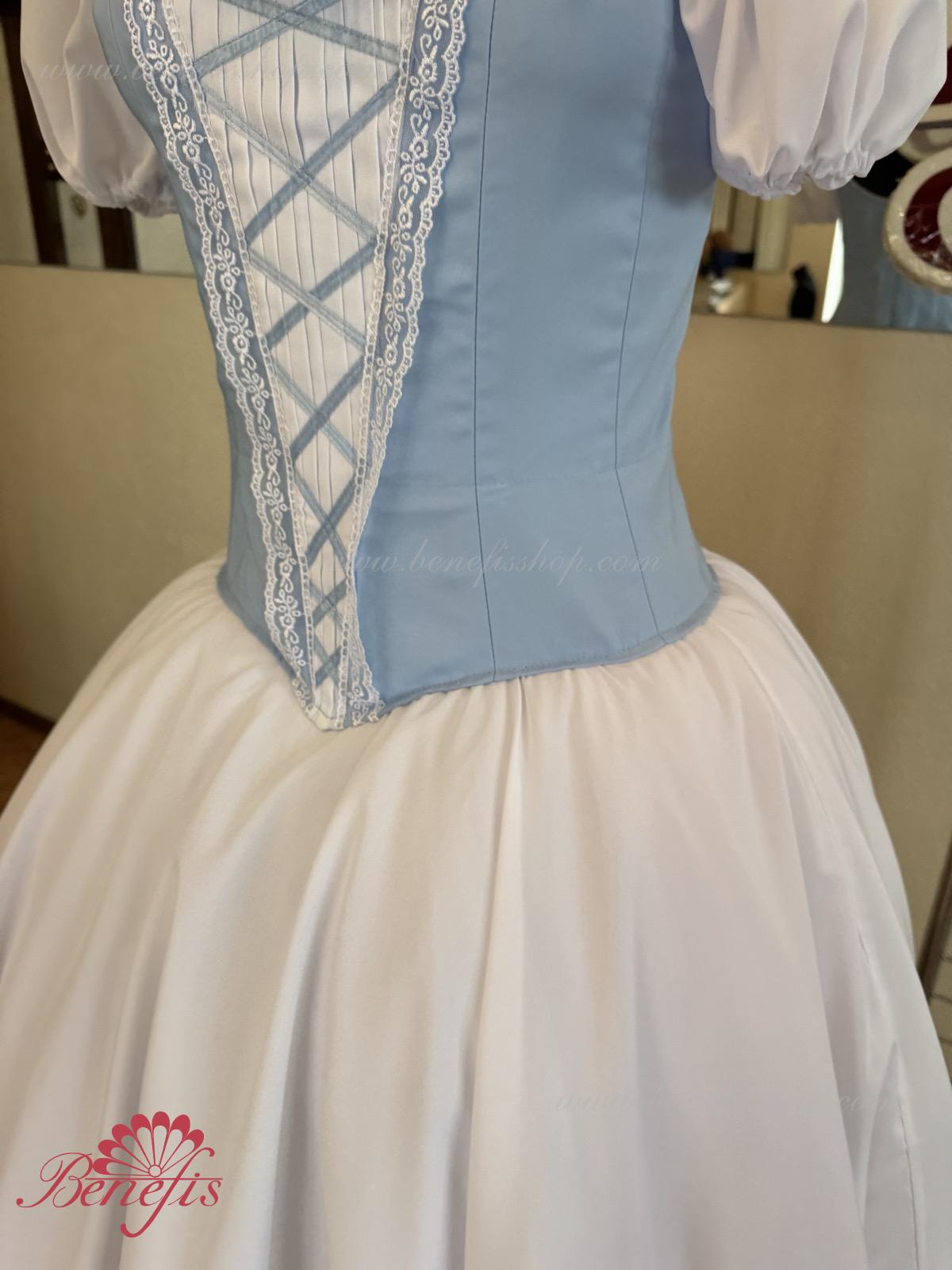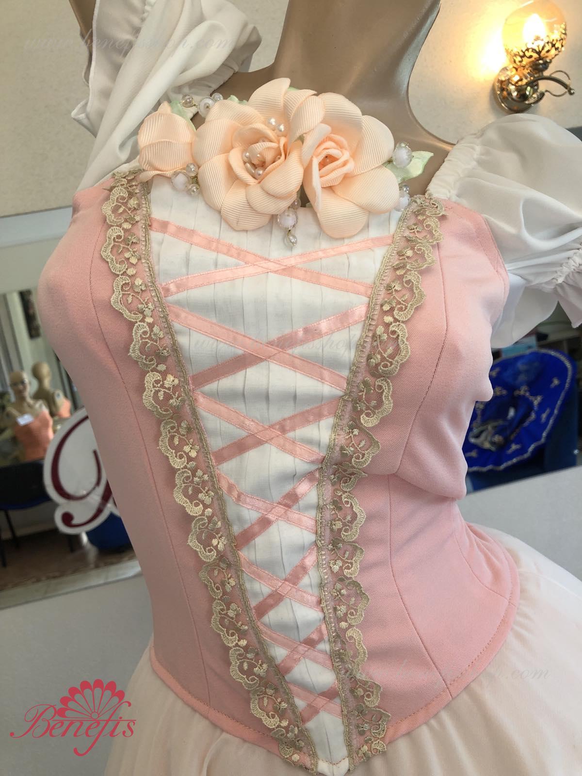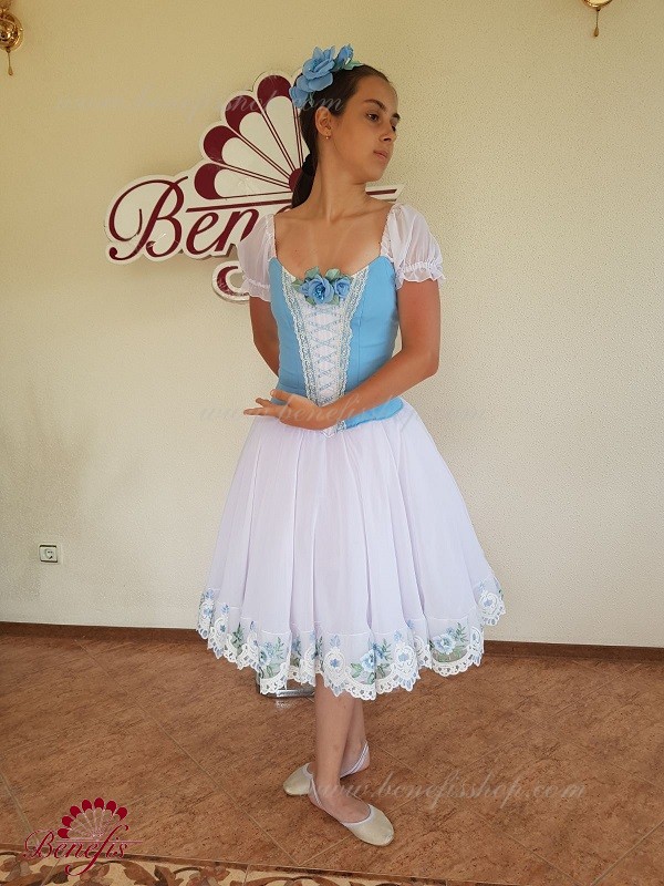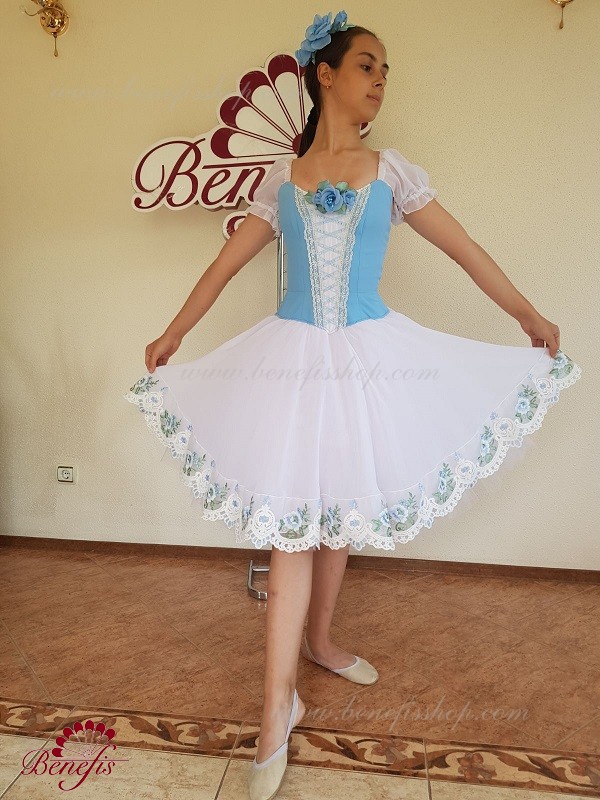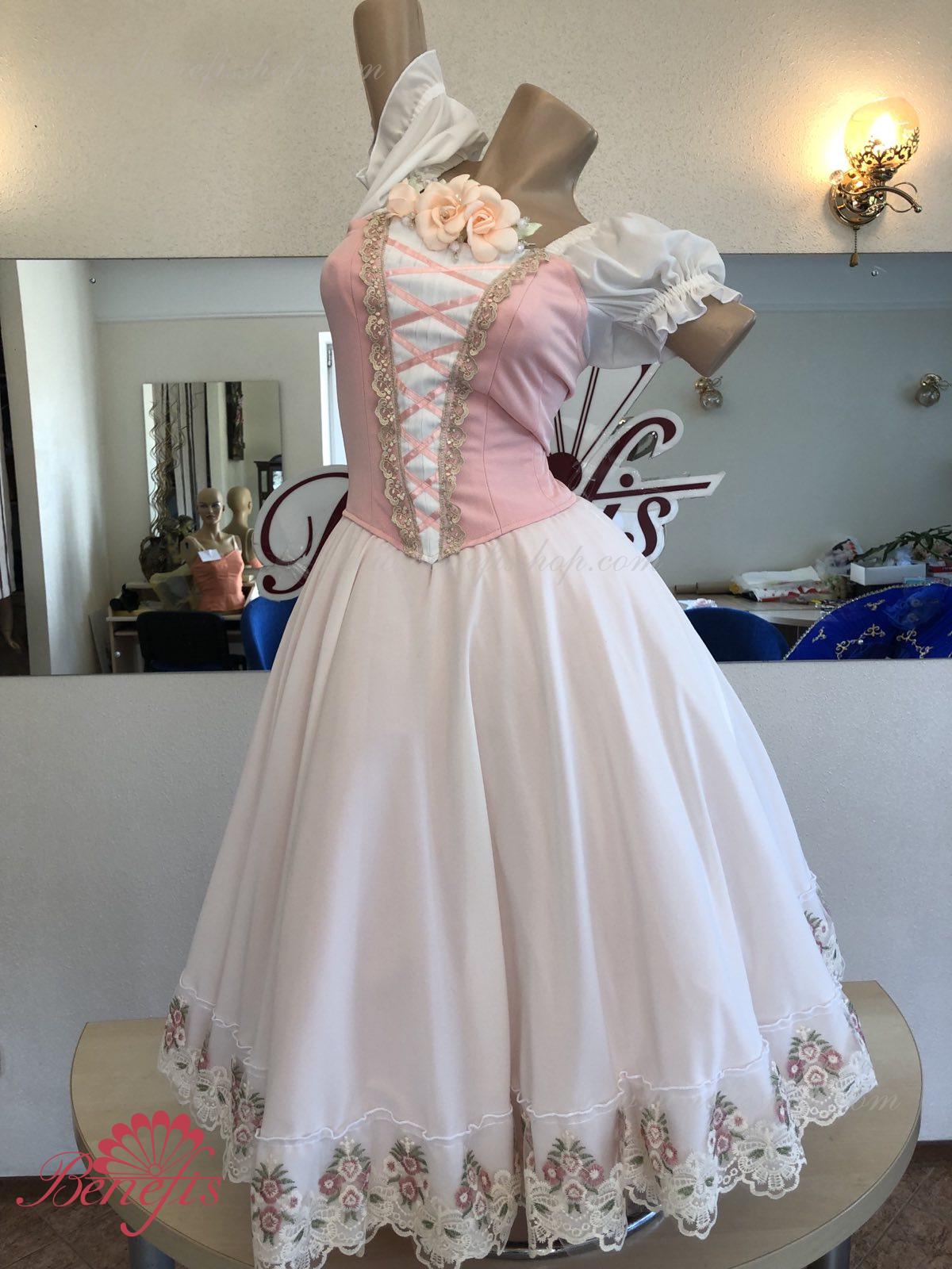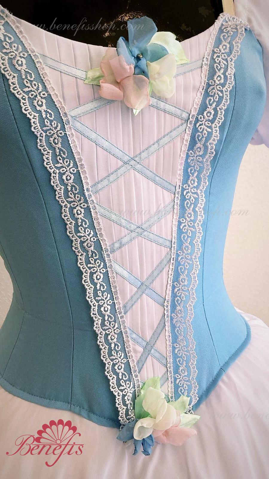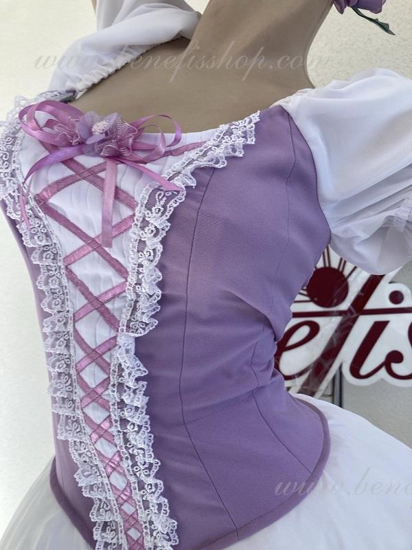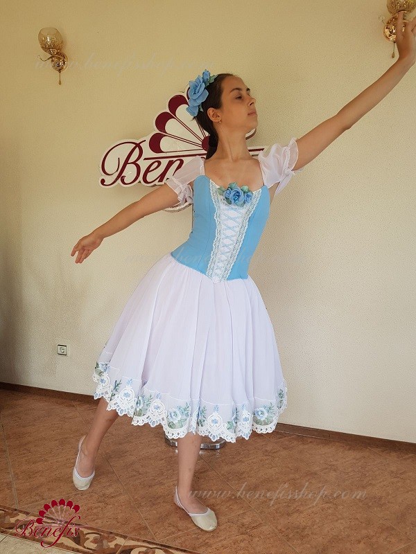 Сценический костюм выполнен на основе профессиональной романтической юбки состоящий из 3-х слоев фатина, которые покрываются легким шифоном с кружевом. Лиф выполняется из плотной ткани с декоративной шнуровкой спереди. Линия вставки по груди оторочена кружевом. Лиф застегивается на крючки в два ряда для удобного регулирования, а внутренний шнур служит для затягивания лифа в области груди. К телесным лямкам пришиты рукава-фонарики из шифона.