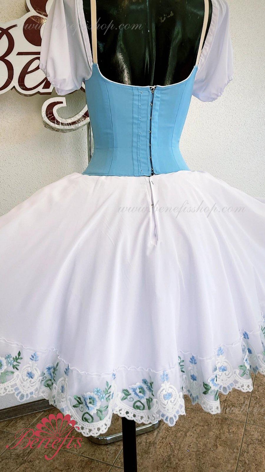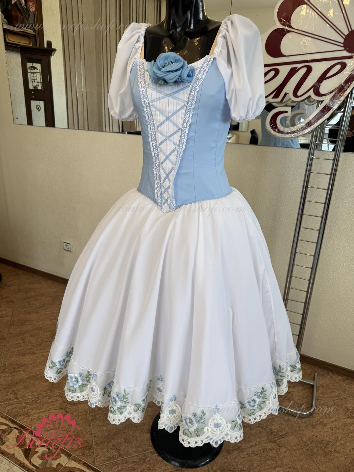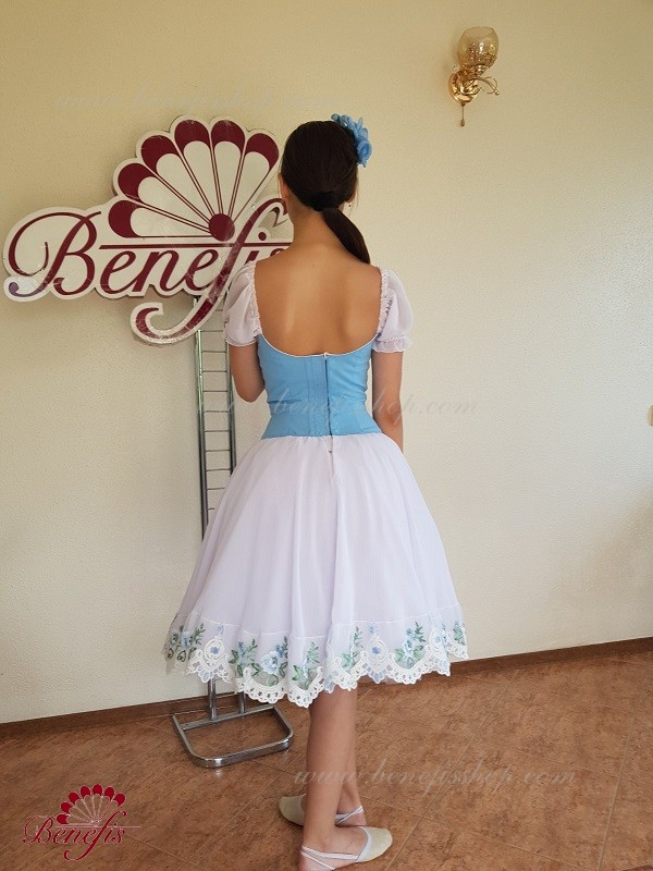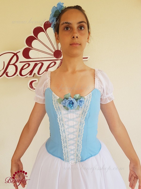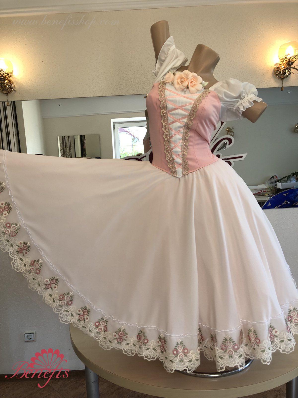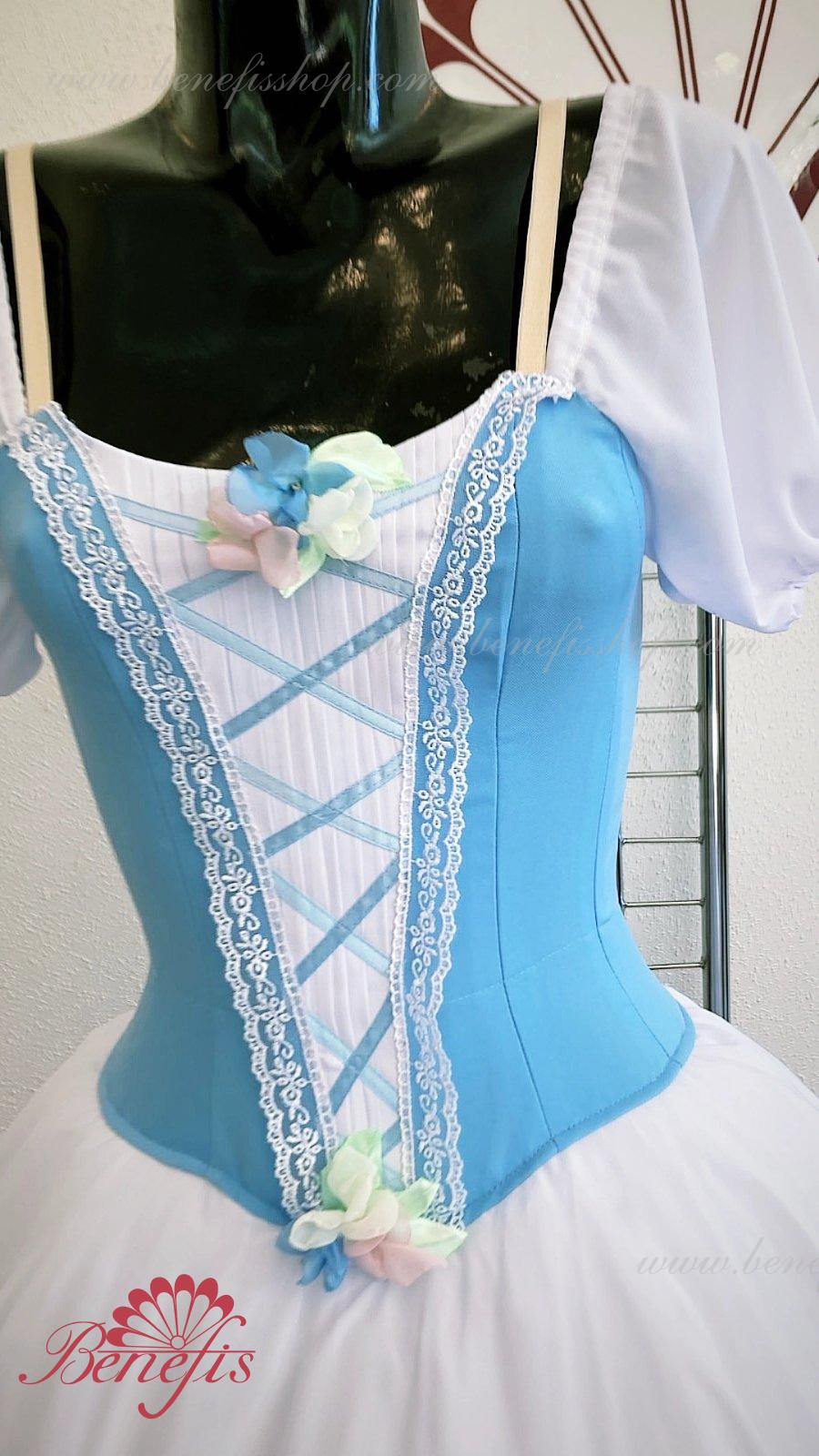 Сценический костюм выполнен на основе профессиональной романтической юбки состоящий из 3-х слоев фатина, которые покрываются легким шифоном с кружевом. Лиф выполняется из плотной ткани с декоративной шнуровкой спереди. Линия вставки по груди оторочена кружевом. Лиф застегивается на крючки в два ряда для удобного регулирования, а внутренний шнур служит для затягивания лифа в области груди. К телесным лямкам пришиты рукава-фонарики из шифона.