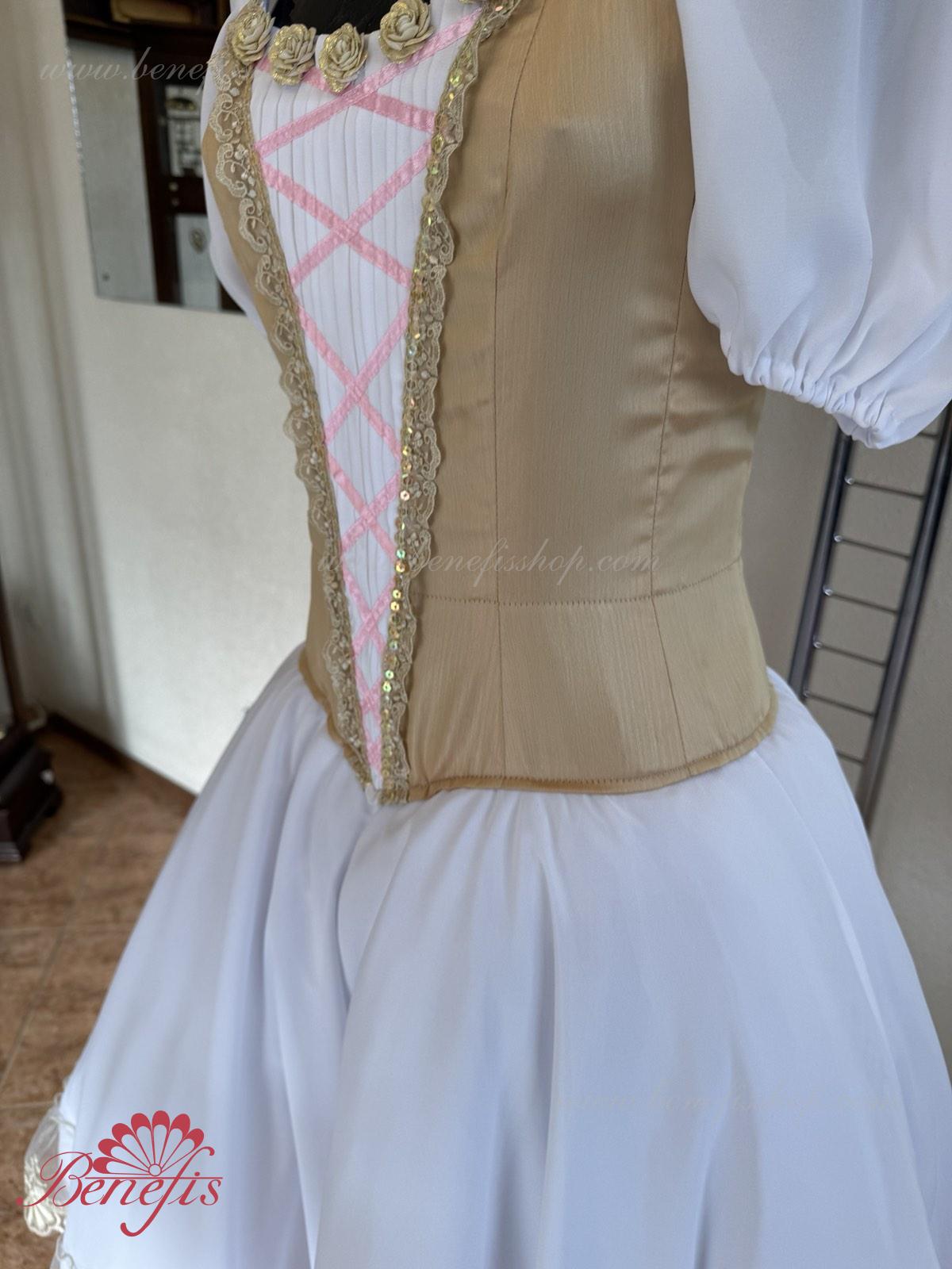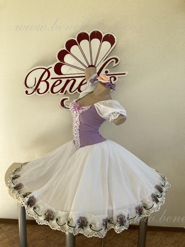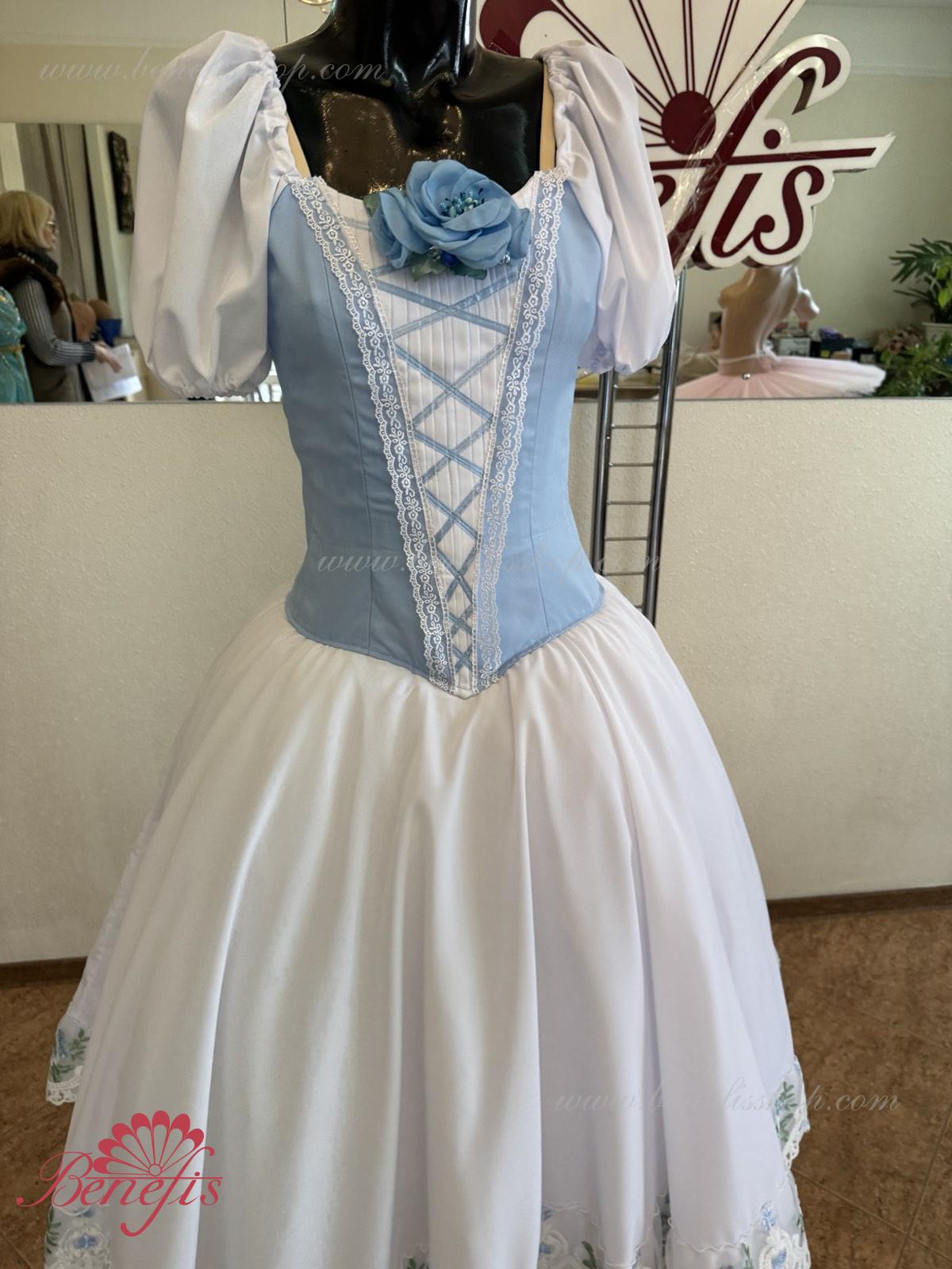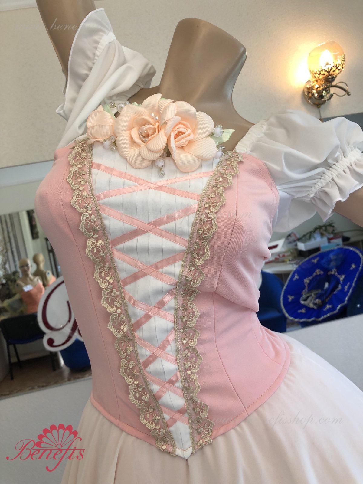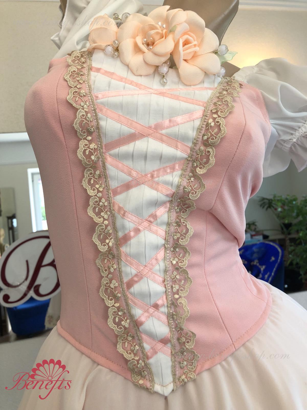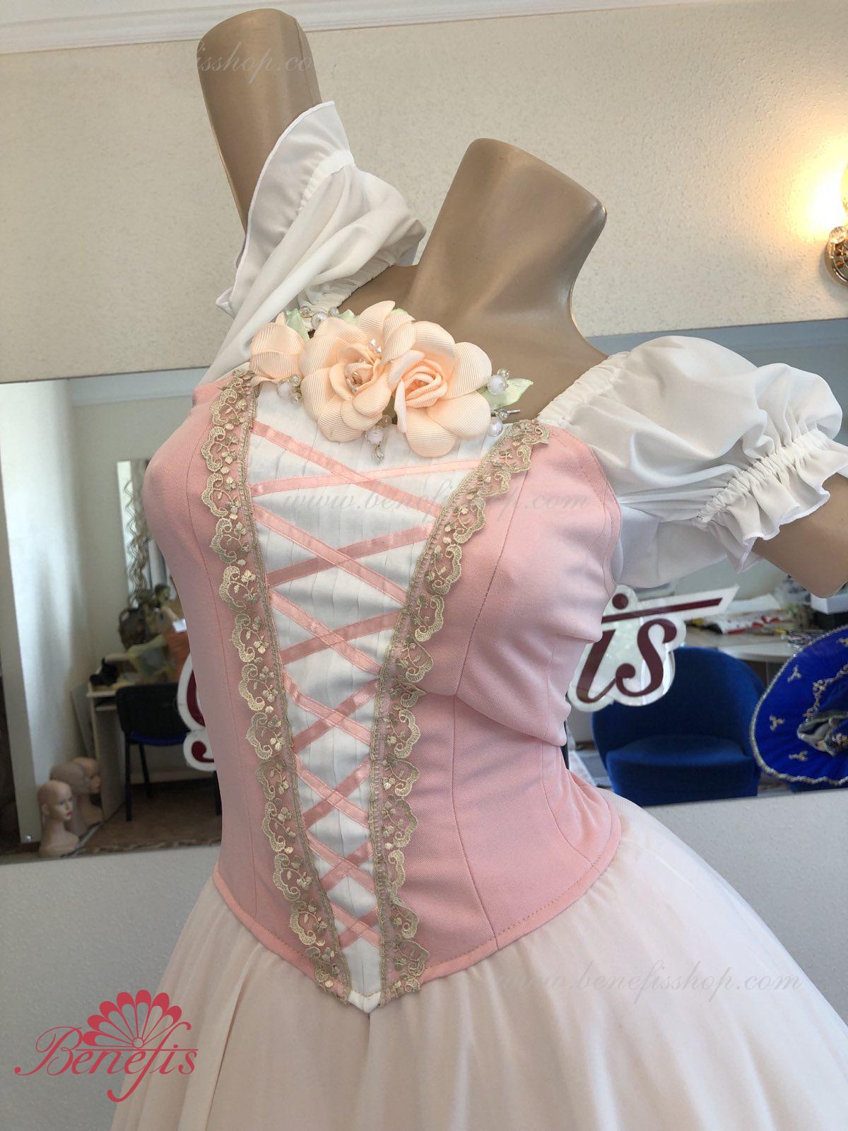 Сценический костюм выполнен на основе профессиональной романтической юбки состоящий из 3-х слоев фатина, которые покрываются легким шифоном с кружевом. Лиф выполняется из плотной ткани с декоративной шнуровкой спереди. Линия вставки по груди оторочена кружевом. Лиф застегивается на крючки в два ряда для удобного регулирования, а внутренний шнур служит для затягивания лифа в области груди. К телесным лямкам пришиты рукава-фонарики из шифона.