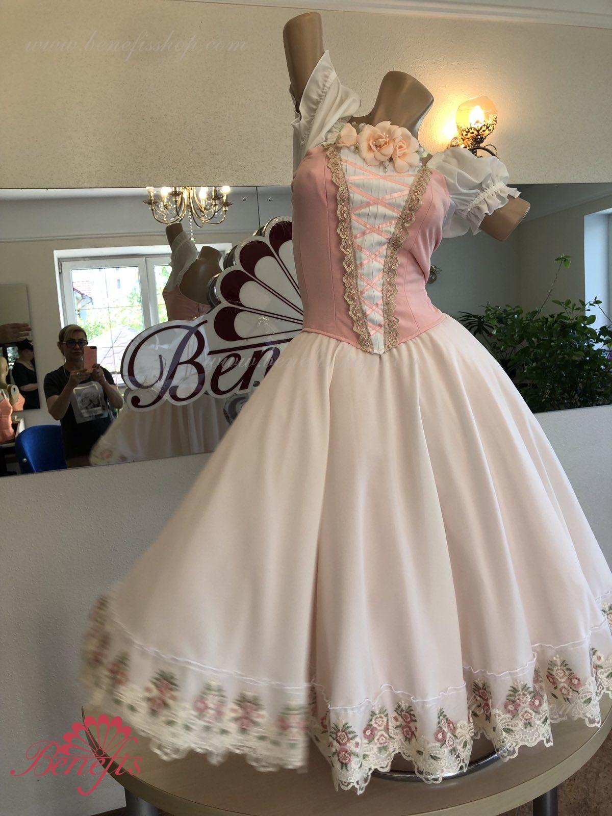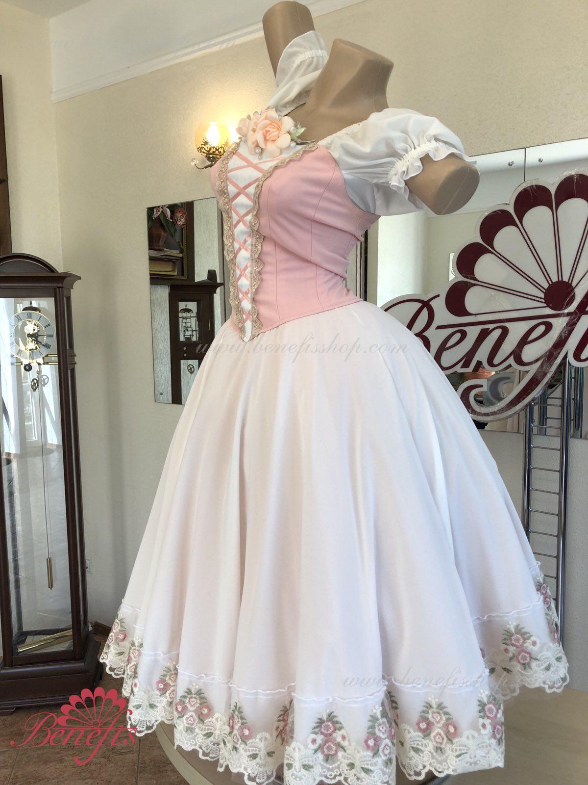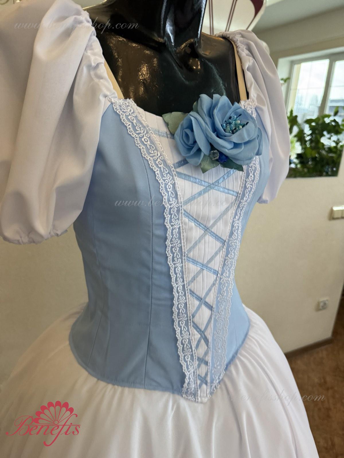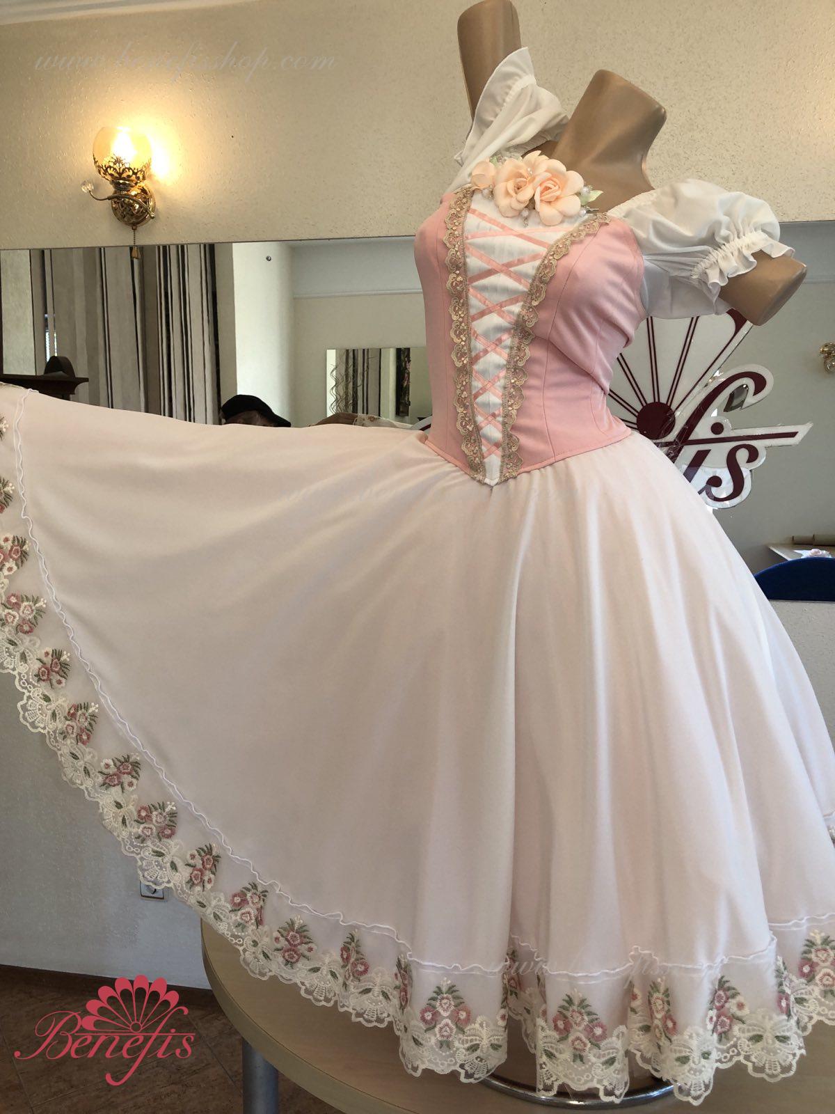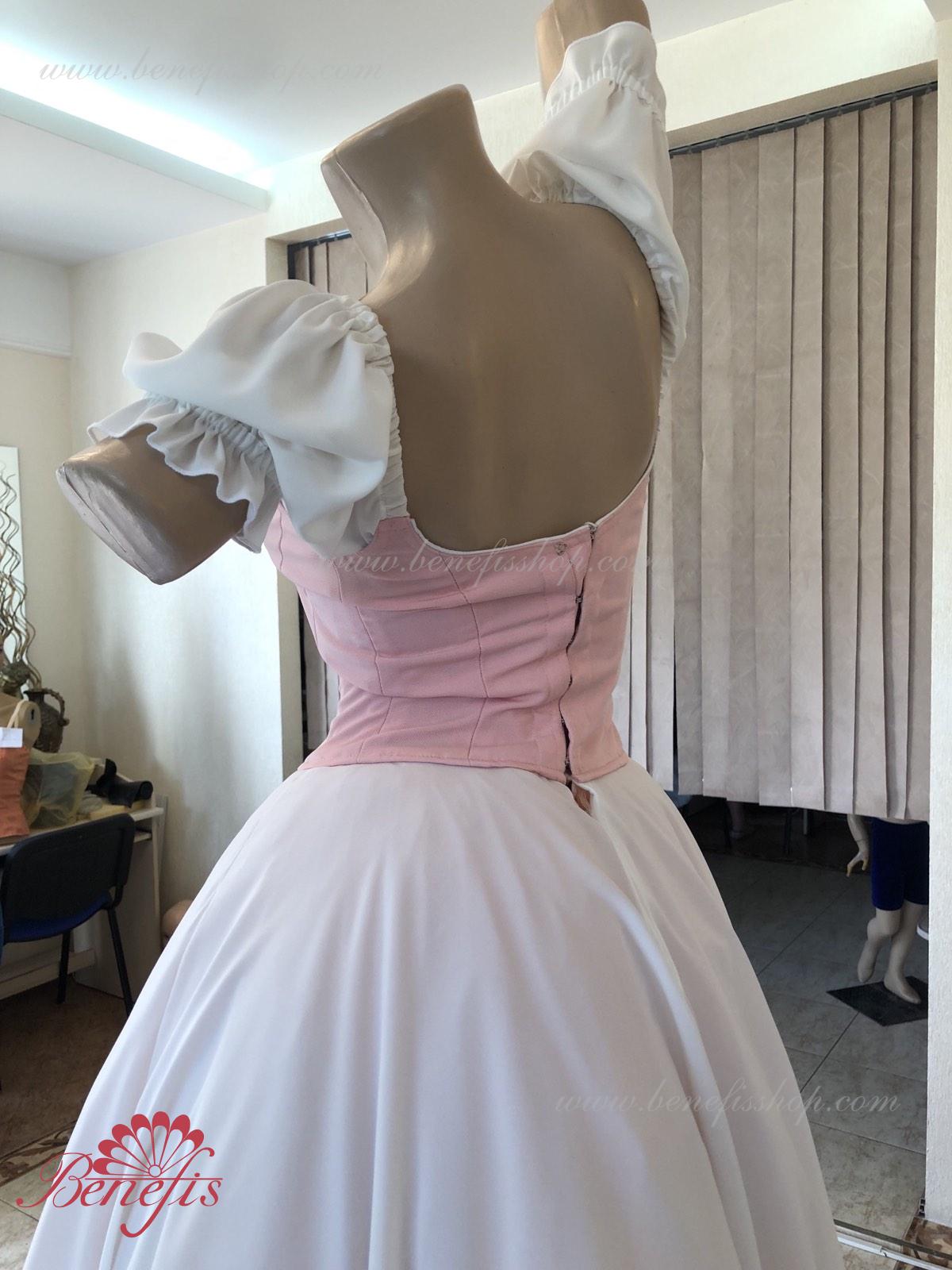 Сценический костюм выполнен на основе профессиональной романтической юбки состоящий из 3-х слоев фатина, которые покрываются легким шифоном с кружевом. Лиф выполняется из плотной ткани с декоративной шнуровкой спереди. Линия вставки по груди оторочена кружевом. Лиф застегивается на крючки в два ряда для удобного регулирования, а внутренний шнур служит для затягивания лифа в области груди. К телесным лямкам пришиты рукава-фонарики из шифона.