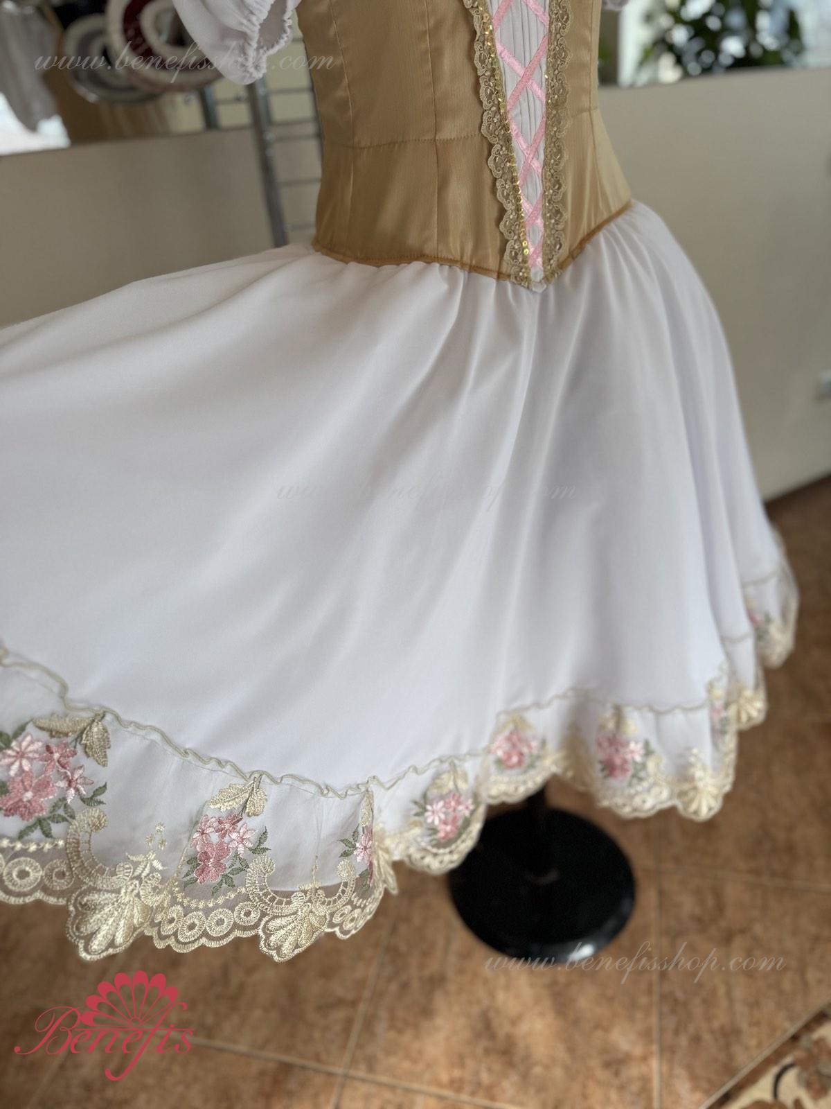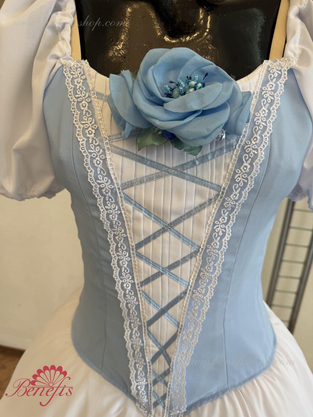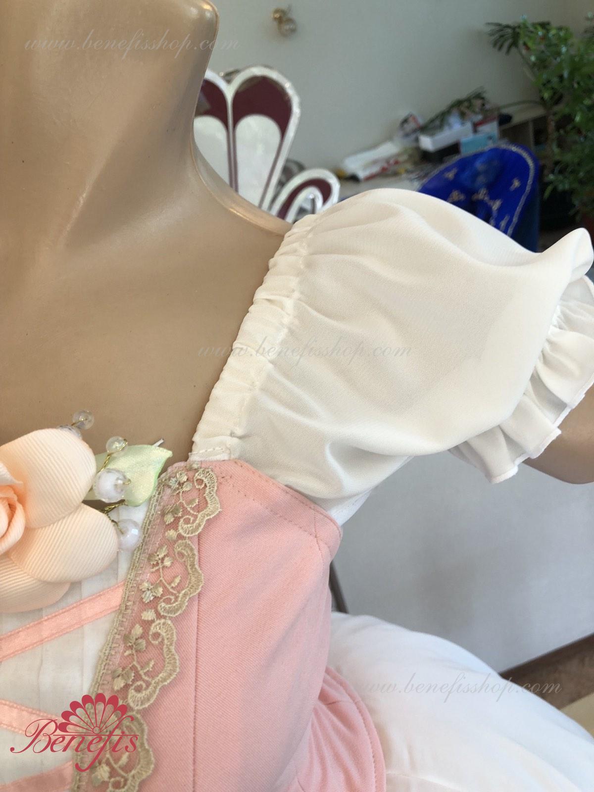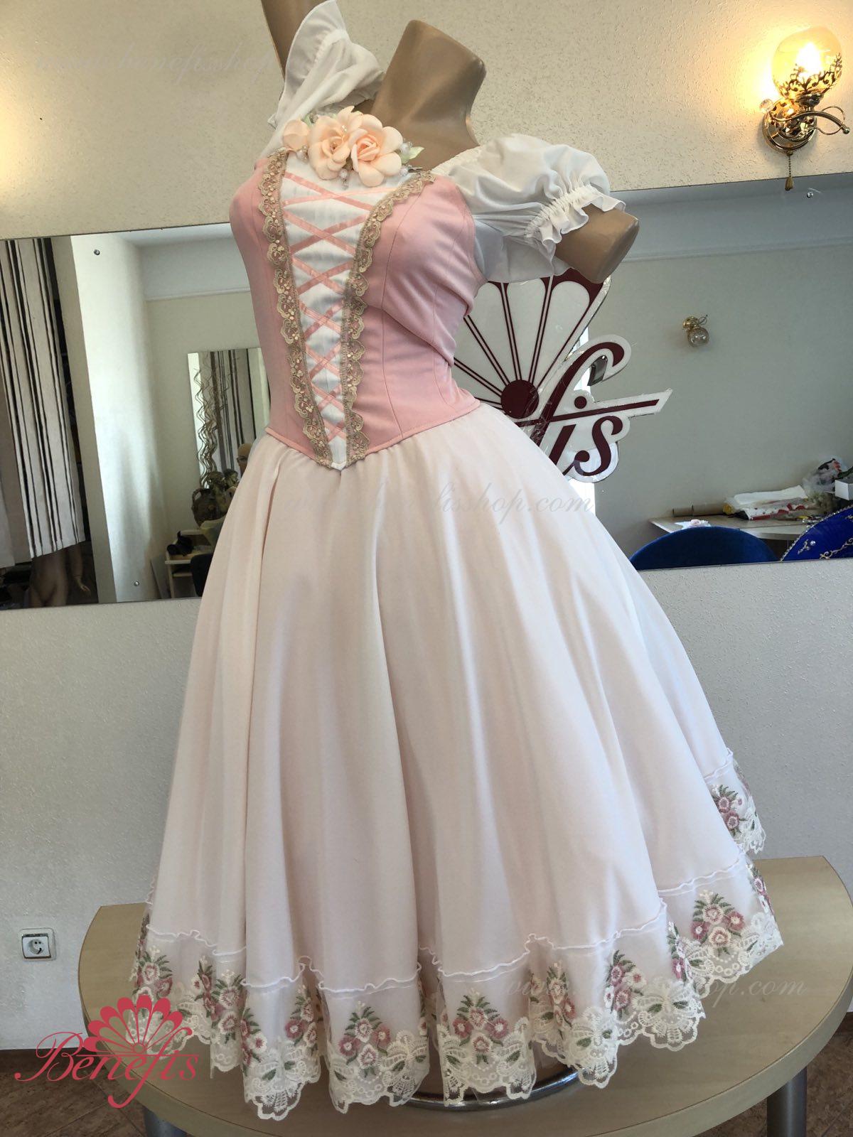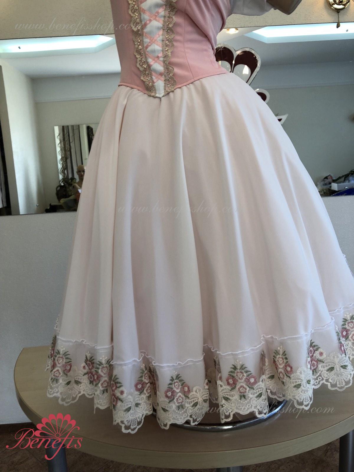 Сценический костюм выполнен на основе профессиональной романтической юбки состоящий из 3-х слоев фатина, которые покрываются легким шифоном с кружевом. Лиф выполняется из плотной ткани с декоративной шнуровкой спереди. Линия вставки по груди оторочена кружевом. Лиф застегивается на крючки в два ряда для удобного регулирования, а внутренний шнур служит для затягивания лифа в области груди. К телесным лямкам пришиты рукава-фонарики из шифона.