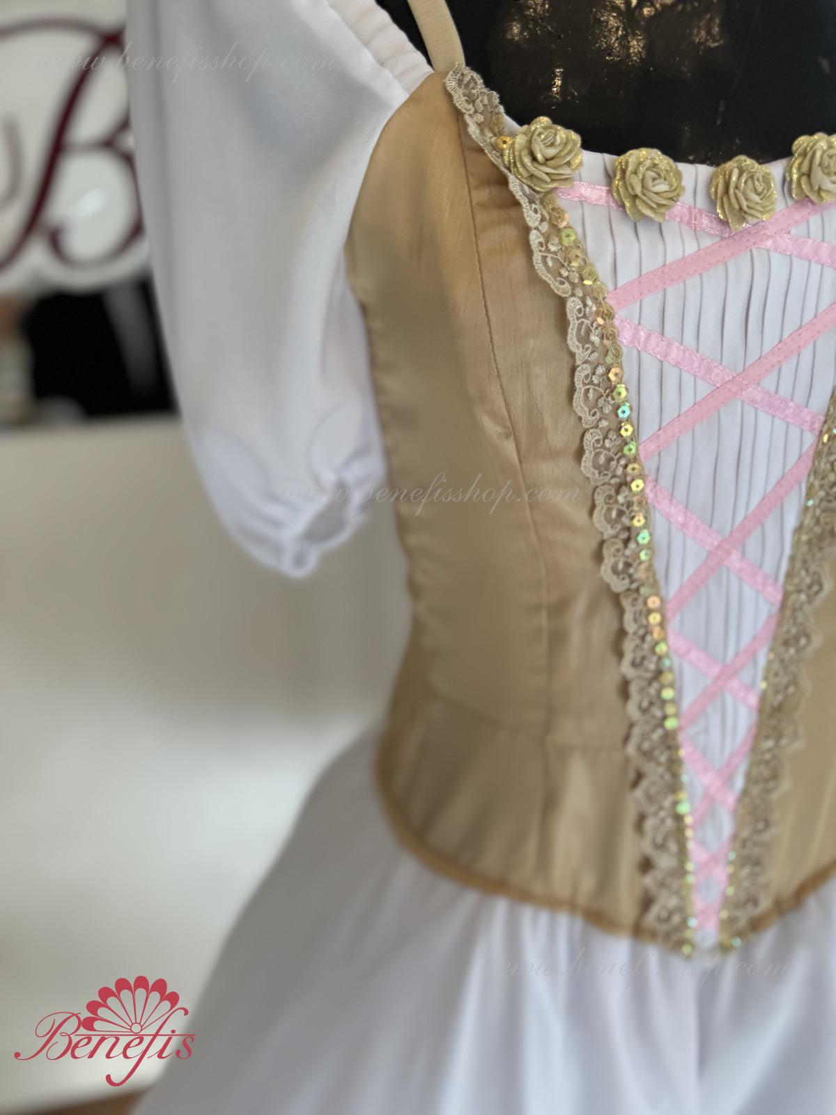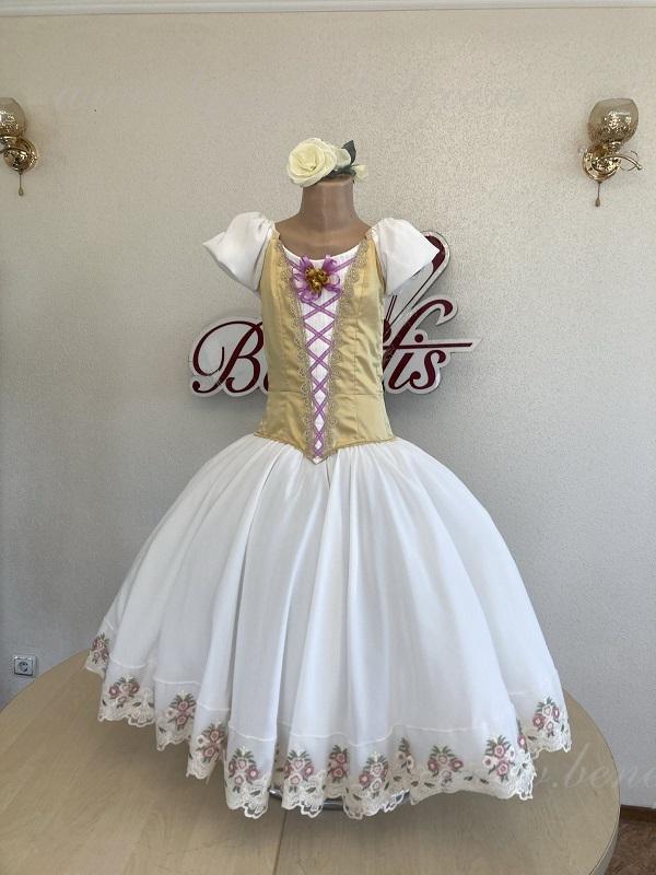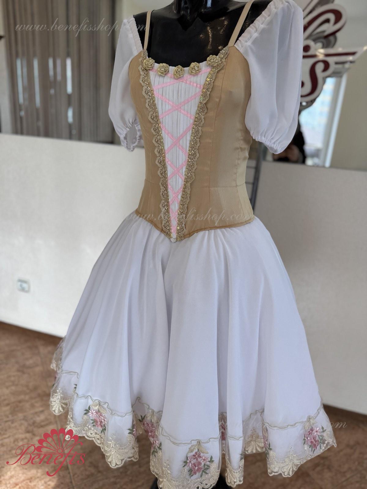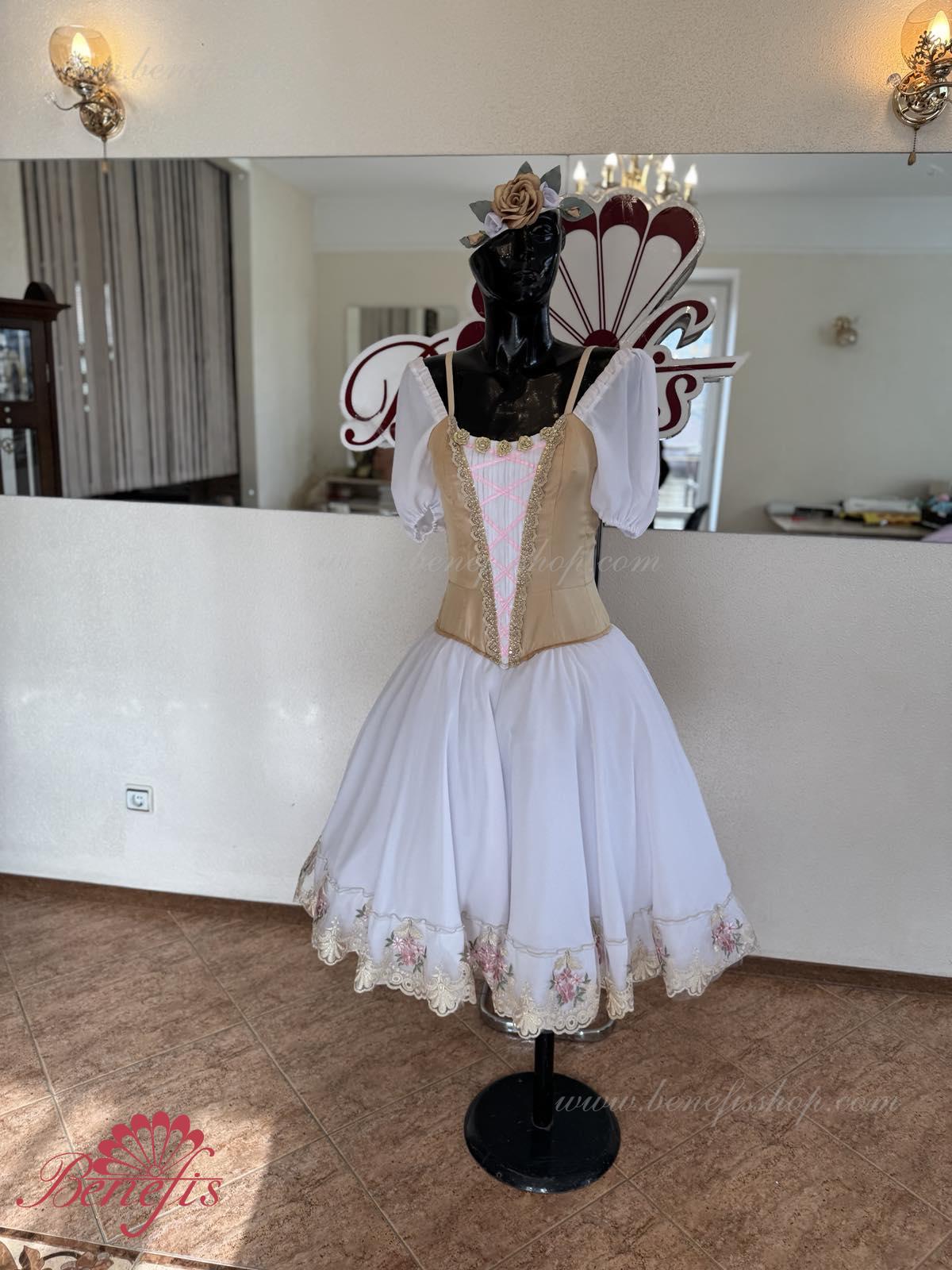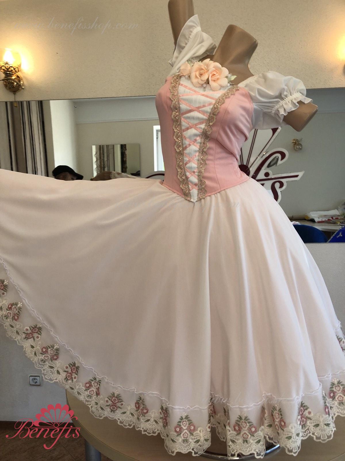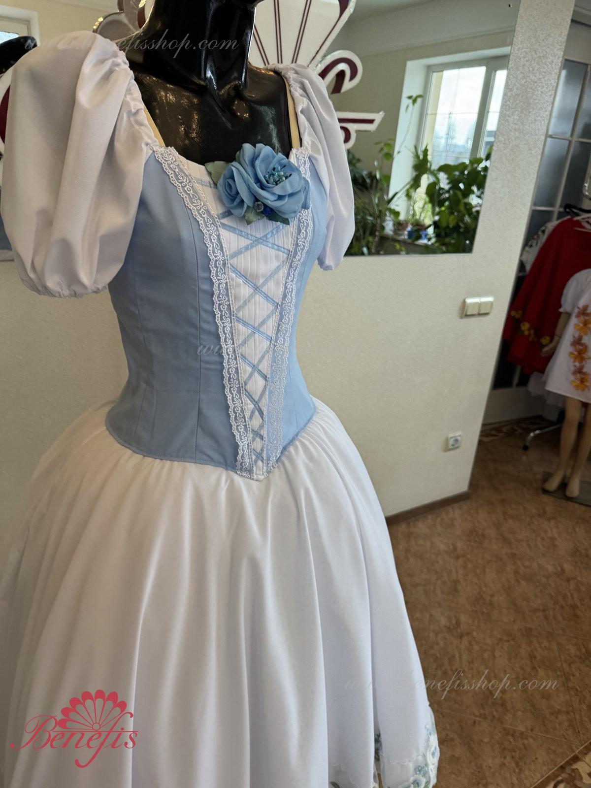 Сценический костюм выполнен на основе профессиональной романтической юбки состоящий из 3-х слоев фатина, которые покрываются легким шифоном с кружевом. Лиф выполняется из плотной ткани с декоративной шнуровкой спереди. Линия вставки по груди оторочена кружевом. Лиф застегивается на крючки в два ряда для удобного регулирования, а внутренний шнур служит для затягивания лифа в области груди. К телесным лямкам пришиты рукава-фонарики из шифона.