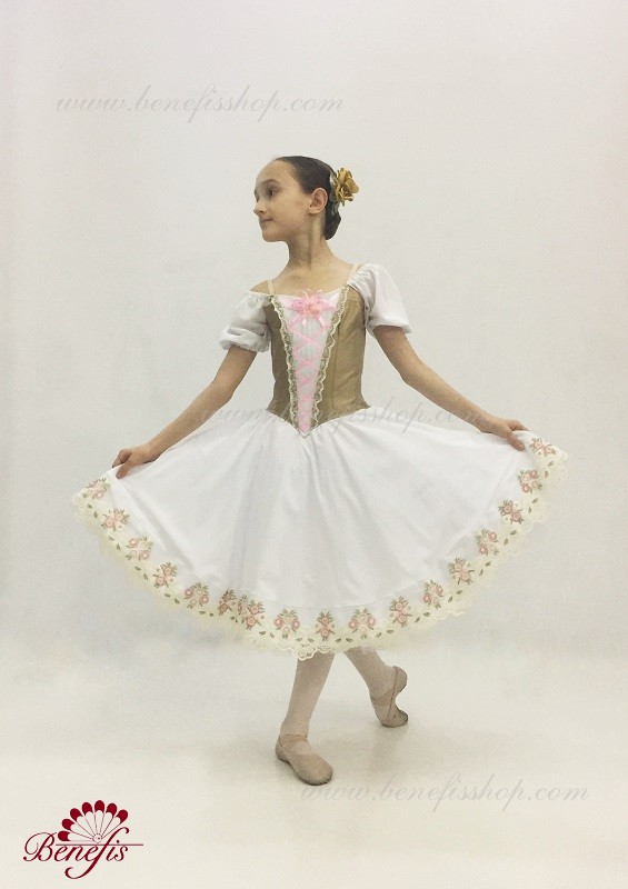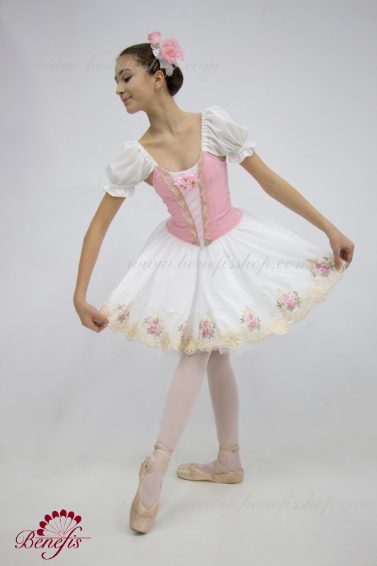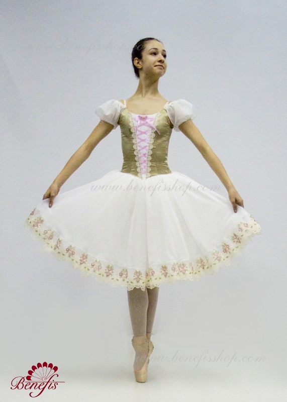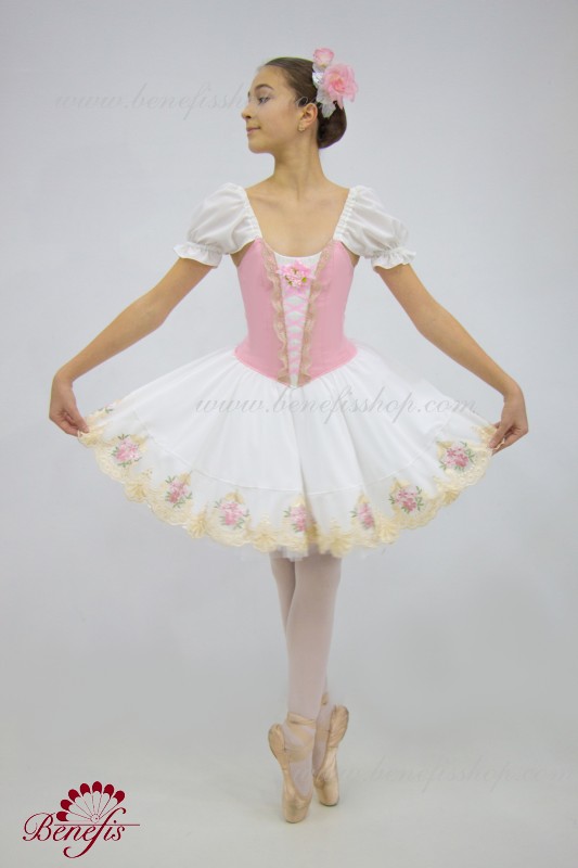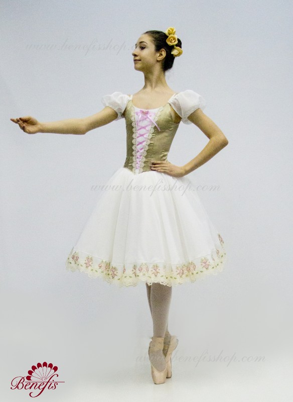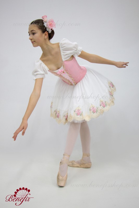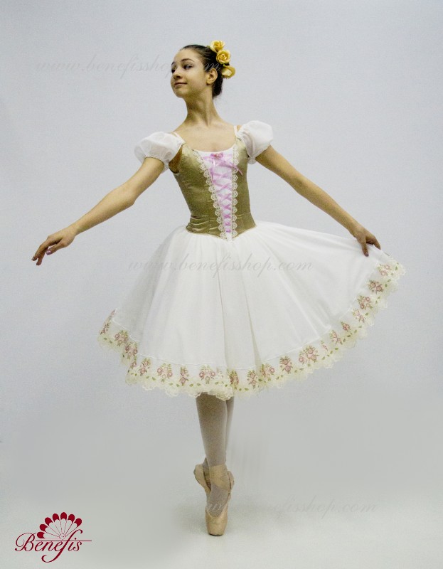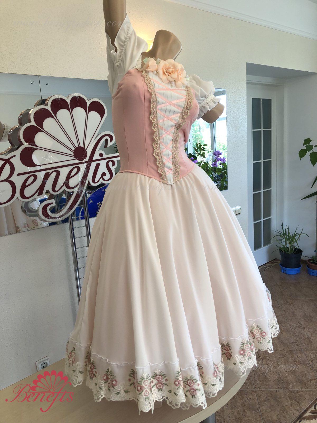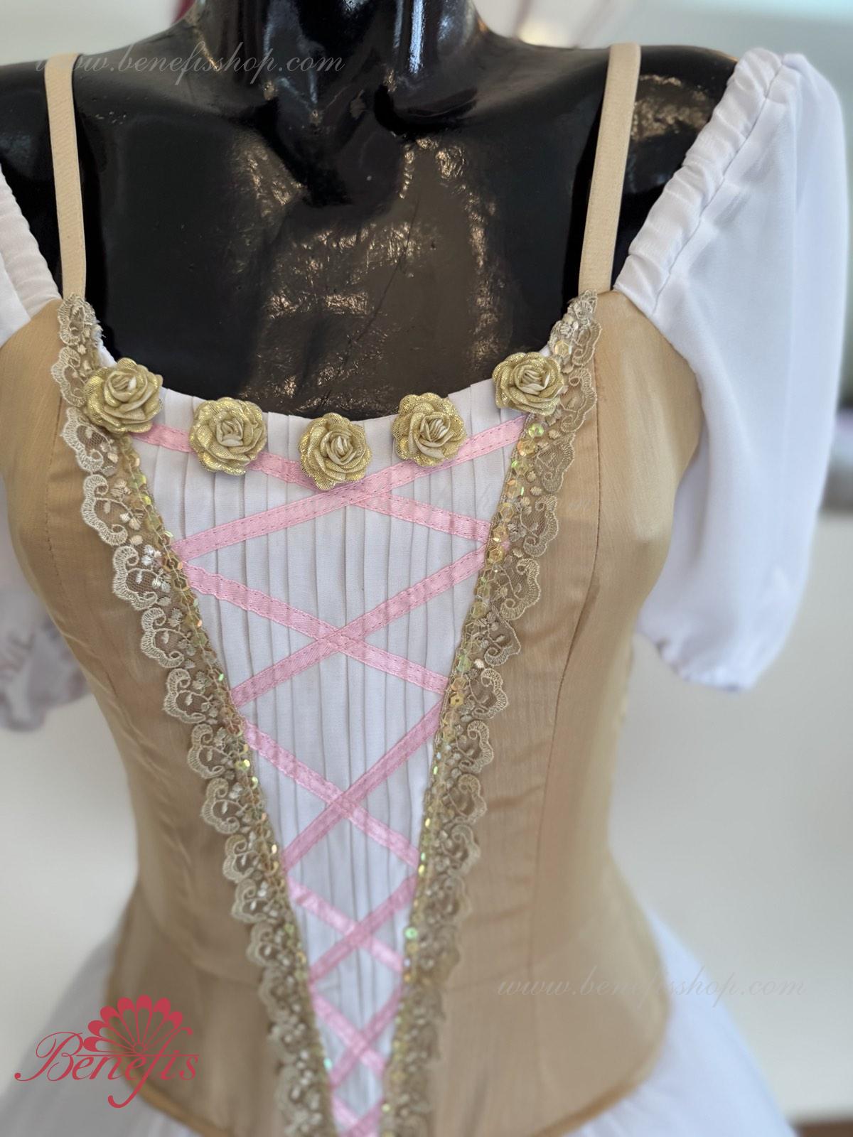 Сценический костюм выполнен на основе профессиональной романтической юбки состоящий из 3-х слоев фатина, которые покрываются легким шифоном с кружевом. Лиф выполняется из плотной ткани с декоративной шнуровкой спереди. Линия вставки по груди оторочена кружевом. Лиф застегивается на крючки в два ряда для удобного регулирования, а внутренний шнур служит для затягивания лифа в области груди. К телесным лямкам пришиты рукава-фонарики из шифона.