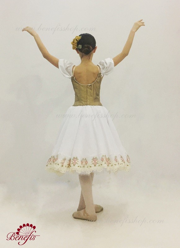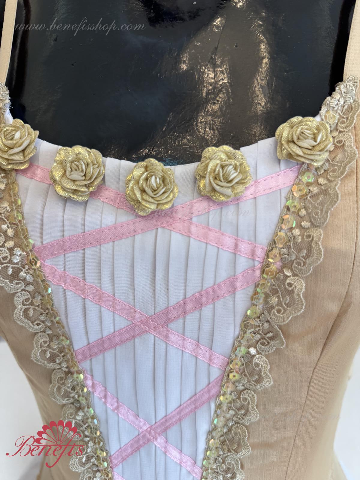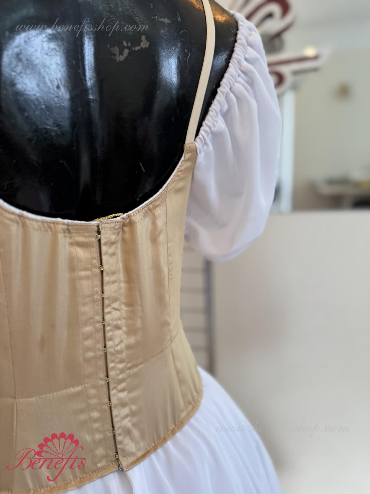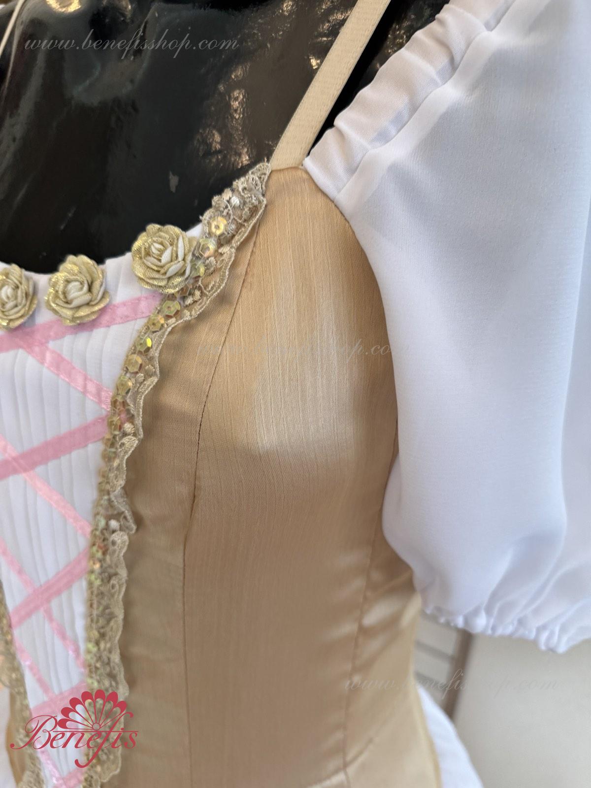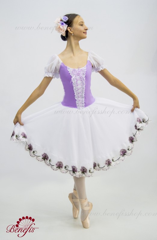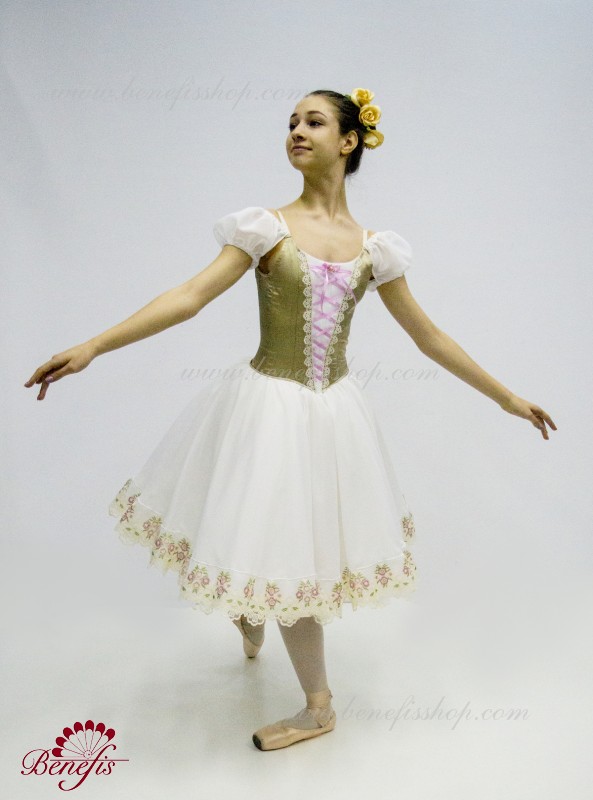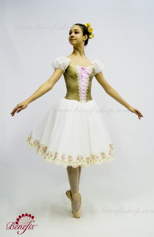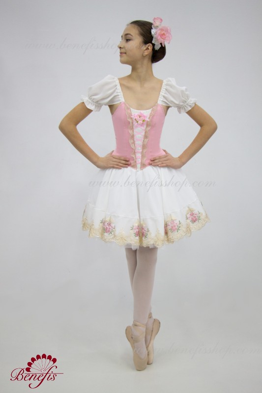 Сценический костюм выполнен на основе профессиональной романтической юбки состоящий из 3-х слоев фатина, которые покрываются легким шифоном с кружевом. Лиф выполняется из плотной ткани с декоративной шнуровкой спереди. Линия вставки по груди оторочена кружевом. Лиф застегивается на крючки в два ряда для удобного регулирования, а внутренний шнур служит для затягивания лифа в области груди. К телесным лямкам пришиты рукава-фонарики из шифона.