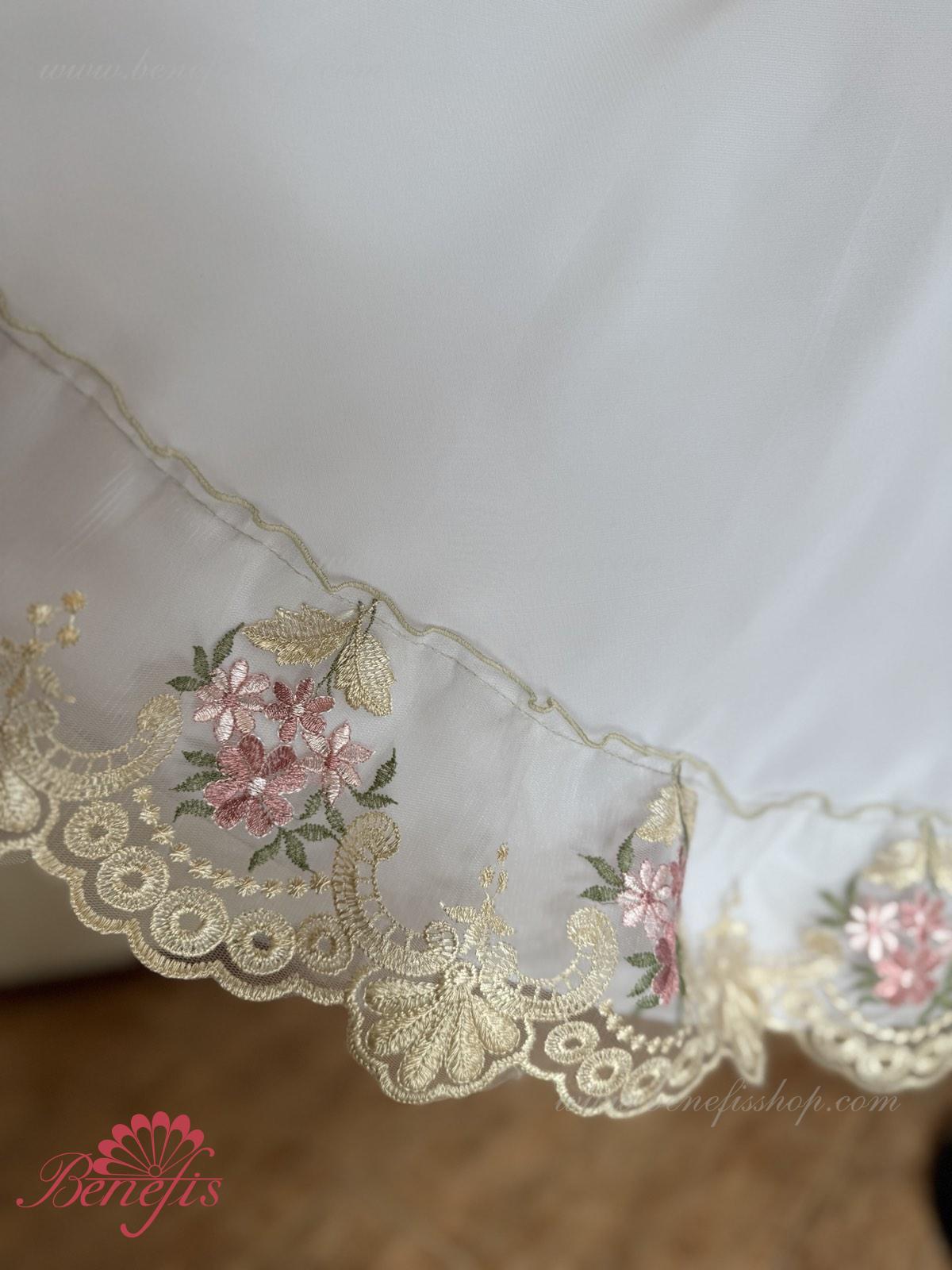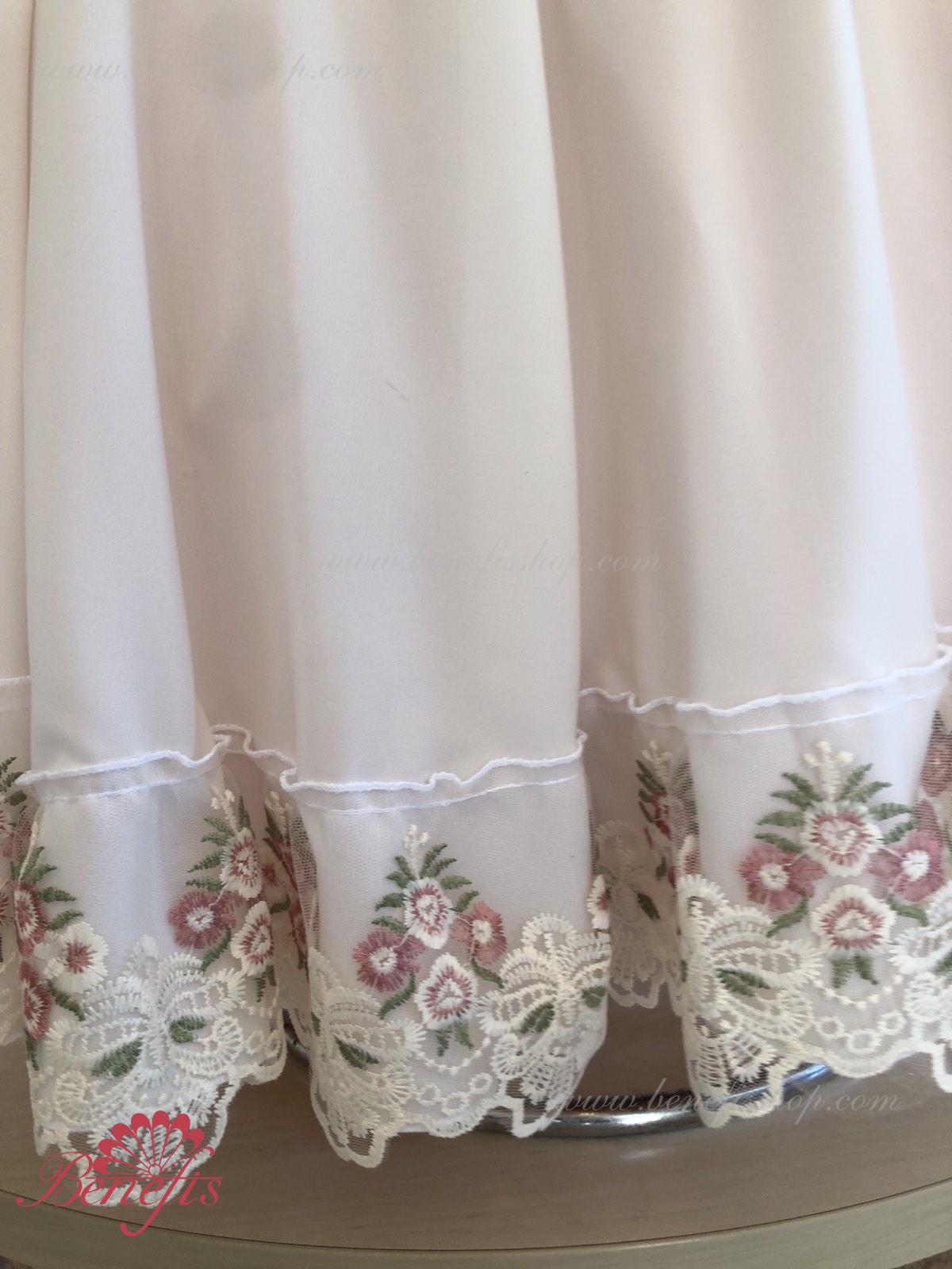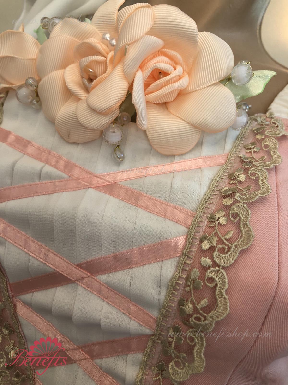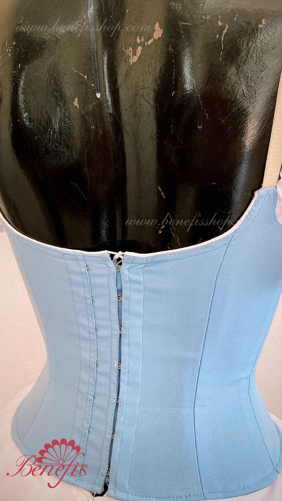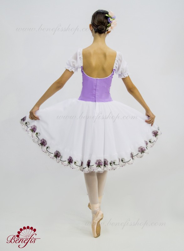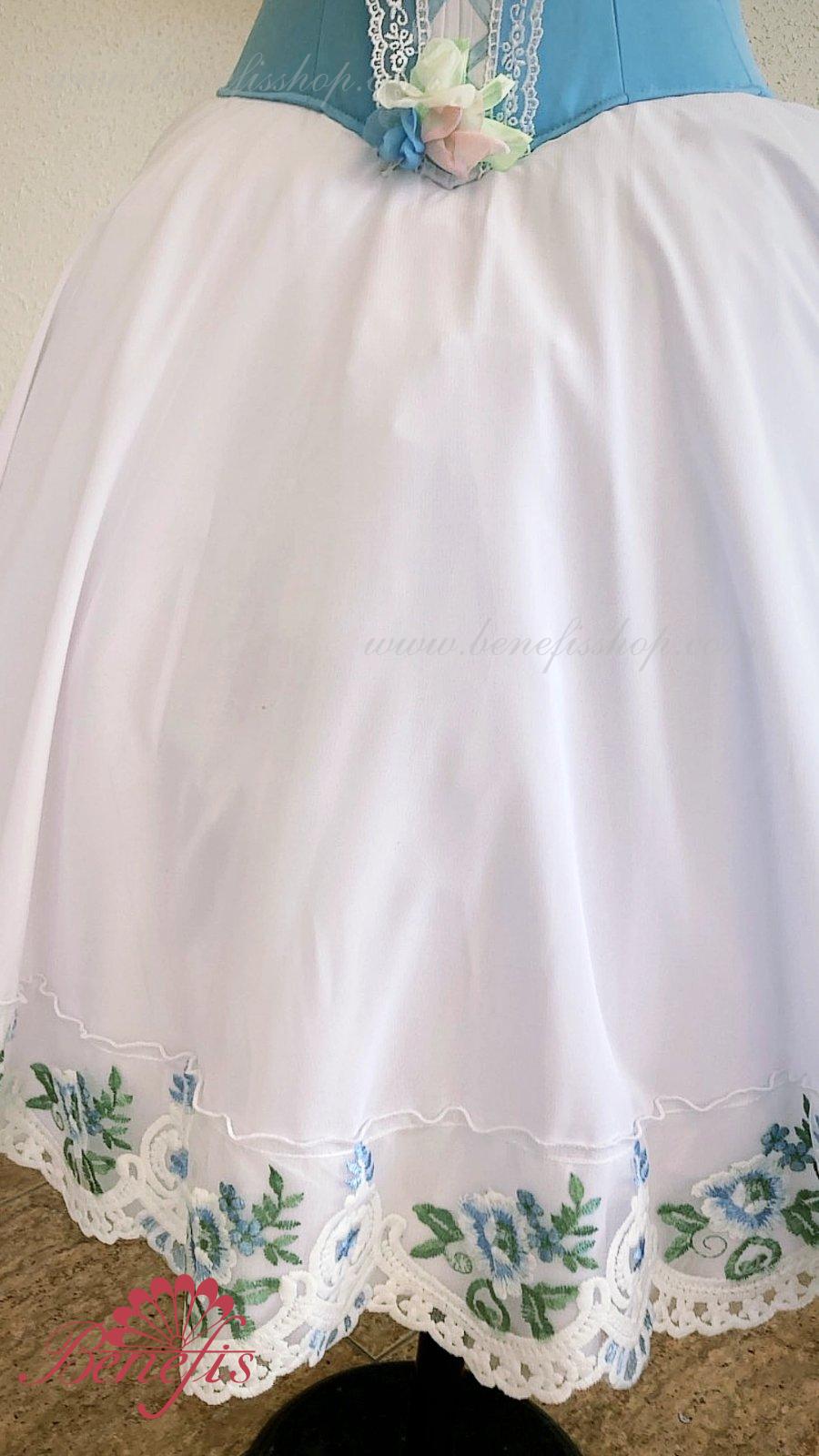 Сценический костюм выполнен на основе профессиональной романтической юбки состоящий из 3-х слоев фатина, которые покрываются легким шифоном с кружевом. Лиф выполняется из плотной ткани с декоративной шнуровкой спереди. Линия вставки по груди оторочена кружевом. Лиф застегивается на крючки в два ряда для удобного регулирования, а внутренний шнур служит для затягивания лифа в области груди. К телесным лямкам пришиты рукава-фонарики из шифона.