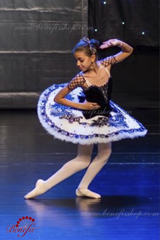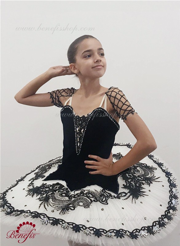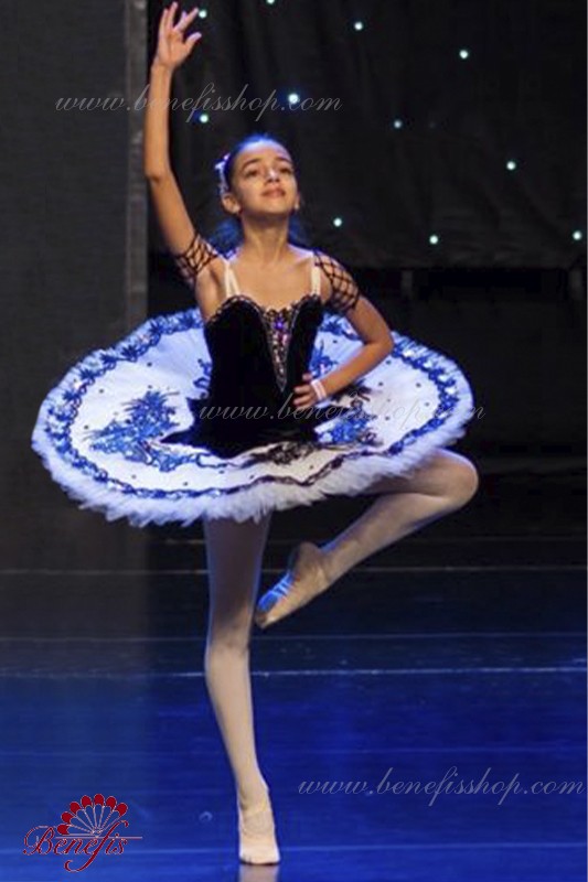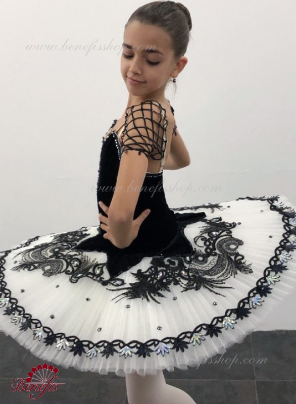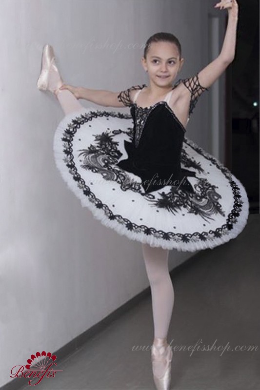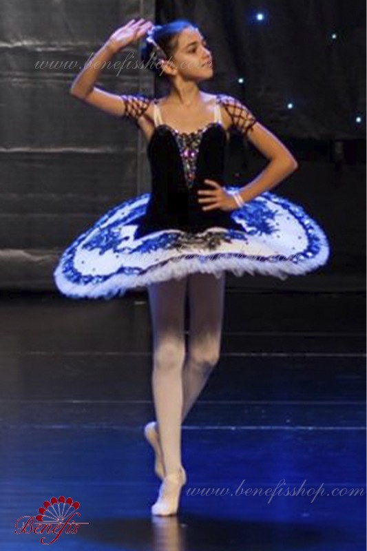 Детали: костюм, рукава. Этот профессиональный балетный сценический костюм выполнен на основе профессиональной базовой пачки # T 0001B(см. раздел «Базовые и репетиционные балетные пачки»). Лиф выполнен из бархата. Восемь плиссированных градуированных слоёв полумягкого тюля- семь длинных и один короткий на трусиках из тюля с 10 см кокеткой, прикрепленной к эластичному поясу. Два кринолиновых обруча внедрены в средний слой с двумя дополнительными короткими оборками по краям. Длина верхнего слоя - 36-38 см, каждый следующий слой на 4 см короче. Пачка застегивается сзади на 6 больших крючков и петелек. Рукава из резинки P0308.