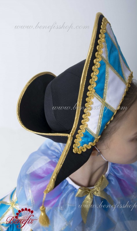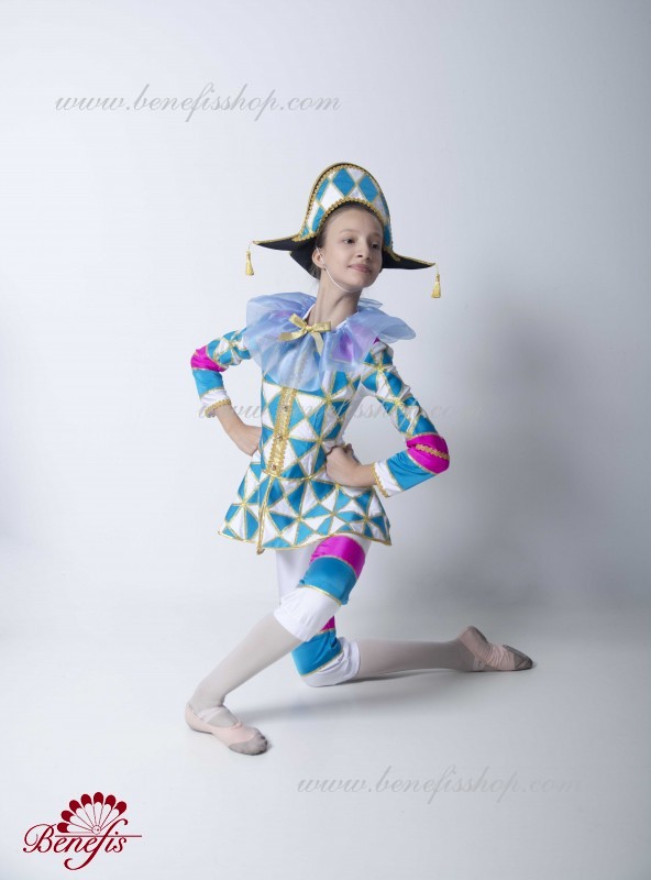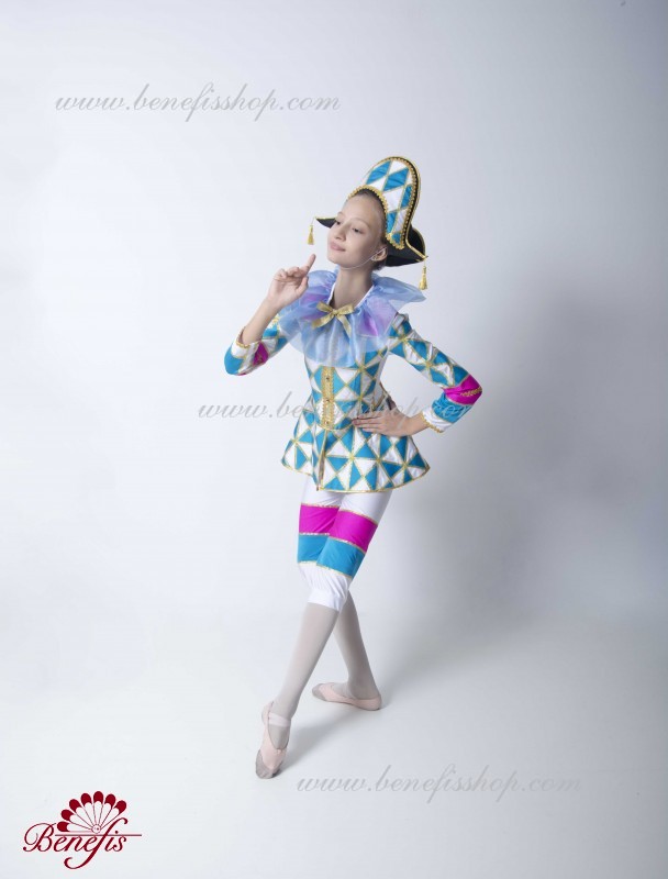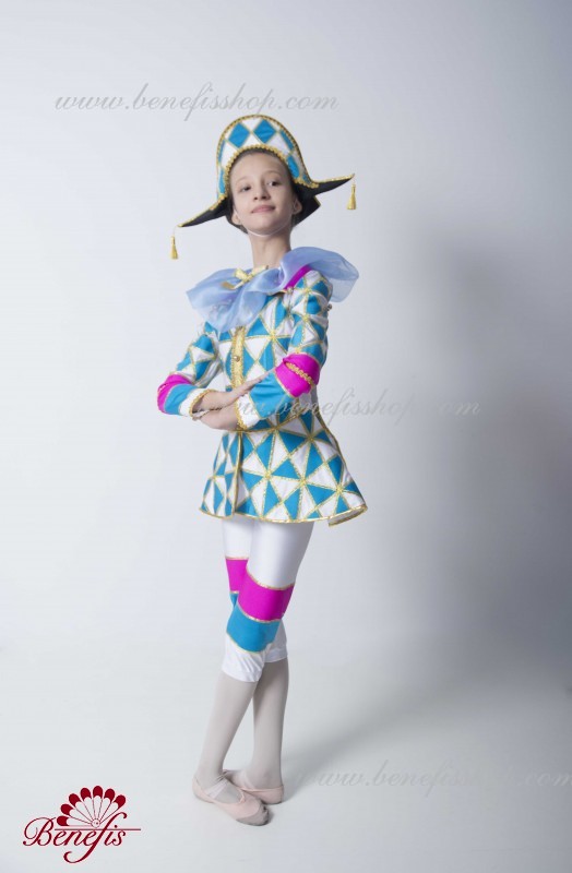 Этот профессиональный сценический костюм выполнен из эластичной ткани. Туника крепится на тыльной стороне одного ряда крючков. Воротник изготовлен из органзы. Костюм украшен треугольниками, отделанными золотой тесьмой и декоративными пуговицами. Бриджи выполнены из эластичной ткани с декоративными вставками 2-х цветов.