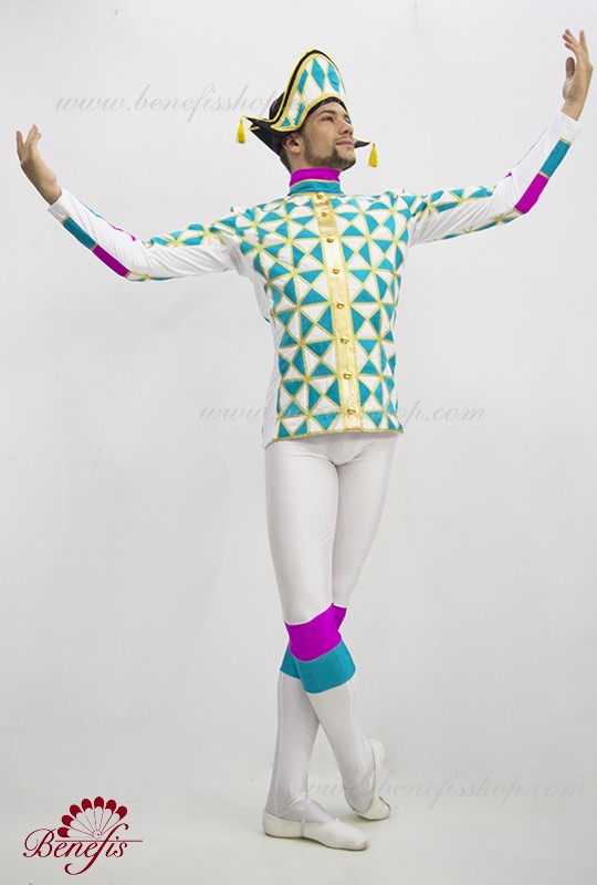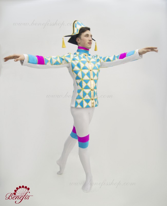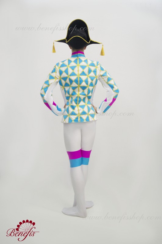 Этот профессиональный сценический костюм выполнен из эластичной ткани. Туника крепится на тыльной стороне одного ряда крючков. Воротник изготовлен из органзы. Костюм украшен треугольниками, отделанными золотой тесьмой и декоративными пуговицами. Бриджи выполнены из эластичной ткани с декоративными вставками 2-х цветов.