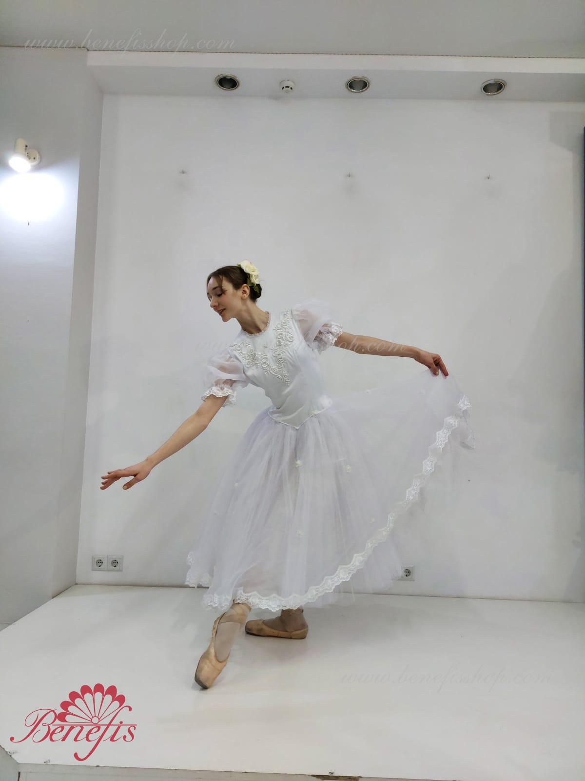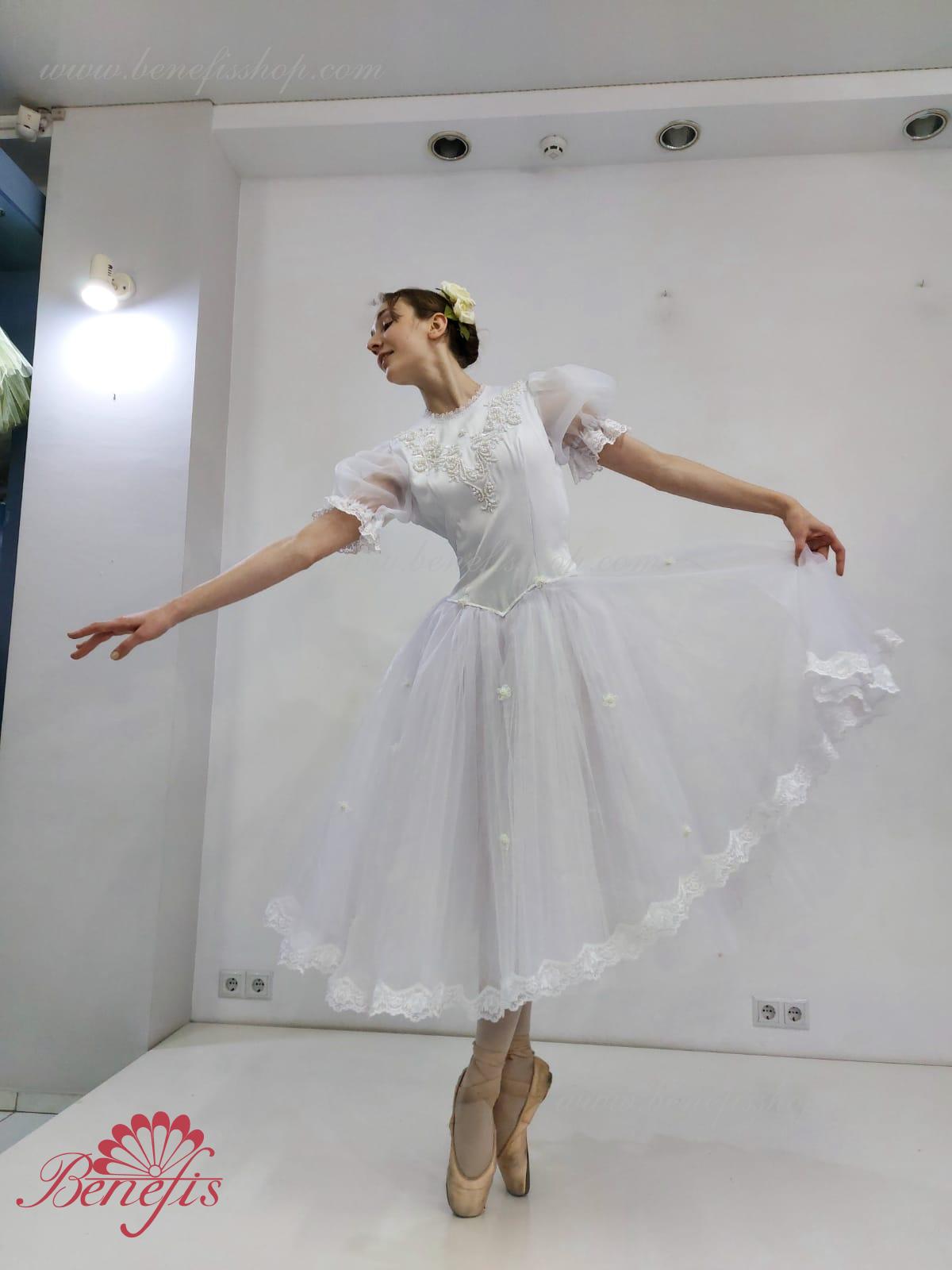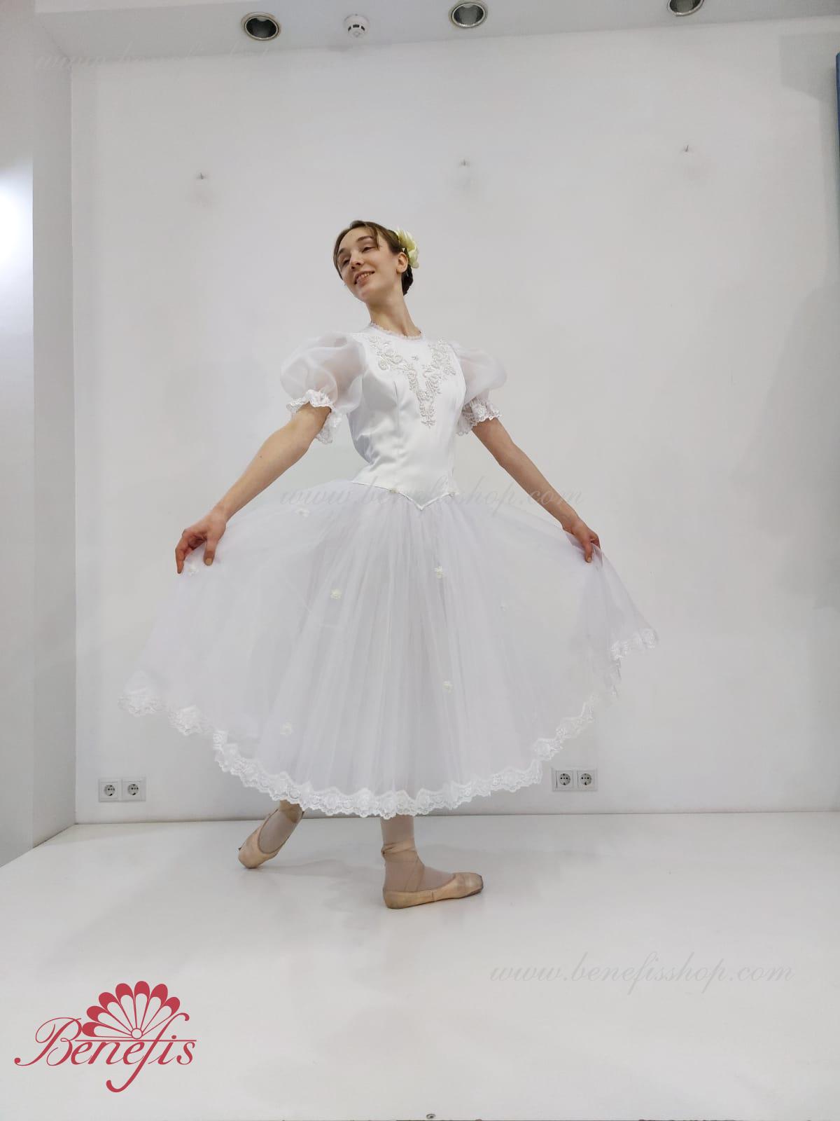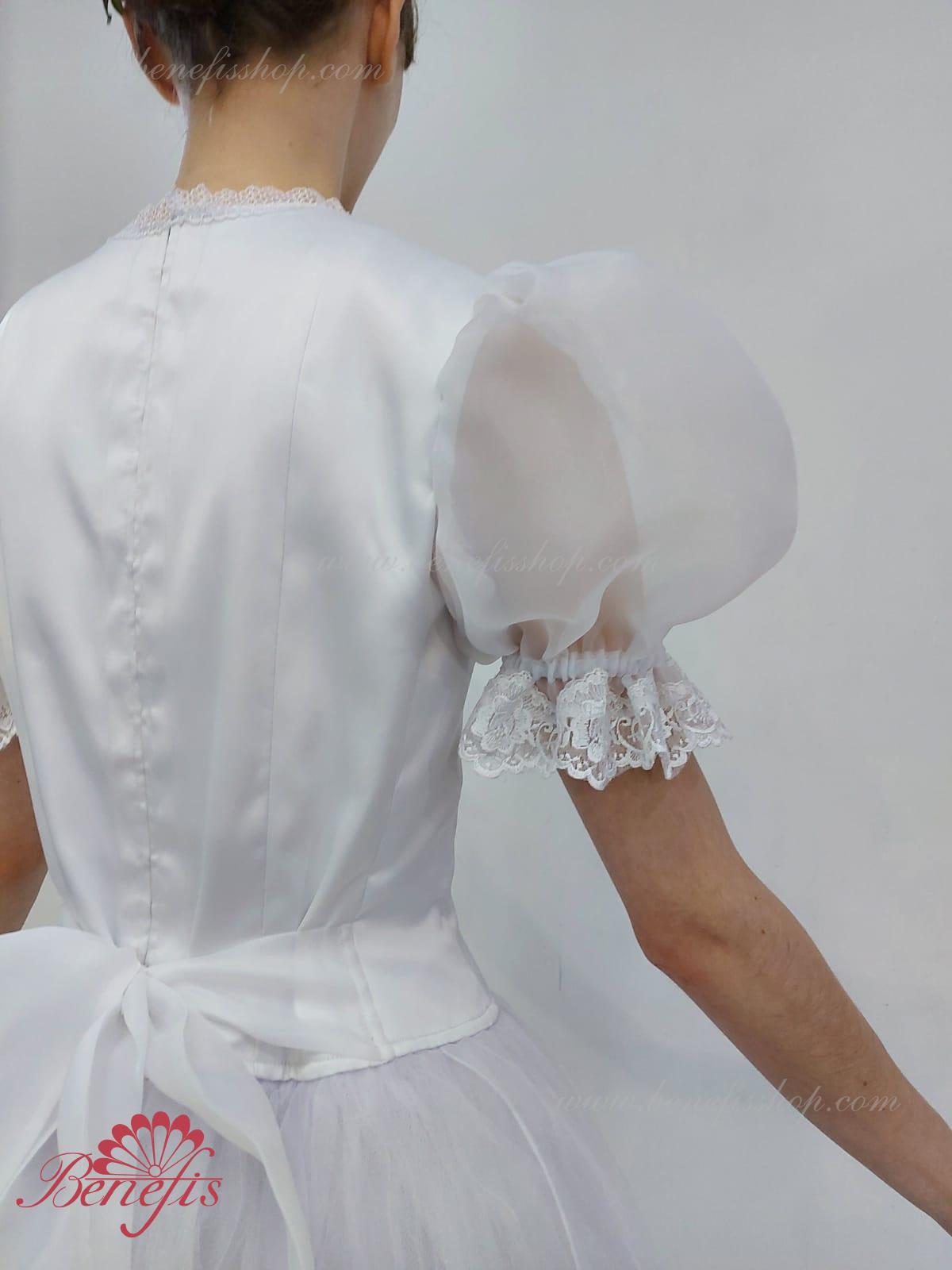 Лиф платья выполнен из плотной полу стрейчевой ткани, богато расшит аппликациями, бусинками, стразами и тесьмой. Юбка платья пошита из нескольких слоев мягкого и жесткого фатина. Верхний слой из легкой ткани украшен аппликациями в виде маленьких цветочков, и оторочен кружевами. Из той же ткани пошиты и рукавчики. К костюму прилагается кринолин.