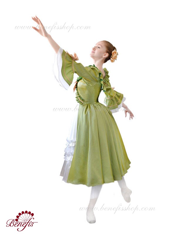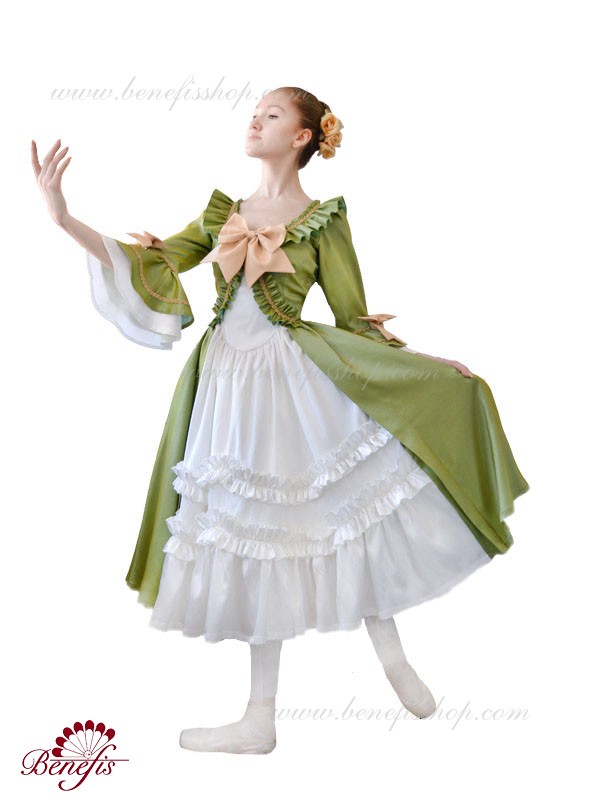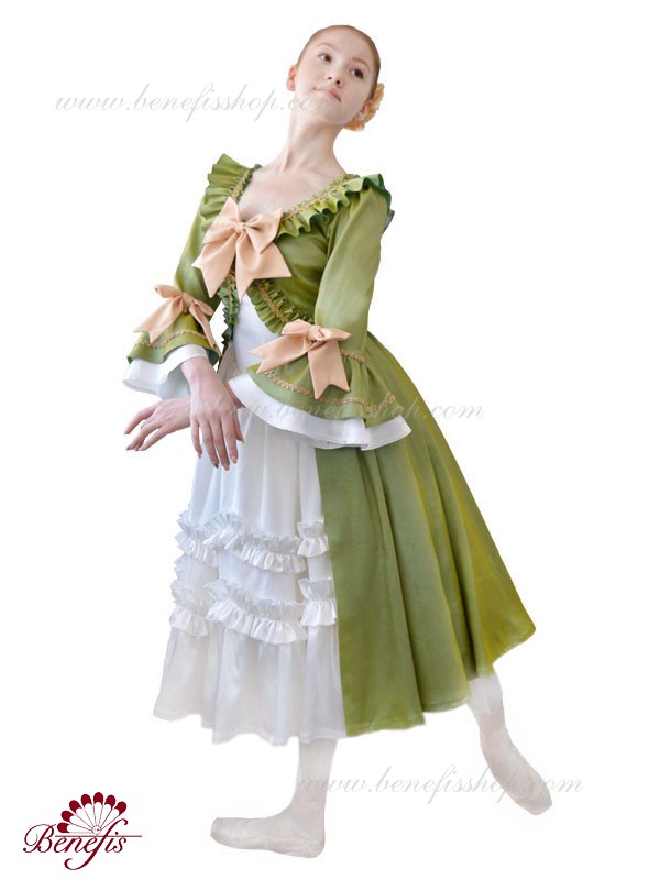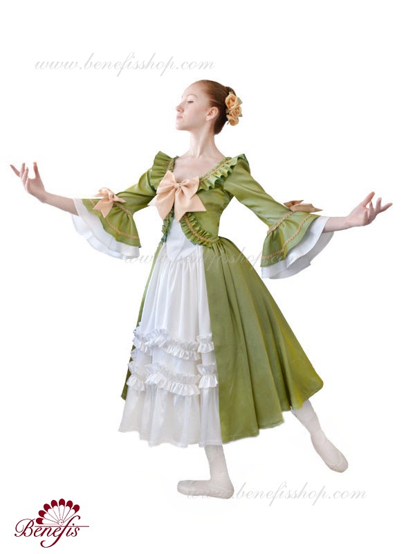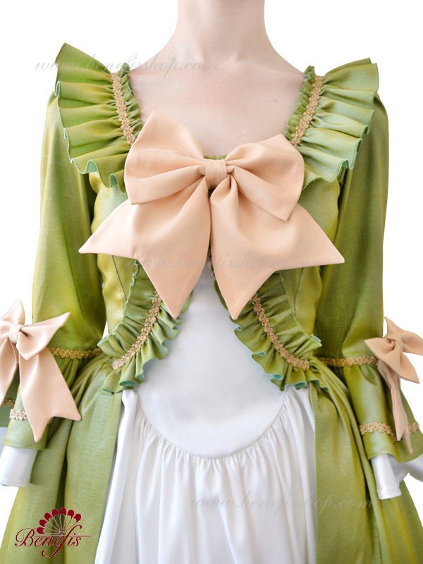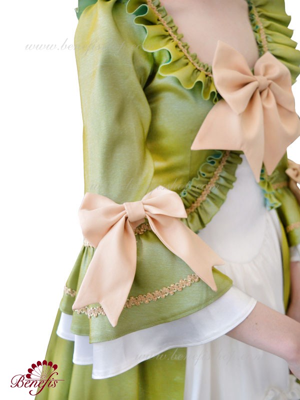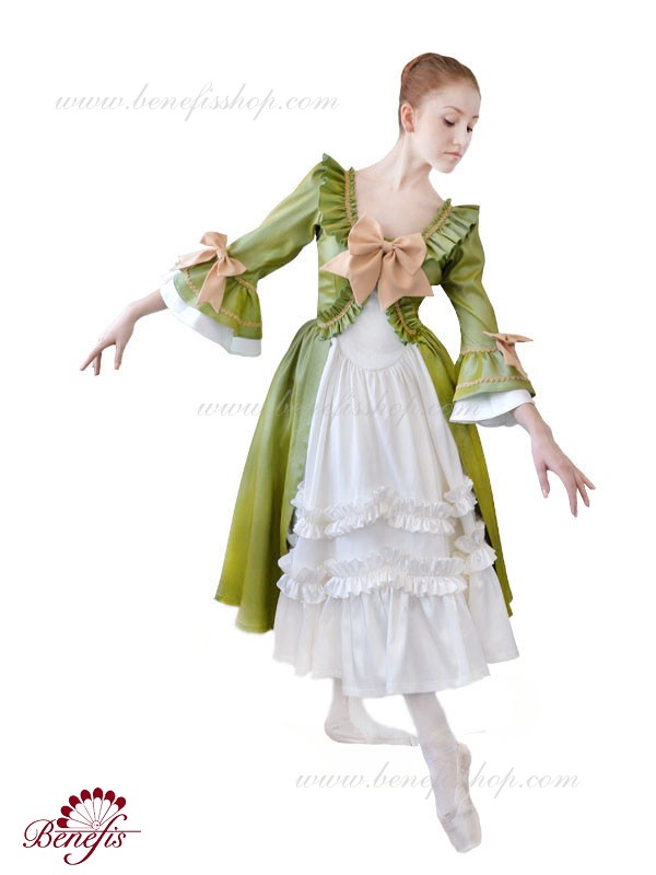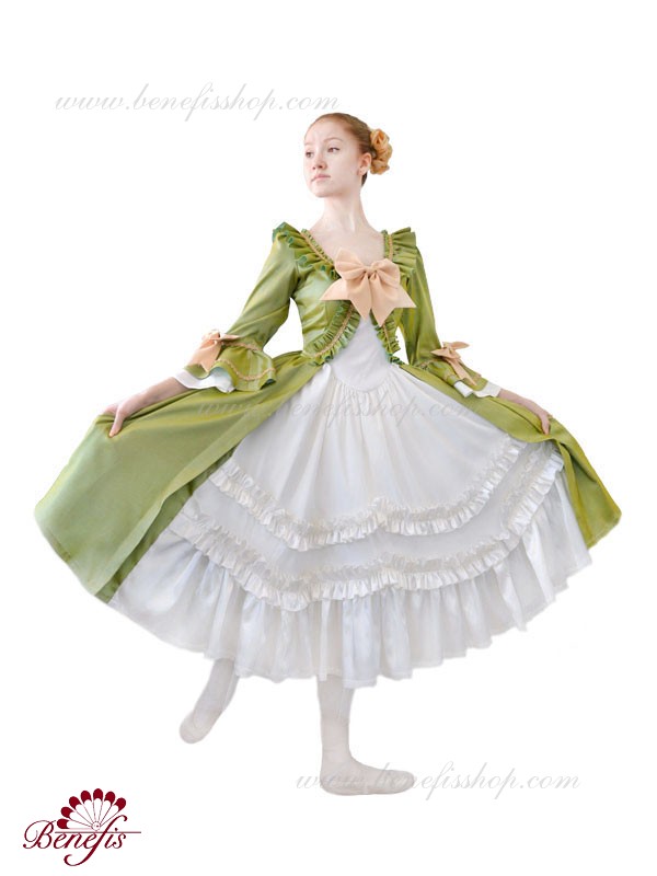 Платье состоит из полуэлостичной ткани (тафта), На передней части лифа используется декоративный большой бант. Лиф выполнен в имитации болеро. По краю болеро используется рюша. Застежка сзади с двумя рядами крючков.